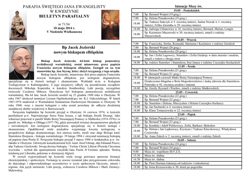 PARAFIA ŚWIĘTEGO JANA EWANGELISTY W KWIDZYNIE BIULETYN PARAFIALNY nr 71/36/ 18 maja 2014 r. V Niedziela Wielkanocna Bp Jacek Jezierski nowym biskupem elbląskim Intencje Mszy św. 7.00 7.00 18.00 18.00 18.00 7.00 7.00 18.00 18.00 Biskup Jacek Jezierski, 64-letni biskup pomocniczy archidiecezji warmińskiej, został mianowany przez papieża Franciszka nowym biskupem elbląskim. Zastąpił on na tym stanowisku bp. Jan Styrnę, który złożył rezygnację z tego urzędu. Biskup Jacek Jezierski, mianowany dziś przez papieża Franciszka nowym biskupem elbląskim, jest teologiem dogmatykiem, specjalizuje się w historii teologii i ekumenizmie. Wykładał m.in. w Kolegium Teologicznym w Kaliningradzie. Z jego inicjatywy odbyły się poszukiwania szczątków doczesnych Mikołaja Kopernika w katedrze fromborskiej. Lubi poezję, szczególnie twórczość Czesława Miłosza. Dotychczas był biskupem pomocniczym archidiecezji warmińskiej. Ma 64 lata. Jacek Jezierski urodził się 23 grudnia 1949 roku w Olsztynie. W roku 1967 ukończył tamtejsze Liceum Ogólnokształcące im. K.I. Gałczyńskiego. W latach 1967-1974 studiował w Warmińskim Seminarium Duchownym Hosianum w Olsztynie. W roku 1968, wraz z innymi kolegami z roku został powołany do odbycia dwuletniej zasadniczej służby wojskowej w Bartoszycach. Święcenia kapłańskie bp Jezierski przyjął w Olsztynie 16 czerwca 1974, w kościele parafialnym p.w. Najświętszego Serca Pana Jezusa, z rąk biskupa Józefa Drzazgi. Jako wikariusz pracował w parafii Matki Bożej Nieustającej Pomocy w Malborku (1974-1976) i w parafii św. Mikołaja w Elblągu (1977-78), gdzie prowadził również duszpasterstwo głuchych i niewidomych. Jest teologiem dogmatykiem, specjalizuje się w historii teologii i ekumenizmie. Opublikował wiele artykułów wyjaśniając kwestie teologiczne w perspektywie dialogu ekumenicznego. Jest znawcą osoby, myśli oraz sługi Bożego kard. Stanisława Hozjusza - biskupa warmińskiego. 19 lutego 1994 r. otrzymał nominację biskupią od papieża Jana Pawła II. Święcenia biskupie przyjął 5 marca 1994 w konkatedrze p.w. św. Jakuba w Olsztynie. Głównymi konsekratorami byli: kard. Józef Glemp, abp Edmund Piszcz, abp Tadeusz Gocłowski. Swoją dewizę biskupią - Veritas Christi Liberat (Prawda Chrystusa wyzwala) - wybrał dla upamiętnienia encykliki Jana Pawła II Veritatis splendor. Stolicą tytularną jest Liberalia, położona w dzisiejszej Algierii. W swoich wypowiedziach bp Jezierski wiele uwagi poświęca sprawom formacji chrześcijańskiej i społecznym. Formację tę zawsze rozumiał jako przygotowanie człowieka do dojrzałego i odpowiedzialnego uczestnictwa w życiu społecznym Ojczyzny, miasta i regionu. Zna język niemiecki. Lubi poezję, zwłaszcza Czesława Miłosza i Marii ZientaryMalewskiej. 18.00 7.00 7.00 18.00 18.00 18.00 7.00 7.00 18.00 18.00 18.00 7.00 7.00 18.00 18.00 18.00 7.00 7.00 9.00 15.30 16.30 18.00 18.00 19.05 – Poniedziałek Śp. Bernard Wojtaś (19 greg.) Śp. Helena Prusakowska (19 greg.) Śp. Tadeusz Sańczyk w 5. rocznicę śmierci, Janina Nowak w 1. rocznicę śmierci, Feliks Zaremba w 29. rocznicę śmierci Śp. Jadwiga Urbanowicz w 16. rocznicę śmierci, Bernard, Marian, Longin Śp. Kazimierz Maszewski w 30. rocznicę śmierci, zmarli z rodziny Maszewskich 20.05 – Wtorek Śp. Franciszka, Stefan, Romuald, Marianna i Kazimierz z rodziny Górskich Śp. Bernard Wojtaś (20 greg.) Śp. Helena Prusakowska (20 greg.) Śp. Jan i Zofia Lagowscy, Stanisław i Zofia Giedrojc w dniu imienin i urodzin, zmarli z rodzin z obojga stron Śp. rodzice Stanisław i Stanisława, brat Janusz z rodziny Czeszejko-Sochackich 21.05 – Środa Śp. Helena Prusakowska (21 greg.) Śp. Bernard Wojtaś (21 greg.) W intencjach czcicieli Matki Bożej Nieustającej Pomocy Dziękczynno-błagalna o Boże błogosławieństwo i łaskę zdrowia dla Stanisława Pietrzaka w 92. rocznicę urodzin i imienin Śp. Józefa, Ryszard i Wacław, zmarli z rodziny Mańkowskich 22.05 – Czwartek Śp. Helena Prusakowska (22 greg.) Śp. Bernard Wojtaś (22 greg.) Śp. Stanisław i Helena, Mieczysław i Helena Czeszejko-Sochaccy Śp. Jan Sucharski w 4. rocznicę śmierci Śp. Klara Tomaszewska w 22. rocznicę śmierci 23.05 – Piątek Śp. Helena Prusakowska (23 greg.) Śp. Bernard Wojtaś (23 greg.) Śp. Kordula i Adolf Piórkowscy, Zofia, Barbara i Bolesław Śp. Helena i Jan Lepkowscy, Krystyna i Tadeusz Kluczkowscy, Władysława Czyżewska Śp. Anna Zalech w 2. rocznicę śmierci, zmarli z rodziny Zalech 24.05 – Sobota Śp. Helena Prusakowska (24 greg.) Śp. Bernard Wojtaś (24 greg.) Msza św. wspólnoty III F.Z.Ś. Msza św. ślubna Msza św. ślubna Śp. Piotr Durman (intencja od rodziców i rodzeństwa) Śp. Irena Krzeszewska w 30. dzień po pogrzebie 7.30 7.30 9.30 9.30 11.00 11.00 12.30 12.30 18.00 25.05 –VI Niedziela Wielkanocna O Boże błogosławieństwo, zdrowie i potrzebne łaski dla Wandy Talarskiej 98. rocznicę urodzin Śp. Helena Prusakowska (25 greg.) Śp. Wiktor Mierzejewski, Wanda i Leonard Tkaczyk Śp. Leonard Arest, Stanisław i Marek Barejko Śp. Marianna i Stanisław Przybyś, zmarli z rodziny Śp. Janina w 1. rocznicę śmierci i Józef Stasińscy, Jan Chmiel w 3. rocznicę śmierci W intencji Parafian Śp. Alfreda Rogman z okazji dnia matki Śp. Bernard Wojtaś (25 greg.) Ogłoszenia duszpasterskie 1. Przez cały miesiąc zapraszamy na godz. 17 na nabożeństwo majowe. 2. W naszej parafii trwa „biały tydzień” dzieci, którzy w dniu wczorajszym po raz 30 pierwszy w pełni uczestniczyli we Mszy św. W czasie trwania „białego tygodnia” wszystkie dzieci spotykają się o godz. 1800 na Mszy św. Zdjęcia grupowe w naszej katedrze będą robione we wtorek po Mszy św. Spotkanie rodziców i dzieci wyjeżdżających w najbliższy piątek na pielgrzymkę do Gietrzwałdu również we wtorek po Mszy św. 00 3. W następną niedzielę o godz. 11 będzie Rocznica I Komunii Świętej. 4. Z rado