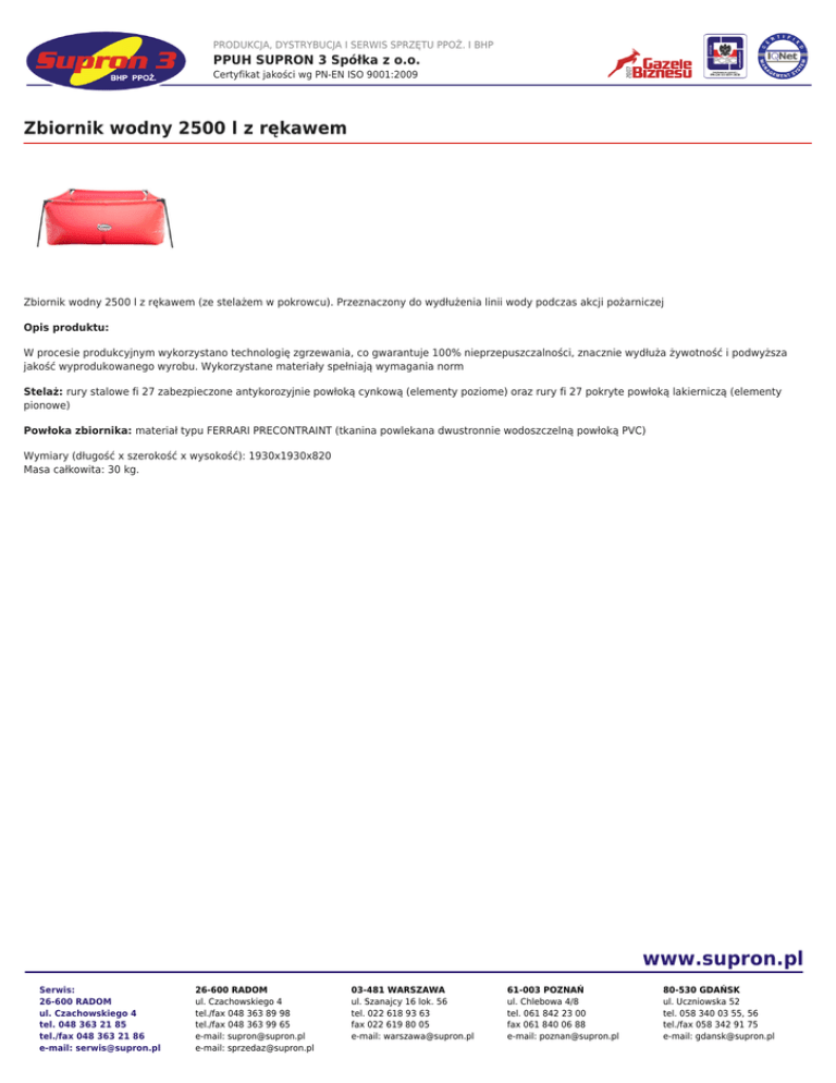 PRODUKCJA, DYSTRYBUCJA I SERWIS SPRZĘTU PPOŻ. I BHP PPUH SUPRON 3 Spółka z o.o. Certyfikat jakości wg PN-EN ISO 9001:2009 Zbiornik wodny 2500 l z rękawem Zbiornik wodny 2500 l z rękawem (ze stelażem w pokrowcu). Przeznaczony do wydłużenia linii wody podczas akcji pożarniczej Opis produktu: W procesie produkcyjnym wykorzystano technologię zgrzewania, co gwarantuje 100% nieprzepuszczalności, znacznie wydłuża żywotność i podwyższa jakość wyprodukowanego wyrobu. Wykorzystane materiały spełniają wymagania norm Stelaż: rury stalowe fi 27 zabezpieczone antykorozyjnie powłoką cynkową (elementy poziome) oraz rury fi 27 pokryte powłoką lakierniczą (elementy pionowe) Powłoka zbiornika: materiał typu FERRARI PRECONTRAINT (tkanina powlekana dwustronnie wodoszczelną powłoką PVC) Wymiary (długość x szerokość x wysokość): 1930x1930x820 Masa całkowita: 30 kg. www.supron.pl Serwis: 26-600 RADOM ul. Czachowskiego 4 tel. 048 363 21 85 tel./fax 048 363 21 86 e-mail: [email protected] 26-600 RADOM ul. Czachowskiego 4 tel./fax 048 363 89 98 tel./fax 048 363 99 65 e-mail: [email protected] e-mail: [email protected] 03-481 WARSZAWA ul. Szanajcy 16 lok. 56 tel. 022 618 93 63 fax 022 619 80 05 e-mail: [email protected] 61-003 POZNAŃ ul. Chlebowa 4/8 tel. 061 842 23 00 fax 061 840 06 88 e-mail: [email protected] 80-530 GDAŃSK ul. Uczniowska 52 tel. 058 340 03 55, 56 tel./fax 058 342 91 75 e-mail: [email protected]