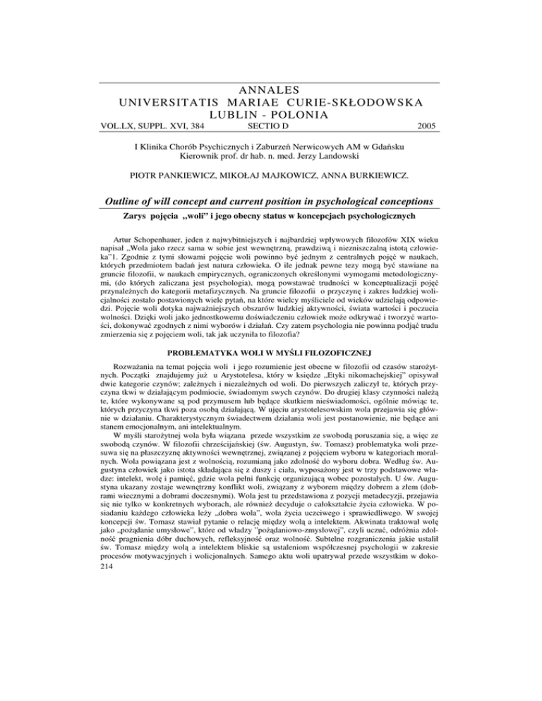 ANNALES UNIVERSITATIS MARIAE CURIE-SKŁODOWSKA LUBLIN - POLONIA VOL.LX, SUPPL. XVI, 384 SECTIO D 2005 I Klinika Chorób Psychicznych i Zaburzeń Nerwicowych AM w Gdańsku Kierownik prof. dr hab. n. med. Jerzy Landowski PIOTR PANKIEWICZ, MIKOŁAJ MAJKOWICZ, ANNA BURKIEWICZ. Outline of will concept and current position in psychological conceptions Zarys pojęcia „woli” i jego obecny status w koncepcjach psychologicznych Artur Schopenhauer, jeden z najwybitniejszych i najbardziej wpływowych filozofów XIX wieku napisał „Wola jako rzecz sama w sobie jest wewnętrzną, prawdziwą i niezniszczalną istotą człowieka”1. Zgodnie z tymi słowami pojęcie woli powinno być jednym z centralnych pojęć w naukach, których przedmiotem badań jest natura człowieka. O ile jednak pewne tezy mogą być stawiane na gruncie filozofii, w naukach empirycznych, ograniczonych określonymi wymogami metodologicznymi, (do których zaliczana jest psychologia), mogą powstawać trudności w konceptualizacji pojęć przynależnych do kategorii metafizycznych. Na gruncie filozofii o przyczynę i zakres ludzkiej wolicjalności zostało postawionych wiele pytań, na które wielcy myśliciele od wieków udzielają odpowiedzi. Pojęcie woli dotyka najważniejszych obszarów ludzkiej aktywności, świata wartości i poczucia wolności. Dzięki woli jako jednostkowemu doświadczeniu człowiek może odkrywać i tworzyć wartości, dokonywać zgodnych z nimi wyborów i działań. Czy zatem psychologia nie powinna podjąć trudu zmierzenia się z pojęciem woli, tak jak uczyniła to filozofia? PROBLEMATYKA WOLI W MYŚLI FILOZOFICZNEJ Rozważania na temat pojęcia woli i jego rozumienie jest obecne w filozofii od czasów starożytnych. Początki znajdujemy już u Arystotelesa, który w księdze „Etyki nikomachejskiej” opisywał dwie kategorie czynów; zależnych i niezależnych od woli. Do pierwszych zaliczył te, których przyczyna tkwi w działającym podmiocie, świadomym swych czynów. Do drugiej klasy czynności należą te, które wykonywane są pod przymusem lub będące skutkiem nieświadomości, ogólnie mówiąc te, których przyczyna tkwi poza osobą działającą. W ujęciu arystotelesowskim wola przejawia się głównie w działaniu. Charakterystycznym świadectwem działania woli jest postanowienie, nie będące ani stanem emocjonalnym, ani intelektualnym. W myśli starożytnej wola była wiązana przede wszystkim ze swobodą poruszania się, a więc ze swobodą czynów. W filozofii chrześcijańskiej (św. Augustyn, św. Tomasz) problematyka woli przesuwa się na płaszczyznę aktywności wewnętrznej, związanej z pojęciem wyboru w kategoriach moralnych. Wola powiązana jest z wolnością, rozumianą jako zdolność do wyboru dobra. Według św. Augustyna człowiek jako istota składająca się z duszy i ciała, wyposażony jest w trzy podstawowe władze: intelekt, wolę i pamięć, gdzie wola pełni funkcję organizującą wobec pozostałych. U św. Augustyna ukazany zostaje wewnętrzny konflikt woli, związany z wyborem między dobrem a złem (dobrami wiecznymi a dobrami doczesnymi). Wola jest tu przedstawiona z pozycji metadecyzji, przejawia się nie tylko w konkretnych wyborach, ale również decyduje o całokształcie życia człowieka. W posiadaniu każdego człowieka leży „dobra wola”, wola życia uczciwego i sprawiedliwego. W swojej koncepcji św. Tomasz stawiał pytanie o relację między wolą a intelektem. Akwinata traktował wolę jako „pożądanie umysłowe”, które od władzy ”pożądaniowo-zmysłowej”, czyli uczuć, odróżnia zdolność pragnienia dóbr duchowych, refleksyjność oraz wolność. Subtelne rozgraniczenia jakie ustalił św. Tomasz między wolą a intelektem bliskie są ustaleniom współczesnej psychologii w zakresie procesów motywacyjnych i wolicjonalnych. Samego aktu woli upatrywał przede wszystkim w doko214 nywanym przez człowieka wyborze. Z tym związany jest problem i wolności takich aktów woli. Św. Tomasz uznawał, że wprawdzie wolność człowieka jest ograniczona ale pozbawienie jednostki wolności dokonywania aktów woli pozbawia go statusu istoty ludzkiej. Istotnym znamieniem wolności jest zdolność wyboru. Zupełnie odmienne stanowisko prezentował B. Spinoza. Głosząca determinizm doktryna Spinozy przedstawia ludzkie poczucie wolności jako złudzenie, wynikające z nieznajomości przez ludzi przyczyn swoich pragnień. Jedyna wolność jaka człowiekowi jest dostępna to wolność etyczna, rozumiana jako postawa jaką człowiek może zająć wobec istnienia warunków koniecznych. Wola w ujęciu Spinozy utożsamiana jest z rozumem, człowiek może być wolny jedynie kierując się intelektem, który opanowuje namiętności i wzruszenia. Te poglądy znajdują odniesienie w badaniach dotyczących samokontroli emocjonalnej, a również tych, które dotyczą kontroli przebiegu działania. Przełom w filozoficznym rozumieniu pojęcia woli pojawia się ponownie w rozważaniach I. Kanta, A. Schopenhauera, F. Nitschego. Etyka autonomicznej, prawodawczej woli wprowadzona przez Kanta związana jest ze zdolnością człowieka do opowiadania się po stronie dobra. Pojęcie wolności człowieka natomiast związane jest z ponoszoną przez jednostkę odpowiedzialnością za podejmowane decyzje. Dla określenia tego rodzaju woli użył formuły wprowadzonego przez siebie imperatywu kategorycznego, co odnalazło odzwierciedlenie we współczesnych koncepcjach psychologii egzystencjalnej. Pojęciu woli nadał Schopenhauer znaczenie podstawowe, interesowały go zagadnienia zależności woli od charakteru, motywów, poznania. Wyróżnił trzy podstawowe kategorie wolności u człowieka: fizyczną ( brak przeszkód materialnych w działaniu), moralną ( zdolność do wyborów moralnych) i intelektualną ( zdolność do percepcji niezafałszowanego obrazu rzeczywistości). Poprzez wolę natomiast, człowiek uświadamia sobie własne „ja”, a podsta