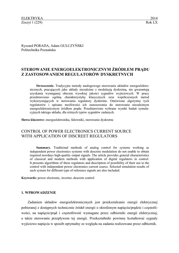 ELEKTRYKA Zeszyt 1 (229) 2014 Rok LX Ryszard PORADA, Adam GULCZYŃSKI Politechnika Poznańska STEROWANIE ENERGOELEKTRONICZNYM ŹRÓDŁEM PRĄDU Z ZASTOSOWANIEM REGULATORÓW DYSKRETNYCH Streszczenie. Tradycyjne metody analogowego sterowania układów energoelektronicznych, pracujących jako układy niezależne z modulacją dyskretną, nie gwarantują uzyskania wymaganej obecnie wysokiej jakości sygnałów wyjściowych. W pracy przedstawiono ogólną charakterystykę klasycznych oraz współczesnych metod wykorzystujących w sterowaniu regulatory dyskretne. Omówiono algorytmy tych regulatorów i opisano możliwości ich zastosowania do sterowania niezależnym energoelektronicznym źródłem prądu. Przedstawiono wybrane wyniki badań symulacyjnych takiego układu, dla różnych typów sygnałów zadanych. Słowa kluczowe: energoelektronika, falowniki, sterowanie dyskretne CONTROL OF POWER ELECTRONICS CURRENT SOURCE WITH APPLICATION OF DISCREET REGULATORS Summary. Traditional methods of analog control for systems working as independent power electronics systems with descrete modulation do not enable to obtain required nowdays high-quality output signals. The article provides general characteristics of classical and modern methods with application of digital regulators in control. It presents algorithms of these regulators and description of possibility of their use to the control with independent power electronics current source. Selected simulation results of such system for different type of reference signals are also included. Keywords: power electronic, inverter, descrete control 1. WPROWADZENIE Zadaniem układów energoelektronicznych jest przekształcanie energii elektrycznej pobieranej z dostępnych technicznie źródeł energii o określonym napięciu/prądzie i częstotliwości, na napięcie/prąd i częstotliwość wymagane przez odbiorniki energii elektrycznej, a także sterowanie przepływem tej energii. Przekształtniki powinny kształtować sygnały wyjściowe napięcia w sposób optymalny ze względu na zadania realizowane przez odbiornik. R. Porada, A. Gulczyński 44 Układy energoelektroniczne pracujące jako niezależne źródła napięcia i prądu znajdują zastosowanie w elektroakustyce, różnych dziedzinach specjalnych (m.in. generatory energetycznych przebiegów wzorcowych), układy realizujące np. optymalne sterowanie napędów elektrycznych, jako bloki wykonawcze w układach aktywnej kompensacji, a także źródła prądu stosowane w magnetoterapii [4,6]. Sterowanie układami energoelektronicznymi pracującymi jako układy niezależne jest zagadnieniem trudnym ze względu na wykorzystywanie metod modulacji dyskretnej (np. PWM [6]). Sterowanie takimi układami metodami analogowymi było realizowane z wykorzystaniem klasycznych regulatorów PID jako dobrze znanych i szeroko stosowanych w praktycznych rozwiązaniach ze względu na skuteczność, odporność oraz stosunkowo proste metody strojenia parametrów regulatora. Obecnie do zadań sterowania układów stosowana jest technika cyfrowa, umożliwiająca wykorzystanie różnych narzędzi (m.in. mikroprocesorów) [3,6], dla uzyskania optymalnych odpowiedzi obiektu. W pracy przedstawiono badania układu zamkniętego niezależnego energoelektronicznego źródła prądu z modulacją MSI. Porównanie analogowego regulatora klasycznego (dobranego według kryterium modułu) z regulatorem cyfrowym wykonano dla tego samego układu, o tych samych parametrach. Przedstawiono wybrane wyniki badań symulacyjnych dla różnych typów sygnałów zadanych. 2. STRUKTURA ŹRÓDŁA PRĄDU Schemat blokowy energoelektronicznego źródła prądu pokazano na rysunku 1. W badaniach wstępnych regulacji dyskretnej układu, na wyjściu falownika napięcia pracującego z modulacją MSI, zastosowano prosty filtr dolnoprzepustowy (LPF) 1 rzędu w postaci szeregowej gałęzi RoLo. Sygnał sterujący u jest generowany przez regulator; sygnał y stanowi wyjście energetyczne falownika. a) b) u GENERATOR MSI Ro ~ y LPF Lo Rys. 1. Struktura blokowa: a) części energetycznej niezależnego źródła prądu oraz b) filtr wyjściowy (LPF) 1 rzędu w postaci gałęzi szeregowej RoLo Fig. 1. Block diagram: a) power segment of independent current source, b) output filter (LPF) of the 1st order, constructed as a series RoLo branch Sterowanie energoelektronicznym źródłem… 45 Badania miały na celu określenie skuteczności odwzorowania sygnału zadanego (prądu gałęzi RoLo) dla następujących parametrów układu: napięcie zasilania falownika 100 [V], częstotliwość nośna modulacji unipolarnej MSI, fMSI = 12,5 kHz. Przyjęte parametry gałęzi odbiornikowej (rys. 1b) wynoszą: Ro = 1 [m], Lo = 1 [mH]. 3. REGULATOR CYFROWY Regulator cyfrowy określono na podstawie znajomości modelu regulatora analogowego, wyznaczonego na podstawie kryterium optimum modułu [1,2], dla którego transmitancja układu zamkniętego ma postać: G z ( s) 1 2 s 2 s 1 2 2 (1) gdzie jest najmniejszą stałą czasową układu. Transmitancję analogową regulatora, dla jednostkowego sprzężenia zwrotnego, wyznaczono na podstawie wyrażenia: G R (s) G z (s) (1 G z ( s ))G o ( s ) (2) Transmitancja układu Go ( s) G M ( s)G F ( s) składa się z transmitancji falownika GM (s) oraz transmitancji GF (s) filtru wyjściowego 1 rzędu w postaci szeregowej gałęzi Ro Lo . Przekształtnik opisano jako człon opóźniający e s . Zastosowano aproksymację członu opóźniającego za pomocą funkcji niewymiernych 1 rzędu [1,2] o postaci: GM ( s ) E e s E s 1 (3) gdzie jest czasem opóźnienia wnoszonym przez przekształtnik. Transmitancję filtru wyjściowego opisuje wyrażenie: GF ( s ) 1 s o (4) przy czym o Ro Lo . Po uwzględnieniu wyrażeń (1), (3), (4) oraz (2) transmitancja regulatora analogowego ma postać: GR ( s ) K p K i 1 K s s 1 K K gdzie współczynniki , K p , i są wyznaczone zależnościami: Kp Lo 2 E 2 , Ki Ro , 2 E Lo Ro Ro 2 Lo K 2 E 2 (5) (6) W literaturze [1,2