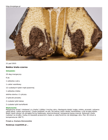 http://mojekgw.pl 21 paź 2015 Babka biało-czarna Składniki: 25 dag margaryny 6 jaj 1 szklanka cukru 1 cukier waniliowy 12 czubatych łyżek mąki pszennej 1 szklanka mleka skórka starta z 1 cytryny 2 łyżeczki proszku 2 czubate łyżki kakao 2 czubate łyżki kartoflanki Wykonanie: Margarynę utrzeć i dodawać co chwilę 1 żółtko i trochę cukru. Następnie dodać mąkę, mleko, proszek i sztywno ubitą pianę. Lekko wymieszać. Ciasto podzielić na pół. Do jednej części dodać kartoflankę, a do drugiej kakao. Białe ciasto włożyć do okrągłej formy babkowej, wysmarowanej i wysypanej kaszą manną. Kakaowe ciasto rozłożyć na środku i łyżką co kawałek przewrócić ciasto w całej foremce nie dotykając dna. Piec 40 minut w temperaturze 180 oC. Przepis p. Krystyny Gierszewskiej Redakcja mojeKGW.pl ..