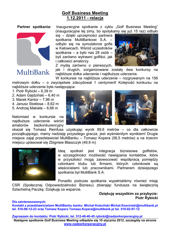 Golf Business Meeting 1.12.2011 - relacja Partner spotkania: Inauguracyjne spotkanie z cyklu „Golf Business Meeting” (inauguracyjne tej zimy, bo spotykamy się juŜ 15 raz) odbyło się – dzięki uprzejmości partnera spotkania MultiBankowi S.A. – odbyło się na symulatorze golfa w Katowicach. Wśród uczestników spotkania – a było nas 28 osób – byli zarówno wytrawni golfiści, jak i całkowici amatorzy. Z myślą zarówno o pierwszych, jak i drugich, zorganizowane zostały dwa konkursy na najbliŜsze dołka uderzenie i najdłuŜsze uderzenia. W konkursie na najbliŜsze uderzenie – rozgrywanym na 156 metrowym dołku – o zwycięstwie zdecydował 1 centyment! Kolejność konkursu na najbliŜsze uderzenie była następująca: 1. Piotr Rybicki – 6,39 m 2. Adam Gajdziński – 6,40 m 3. Marek Kantor – 7,96 m 4. Janusz Stokłosa – 8,62 m 5. Andrzej Makieła – 8,68 m Natomiast w konkursie na najdłuŜsze uderzenie wśród amatorów bezkonkurencyjny okazał się Tomasz Reinfuss uzyskując wynik 89,6 metrów – co dla całkowicie początkującego, mamy nadzieję przyszłego gracza, jest wyśmienitym wynikiem! Drugie miejsce zajął przedstawiciel MultiBanku – Tomasz Kopera (56,5 metrów) a na trzecim miejscu uplasował się Zbigniew Błaszczyk (49,9 m) Ideą spotkań jest integracja biznesowa golfistów, w szczególności moŜliwość nawiązania kontaktów, które w przyszłości mogą zaowocować współpracą pomiędzy członkami klubu lub firmami, których członkowie są właścicielami lub pracownikami. Partnerem dzisiejszego spotkania był MultiBank S.A. Ponadto podczas spotkania wypełnialiśmy równieŜ misję CSR (Społecznej Odpowiedzialności Biznesu) zbierając fundusze na świąteczną Szlachetną Paczkę. Dziękuję za wsparcie. Dziękuję wszystkim za przybycie: Piotr Rybicki Dla zainteresowanych: Kontakt z przedstawicielami MultiBanku banku: Michał Kościński [email protected] tel. 510-99-12-23 oraz Tomasz Kopera [email protected] tel. 510-02-97-12 Zapraszam do kontaktu: Piotr Rybicki, tel. 512-48-40-45 [email protected] Następne spotkanie Golf Business Meeting odbędzie się 10 stycznia 2012, szczegóły na stronie www.nadzorkorporacyjny.pl