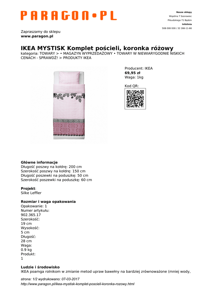 Nasze sklepy Wspólna 7 Sosnowiec Piłsudskiego 71 Będzin Infolinia 508-500-500 / 32 266-11-66 Zapraszamy do sklepu www.paragon.pl IKEA MYSTISK Komplet pościeli, koronka różowy kategoria: TOWARY > • MAGAZYN WYPRZEDAŻOWY • TOWARY W NIEWIARYGODNIE NISKICH CENACH - SPRAWDŹ! > PRODUKTY IKEA Producent: IKEA 69,95 zł Waga: 1kg Kod QR: Główne informacje Długość poszwy na kołdrę: 200 cm Szerokość poszwy na kołdrę: 150 cm Długość poszewki na poduszkę: 50 cm Szerokość poszewki na poduszkę: 60 cm Projekt: Silke Leffler Rozmiar i waga opakowania Opakowanie: 1 Numer artykułu: 902.365.17 Szerokość: 19 cm Wysokość: 5 cm Długość: 28 cm Waga: 0.9 kg Produkt: 1 Ludzie i środowisko IKEA poamga rolnikom w zmianie metod upraw bawełny na bardziej zrównoważone (mniej wody, strona: 1/2 wydrukowano: 07-03-2017 http://www.paragon.pl/ikea-mystisk-komplet-poscieli-koronka-rozowy.html nawozów sztucznych, pestycydów). Do 2015 r. cała bawełna w produktach IKEA będzie pochodzić ze zrównoważonych upraw. Instrukcja obsługi Prać w pralce 60°C Nie wybielać Można suszyć w pralko-suszarce Prasować w wysokiej temperaturze. Nie prać chemicznie Kurczenie 4% Opis produktu 100% bawełna Dobrze wiedzieć Poszwa na kołdrę - różne wzory po obu stronach. strona: 2/2 wydrukowano: 07-03-2017 http://www.paragon.pl/ikea-mystisk-komplet-poscieli-koronka-rozowy.html