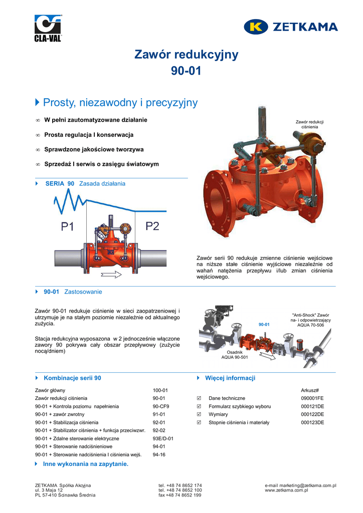 Zawór redukcyjny 90-01 Prosty, niezawodny i precyzyjny • W pełni zautomatyzowane działanie Zawór redukcji ciśnienia • Prosta regulacja I konserwacja • Sprawdzone jakościowe tworzywa • Sprzedaż I serwis o zasięgu światowym SERIA 90 Zasada działania Zawór serii 90 redukuje zmienne ciśnienie wejściowe na niższe stałe ciśnienie wyjściowe niezależnie od wahań natężenia przepływu i/lub zmian ciśnienia wejściowego. 90-01 Zastosowanie Zawór 90-01 redukuje ciśnienie w sieci zaopatrzeniowej i utrzymuje je na stałym poziomie niezależnie od aktualnego zużycia. 90-01 Stacja redukcyjna wyposazona w 2 jednocześnie włączone zawory 90 pokrywa cały obszar przepływowy (zużycie nocą/dniem) Kombinacje serii 90 "Anti-Shock" Zawór na- i odpowietrzający AQUA 70-506 Osadnik AQUA 90-501 Więcej informacji Zawór główny 100-01 Zawór redukcji ciśnienia 90-01 Dane techniczne 090001FE 90-01 + Kontrola poziomu napełnienia 90-CF9 Formularz szybkiego wyboru 000121DE 90-01 + zawór zwrotny 91-01 Wymiary 000122DE Stopnie ciśnienia i materiały 000123DE 90-01 + Stabilizacja ciśnienia 92-01 90-01 + Stabilizator ciśnienia + funkcja przeciwzwr. 92-02 90-01 + Zdalne sterowanie elektryczne 93E/D-01 90-01 + Sterowanie nadciśnieniowe 94-01 90-01 + Sterowanie nadciśnienia I ciśnienia wejś. 94-16 Arkusz# Inne wykonania na zapytanie. ZETKAMA Spółka Akcyjna ul. 3 Maja 12 PL 57-410 Ścinawka Średnia tel. +48 74 8652 174 tel. +48 74 8652 100 fax +48 74 8652 199 e-mail [email protected] www.zetkama.com.pl