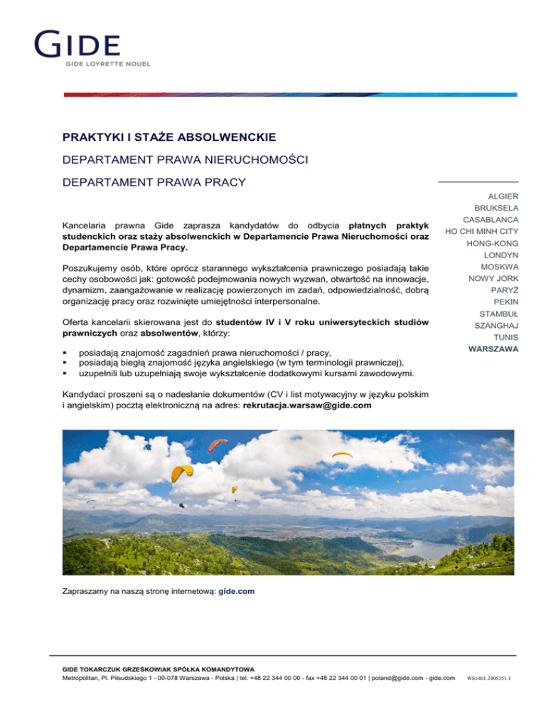 PRAKTYKI I STAŻE ABSOLWENCKIE DEPARTAMENT PRAWA NIERUCHOMOŚCI DEPARTAMENT PRAWA PRACY ALGIER BRUKSELA Kancelaria prawna Gide zaprasza kandydatów do odbycia płatnych praktyk studenckich oraz staży absolwenckich w Departamencie Prawa Nieruchomości oraz Departamencie Prawa Pracy. CASABLANCA HO CHI MINH CITY HONG-KONG LONDYN Poszukujemy osób, które oprócz starannego wykształcenia prawniczego posiadają takie cechy osobowości jak: gotowość podejmowania nowych wyzwań, otwartość na innowacje, dynamizm, zaangażowanie w realizację powierzonych im zadań, odpowiedzialność, dobrą organizację pracy oraz rozwinięte umiejętności interpersonalne. MOSKWA NOWY JORK PARYŻ PEKIN STAMBUŁ Oferta kancelarii skierowana jest do studentów IV i V roku uniwersyteckich studiów prawniczych oraz absolwentów, którzy: posiadają znajomość zagadnień prawa nieruchomości / pracy, posiadają biegłą znajomość języka angielskiego (w tym terminologii prawniczej), uzupełnili lub uzupełniają swoje wykształcenie dodatkowymi kursami zawodowymi. SZANGHAJ TUNIS WARSZAWA Kandydaci proszeni są o nadesłanie dokumentów (CV i list motywacyjny w języku polskim i angielskim) pocztą elektroniczną na adres: [email protected] Zapraszamy na naszą stronę internetową: gide.com GIDE TOKARCZUK GRZEŚKOWIAK SPÓŁKA KOMANDYTOWA Metropolitan, Pl. Piłsudskiego 1 - 00-078 Warszawa - Polska | tel. +48 22 344 00 00 - fax +48 22 344 00 01 | [email protected] - gide.com WS1401.2405351.1