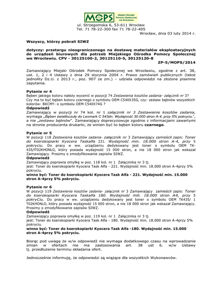 ul. Strzegomska 6, 53-611 Wrocław Tel. 71 78-22-300 fax 71 78-22-405 Wrocław, dnia 03 luty 2014 r. Wszyscy, którzy pobrali SIWZ dotyczy: przetargu nieograniczonego na dostawę materiałów eksploatacyjnych do urządzeń biurowych dla potrzeb Miejskiego Ośrodka Pomocy Społecznej we Wrocławiu. CPV - 30125100-2, 30125110-5, 30125120-8 ZP-5/MOPS/2014 Zamawiający Miejski Ośrodek Pomocy Społecznej we Wrocławiu, zgodnie z art. 38, ust. 1, 2 i 4 Ustawy z dnia 29 stycznia 2004 r. Prawo zamówień publicznych (tekst jednolity Dz.U. z 2013 r., poz. 907 ze zm.) – udziela odpowiedzi na złożone pisemne zapytania. Pytanie nr 4 Bęben jakiego koloru należy wycenić w pozycji 74 Zestawienia kosztów zadania- załącznik nr 3? Czy ma to być bęben koloru czarnego o symbolu OEM C540X35G, czy- zestaw bębnów wszystkich kolorów- BKCMY- o symbolu OEM C540X74G ? Odpowiedź Zamawiający w pozycji nr 74 kol. nr 1 załącznik nr 3 Zestawienie kosztów zadania, wymaga „Bęben światłoczuły do Lexmark C 543dn. Wydajność 30.000 stron A-4, przy 5% pokryciu.”, a nie „zestawu bębnów”. Zamawiający doprecyzowuje zgodnie z informacjami zawartymi na stronie producenta drukarki, że winien być to bęben koloru czarnego. Pytanie nr 5 W pozycji 118 Zestawienia kosztów zadania- załącznik nr 3 Zamawiający zamieścił zapis: Toner do kserokopiarki Kyocera Taskalfa 221. Wydajność min. 18.000 stron A-4, przy 5 pokryciu. Do pracy w ww. urządzeniu dedykowany jest toner o symbolu OEM TK435/lT02KHONLO, który posiada wydajność 15 000 stron, a nie 18 000 stron jak wskazał Zamawiający. Prosimy o zmodyfikowanie zapisów SIWZ. Odpowiedź Zamawiający poprawia omyłkę w poz. 118 kol. nr 1 Załącznika nr 3 tj. jest: Toner do kserokopiarki Kyocera Task Alfa - 221. Wydajność min. 18.000 stron A-4przy 5% pokryciu. winno być: Toner do kserokopiarki Kyocera Task Alfa - 221. Wydajność min. 15.000 stron A-4przy 5% pokryciu. Pytanie nr 6 W pozycji 119 Zestawienia kosztów zadania- załącznik nr 3 Zamawiający zamieścił zapis: Toner do kserokopiarki Kyocera Taskalfa 180. Wydajność mili. 18.000 stron A4, przy 5 pokryCiu. Do pracy w ww. urządzeniu dedykowany jest toner o symbolu OEM TK435/ 1 T02KHONLO, który posiada wydajność 15 000 stron, a nie 18 000 stron jak wskazał Zamawiający. Prosimy o zmodyfikowanie zapisów SIWZ. Odpowiedź Zamawiający poprawia omyłkę w poz. 119 kol. nr 1 Załącznika nr 3 tj. jest: Toner do kserokopiarki Kyocera Task Alfa - 180. Wydajność min. 18.000 stron A-4przy 5% pokryciu. winno być: Toner do kserokopiarki Kyocera Task Alfa -180. Wydajność min. 15.000 stron A-4przy 5% pokryciu. Biorąc pod uwagę że w/w odpowiedź nie wymaga dodatkowego czasu na wprowadzanie zmian w ofertach nie ma zastosowania art. 38 ust 6. w/w Ustawy tj. przedłużenie terminu składania ofert. Jednocześnie informuję, że odpowiedzi są wiążące dla wszystkich Wykonawców.