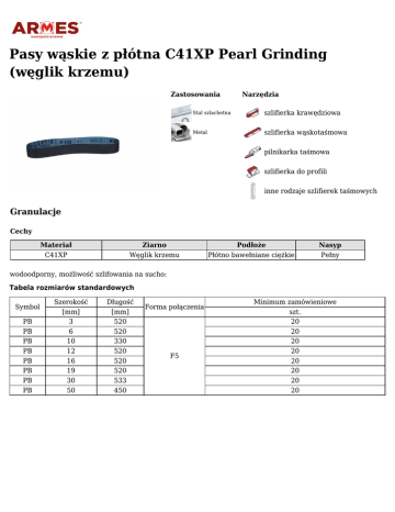 Pasy wąskie z płótna C41XP Pearl Grinding (węglik krzemu) Zastosowania Narzędzia Stal szlachetna szlifierka krawędziowa Metal szlifierka wąskotaśmowa pilnikarka taśmowa szlifierka do profili inne rodzaje szlifierek taśmowych Granulacje Cechy Materiał C41XP Ziarno Węglik krzemu Podłoże Płótno bawełniane ciężkie Nasyp Pełny wodoodporny, możliwość szlifowania na sucho: Tabela rozmiarów standardowych Symbol PB PB PB PB PB PB PB PB Szerokość [mm] 3 6 10 12 16 19 30 50 Długość [mm] 520 520 330 520 520 520 533 450 Forma połączenia F5 Minimum zamówieniowe szt. 20 20 20 20 20 20 20 20 PB PB PB PB PB PB PB PB PB PB PB PB PB PB 50 50 75 100 100 100 100 150 150 150 150 200 300 2000 3000 2000 289 915 2250 3000 F1, F2, F3, F4 2000 2500 3000 7250 2000 1900 inne wymiary* 10 10 10 10 10 10 10 10 10 10 10 10 10 Zastosowanie: - wszystkie etapy szlifowania powierzchni i krawędzi elementów metalowych - obróbka zgrubna i wykańczająca powierzchni, krawędzi i profili różnych gatunków drewna i materiałów drewnopochodnych - obróbka szkła i tworzyw sztucznych Zalety: - możliwość wykonania dowolnego rozmiaru pasa wg. życzenia klienta - szeroka gama podłoży i ziaren umożliwia właściwy dobór materiału do każdego procesu szlifowania - długi czas użytkowania ze względu na wytrzymałe podłoża bawełniane i poliestrowe - warstwy dodatkowe zapobiegają nadmiernemu wydzielaniu się ciepła podczas szlifowania Zakład Artykułów Ściernych ARMES ul. Nowa Boczna 4 37-400 Nisko NIP: 865-000-73-53 e-mail: [email protected] web: www.armes.com.pl Sekretariat: (+48 15) 841 53 21 (+48 15) 841 63 57 Fax: (+48 15) 841 39 47