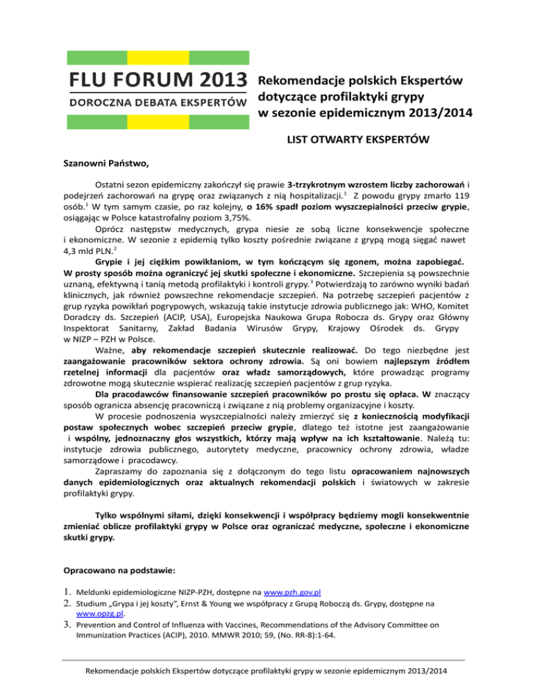 Rekomendacje polskich Ekspertów dotyczące profilaktyki grypy w sezonie epidemicznym 2013/2014 LIST OTWARTY EKSPERTÓW Szanowni Państwo, Ostatni sezon epidemiczny zakończył się prawie 3-trzykrotnym wzrostem liczby zachorowań i podejrzeń zachorowań na grypę oraz związanych z nią hospitalizacji. 1 Z powodu grypy zmarło 119 osób.1 W tym samym czasie, po raz kolejny, o 16% spadł poziom wyszczepialności przeciw grypie, osiągając w Polsce katastrofalny poziom 3,75%. Oprócz następstw medycznych, grypa niesie ze sobą liczne konsekwencje społeczne i ekonomiczne. W sezonie z epidemią tylko koszty pośrednie związane z grypą mogą sięgać nawet 4,3 mld PLN.2 Grypie i jej ciężkim powikłaniom, w tym kończącym się zgonem, można zapobiegać. W prosty sposób można ograniczyć jej skutki społeczne i ekonomiczne. Szczepienia są powszechnie uznaną, efektywną i tanią metodą profilaktyki i kontroli grypy. 3 Potwierdzają to zarówno wyniki badań klinicznych, jak również powszechne rekomendacje szczepień. Na potrzebę szczepień pacjentów z grup ryzyka powikłań pogrypowych, wskazują takie instytucje zdrowia publicznego jak: WHO, Komitet Doradczy ds. Szczepień (ACIP, USA), Europejska Naukowa Grupa Robocza ds. Grypy oraz Główny Inspektorat Sanitarny, Zakład Badania Wirusów Grypy, Krajowy Ośrodek ds. Grypy w NIZP – PZH w Polsce. Ważne, aby rekomendacje szczepień skutecznie realizować. Do tego niezbędne jest zaangażowanie pracowników sektora ochrony zdrowia. Są oni bowiem najlepszym źródłem rzetelnej informacji dla pacjentów oraz władz samorządowych, które prowadząc programy zdrowotne mogą skutecznie wspierać realizację szczepień pacjentów z grup ryzyka. Dla pracodawców finansowanie szczepień pracowników po prostu się opłaca. W znaczący sposób ogranicza absencję pracowniczą i związane z nią problemy organizacyjne i koszty. W procesie podnoszenia wyszczepialności należy zmierzyć się z koniecznością modyfikacji postaw społecznych wobec szczepień przeciw grypie, dlatego też istotne jest zaangażowanie i wspólny, jednoznaczny głos wszystkich, którzy mają wpływ na ich kształtowanie. Należą tu: instytucje zdrowia publicznego, autorytety medyczne, pracownicy ochrony zdrowia, władze samorządowe i pracodawcy. Zapraszamy do zapoznania się z dołączonym do tego listu opracowaniem najnowszych danych epidemiologicznych oraz aktualnych rekomendacji polskich i światowych w zakresie profilaktyki grypy. Tylko wspólnymi siłami, dzięki konsekwencji i współpracy będziemy mogli konsekwentnie zmieniać oblicze profilaktyki grypy w Polsce oraz ograniczać medyczne, społeczne i ekonomiczne skutki grypy. Opracowano na podstawie: 1. Meldunki epidemiologiczne NIZP-PZH, dostępne na www.pzh.gov.pl 2. Studium „Grypa i jej koszty”, Ernst & Young we współpracy z Grupą Roboczą ds. Grypy, dostępne na www.opzg.pl. 3. Prevention and Control of Influenza with Vaccines, Recommendations of the Advisory Committee on Immunization Practices (ACIP), 2010. MMWR 2010; 59, (No. RR-8):1-64. Rekomendacje polskich Ekspertów dotyczące profilaktyki grypy w sezonie epidemicznym 2013/2014 W debacie FLU FORUM 2013 udział wzięli m.in.: • prof. UM w Łodzi dr hab. med. Adam Antczak – Przewodniczący Rady Naukowej Instytutu Oświaty Zdrowotnej Fundacji Haliny Osińskiej, Polskie Towarzystwo Chorób Płuc • prof. dr hab. Lidia B. Brydak – Kierownik Zakładu Badań Wirusów Grypy, Krajowego Ośrodka ds. Grypy w NIZP-PZH • prof. dr hab. med. Bogdan Chazan – Dyrektor Szpitala im. Świętej Rodziny w Warszawie • prof. IK w Warszawie dr hab. med. Andrzej Ciszewski – Polskie Towarzystwo Kardiologiczne • Michał Ilnicki – Departament Zapobiegania oraz Zwalczania Zakażeń i Chorób Zakaźnych u Ludzi • dr Bożena Janicka – Prezes Porozumienia Pracodawców Ochrony Zdrowia • Włodzimierz Jezierski – Prezes Polskiego Towarzystwa Oświaty Zdrowotnej • Marta Klimkowska – Misiak – Wiceprezes Okręgowej Rady Lekarskiej w Warszawie, Naczelna Izba Lekarska • dr Jacek Krajewski – Prezes Federacji Związków Pracodawców Ochrony Zdrowia Porozumienie Zielonogórskie • dr Jarosław Król – Skarbnik Porozumienia Pracodawców Ochrony Zdrowia • dr n. med. Ernest Kuchar – Polskie Towarzystwo Wakcynologii • Izabela Kucharska – Dyrektor Departamentu Zapobiegania oraz Zwalczania Zakażeń i Chorób Zakaźnych u Ludzi w Głównym Inspektoracie Sanitarnym • Teresa Kuziara – Członek Naczelnej Rady Pielęgniarek i Położnych • dr n. med. Halina Krześniak – Zakład Ubezpieczeń Społecznych • Tomasz Latos – Przewodniczący Sejmowej Komisji Zdrowia • Andrzej Malinowski – Prezydent Związku Pracodawców "Pracodawcy RP" • dr n. med. Agnieszka Mastalerz – Migas – Polskie Towarzystwo Medycyny Rodzinnej • dr n. med. Wojciech Matusewicz – Dyrektor Agencji Oceny Technologii Medycznych • dr n. med. Aneta Nitsch – Osuch – Polskie Towarzystwo Medycyny Rodzinnej, Warszawski Uniwersytet Medyczny • Maciej Piróg – Doradca Prezydenta RP • Marek Posobkiewicz – p.o. Głównego Inspektora Sanitarnego • Igor Radziewicz – Winnicki – Sekretarz Stanu w Ministerstwie Zdrowia • Marek Wójcik – Dyrektor Biura Związku Powiatów Polskich Rekomendacje polskich Ekspertów dotyczące profilaktyki grypy w sezonie epidemicznym 2013/2014 Rekomendacje polskich Ekspertów dotyczące profilaktyki grypy w sezonie epidemicznym 2013/2014 Załączniki do Listu Ekspertów: Polskie dane epidemiologiczne a. Grypa – zachorowania, hospitalizacje, zgony b. Szczepienia przeciw grypie II. Wskazania do szczepień a. Wskazania kliniczne b. Wskazania epidemiologiczne III. Przeciwwskazania do szczepień IV. Szczepionki przeciw grypie: a. szczepy zatwierdzone przez WHO b. szczepionki dostępne w Polsce w sezonie 2013/2014 c. dawkowanie I. Rekomendacje polskich Ekspertów dotyczące profilaktyki grypy w sezonie epidemiczny