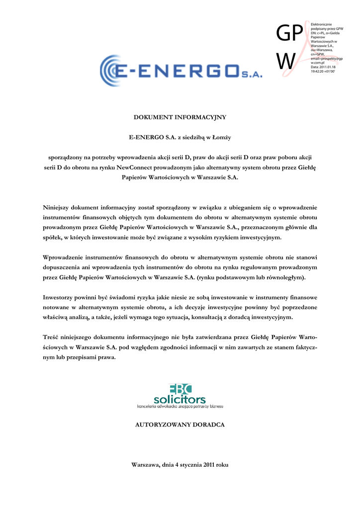 GP W Elektronicznie podpisany przez GPW DN: c=PL, o=Gielda Papierow Wartosciowych w Warszawie S.A., ou=Warszawa, cn=GPW, email=prospekty@gp w.com.pl Data: 2011.01.18 19:42:20 +01'00' DOKUMENT INFORMACYJNY E-ENERGO S.A. z siedzibą w ŁomŜy sporządzony na potrzeby wprowadzenia akcji serii D, praw do akcji serii D oraz praw poboru akcji serii D do obrotu na rynku NewConnect prowadzonym jako alternatywny system obrotu przez Giełdę Papierów Wartościowych w Warszawie S.A. Niniejszy dokument informacyjny został sporządzony w związku z ubieganiem się o wprowadzenie instrumentów finansowych objętych tym dokumentem do obrotu w alternatywnym systemie obrotu prowadzonym przez Giełdę Papierów Wartościowych w Warszawie S.A., przeznaczonym głównie dla spółek, w których inwestowanie moŜe być związane z wysokim ryzykiem inwestycyjnym. Wprowadzenie instrumentów finansowych do obrotu w alternatywnym systemie obrotu nie stanowi dopuszczenia ani wprowadzenia tych instrumentów do obrotu na rynku regulowanym prowadzonym przez Giełdę Papierów Wartościowych w Warszawie S.A. (rynku podstawowym lub równoległym). Inwestorzy powinni być świadomi ryzyka jakie niesie ze sobą inwestowanie w instrumenty finansowe notowane w alternatywnym systemie obrotu, a ich decyzje inwestycyjne powinny być poprzedzone właściwą analizą, a takŜe, jeŜeli wymaga tego sytuacja, konsultacją z doradcą inwestycyjnym. Treść niniejszego dokumentu informacyjnego nie była zatwierdzana przez Giełdę Papierów Wartościowych w Warszawie S.A. pod względem zgodności informacji w nim zawartych ze stanem faktycznym lub przepisami prawa. AUTORYZOWANY DORADCA Warszawa, dnia 4 stycznia 2011 roku Dokument Informacyjny E-ENERGO S.A. strona 2 z 46 Dokument Informacyjny E-ENERGO S.A. strona 3 z 46 Dokument Informacyjny E-ENERGO S.A. Wstęp Dokument informacyjny Informacje o Emitencie Firma: E-ENERGO Forma prawna: spółka akcyjna Kraj siedziby: Polska Siedziba: ŁomŜa Adres: ul. Sienkiewicza 10/10, 18-400 ŁomŜą tel. + 48 86 473 54 28 faks: + 48 86 473 54 28 Internet: www.e-energo.pl E-mail: [email protected] KRS: 0000286062 REGON: 200164818 NIP: 718-20-64-244 Informacje o Autoryzowanym Doradcy Firma: EBC Solicitors Arkadiusz Stryja Forma prawna: spółka komandytowa Kraj siedziby: Polska Siedziba: Warszawa Adres: ul. Pankiewicza 3, 00-696 Warszawa tel.: + 48 22 828 53 00 faks: + 48 22 828 53 01 Internet: www.ebcsolicitors.pl E-mail: [email protected] KRS: 0000266826 REGON: 140778886 NIP: 525-23-82-713 Informacje na temat instrumentów finansowych wprowadzanych do obrotu w Alternatywnym systemie obrotu Na podstawie niniejszego dokumentu informacyjnego do obrotu w Alternatywnym systemie obrotu wprowadzane są: • 22.000.000 (dwadzieścia dwa miliony) akcji na okaziciela serii D o wartości nominalnej 10 gr (dziesięć groszy) kaŜda, • 22.000.000 (dwadzieścia dwa miliony) praw do akcji na okaziciela serii D o wartości nominalnej 10 gr (dziesięć groszy) kaŜda, strona 4 z 46 Dokument Informacyjny E-ENERGO S.A. • 11.000.000 (jedenaście milionów) praw poboru akcji na okaziciela serii D o wartości nominalnej 10 gr (dziesięć groszy) kaŜda. Łączna wartość nominalna instrumentów finansowych wprowadzanych do obrotu w Alternatywnym systemie obrotu na podstawie niniejszego dokumentu informacyjnego wynosi 2.200.000 zł (dwa miliony dwieście tysięcy złotych) Na podstawie niniejszego dokumentu informacyjnego do obrotu w Alternatywnym systemie obrotu wprowadzane są akcje reprezentujące 66,67 proc. (sześćdziesiąt sześć i sześćdziesiąt sześć setnych procenta) kapitału zakładowego Emitenta i 66,67 proc. (sześćdziesiąt sześć i sześćdziesiąt sześć setnych procenta) głosów na Walnym Zgromadzeniu. Akcje Serii D, które zostaną wprowadzone do alternatywnego systemu obrotu, są toŜsame w prawach, a w szczególności, ale nie wyłącznie, w prawie do dywidendy, z Akcjami Serii A, Akcjami Serii B, oraz Akcjami Serii C, które są notowane na rynku NewConnect. Akcje Serii D są przedmiotem oferty publicznej. W związku z ofertą publiczną Akcji Serii D nie został sporządzony prospekt emisyjny, z uwagi na treść art. 7 ust. 3 pkt. 6 Ustawy o ofercie, zgodnie z którym sporządzenie, zatwierdzenie oraz udostępnienie do publicznej wiadomości prospektu emisyjnego nie jest wymagane w przypadku oferty publicznej papierów wartościowych, których wartość, liczona według ceny emisyjnej lub ceny sprzedaŜy stanowi mniej niŜ 2.500.000 EURO. PoniewaŜ oferta publiczna obejmuje wyłącznie proponowanie nabycia Akcji Serii D dotychczasowym akcjonariuszom w wykonaniu prawa poboru, to zgodnie z art. 41 pkt 1 lit. c Ustawy o ofercie nie istnieje takŜe obowiązek sporządzenia memorandum informacyjnego. Struktura kapitału zakładowego Emitenta, z uwzględnieniem niezarejestrowanych na dzień sporządzania niniejszego dokumentu informacyjnego Akcji Serii D, przedstawia się następująco: lp Seria akcji Liczba akcji Udział w kapitale za- Udział w głosach (w (w szt.) kładowym (w proc.) proc.) 1. A 5.000.000 15,15 15,15 2. B 900.000 2,73 2,73 3. C 5.100.000 15,45 15,45 4. D 22.000.000 66,67 66.67 33.000.000 100 100 Razem strona 5 z 46 Dokument Informacyjny E-ENERGO S.A. Wskazanie osób zarządzających Emitentem, Autoryzowanym Doradcą oraz podmiotów dokonujących badania sprawozdań finansowych Emitenta (wraz ze wskazaniem biegłych rewidentów dokonujących badania) Zarząd Emitenta W skład Zarządu Emitenta wchodzą obecnie: 1/ Krzysztof Konopka - Prezes Zarządu; Osoby zarządzające Autoryzowanym Doradcą: W skład Zarządu Emitenta wchodzą obecnie: 1/ Arkadiusz Stryja - komplementariusz; 2/ Adam Osiński - komandytariusz, prokurent. Podmiot dokonujący badania sprawozdań finansowych Emitenta Sprawozdanie finansowe Emitenta za rok 2009 zostało zbadane przez Firmę „BB” Bogumiła BęczkowskaBacia, zarejestrowaną na liście podmiotów uprawnionych do badania sprawozdań f