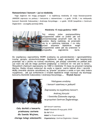 Ratownictwo i koncert – już w niedzielę Tego żeglarze nie mogą przegapić – w najbliższą niedzielę 15 maja Stowarzyszenie JAMSEN zaprasza na pokazy i ćwiczenia z ratownictwa – o godz. 14.00, i na niebywały koncert Dominiki Żukowskiej i Andrzeja Koryckiego – o godz. 19.00 (wspólnie z Centrum Żeglarskim - szczegóły poniżej) (WS). Niedziela 15 maja godzina 1400! Tej wiosny znów postanowiliśmy przypomnieć sobie co zrobić jak coś poważniejszego przytrafi nam się na wodzie. Mamy nadzieję, że przerodzi się to w cykliczną imprezę -i co roku przed sezonem będziecie mogli przypomnieć sobie jak się uratować w przypadku zagrożenia życia. Do współpracy zaprosiliśmy WOPR (czekamy na potwierdzenie) i zgromadziliśmy trochę sprzętu pirotechnicznego. Będziecie mogli sprawdzić jak bezpiecznie przesiąść się z jachtu na tratwę ratunkową, jak podjąć człowieka na pokład jeśli już wam się uda do niego jachtem podpłynąć -a wierzcie mi -nie jest to łatwe.. Wszystkich chętnych zapraszamy na 1400 w niedzielę 15 maja na przystań Camping Marina. Osoby chcące wskoczyć do wody w Aqacie -warto zabrać dres i ręcznik MURy (morskie ubrania ratunkowe) są "prawie" szczelne a woda w tym roku mokra wyjątkowo.. Jak już ochłoniecie z wrażeń będziecie mogli wyciszyć się słuchając koncertu Dominiki Żukowskiej i Andrzeja Koryckiego... Wojtek Kaczor