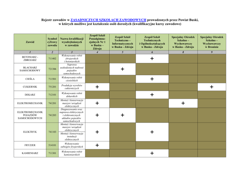 Rejestr zawodów w ZASADNICZYCH SZKOŁACH ZAWODOWYCH prowadzonych przez Powiat Buski, w których możliwe jest kształcenie osób dorosłych (kwalifikacyjne kursy zawodowe) Zawód Symbol cyfrowy zawodu 1 2 Nazwa kwalifikacji wyodrębnionych w zawodzie 3 Zespół Szkół Ponadgimnazjalnych Nr 1 w Busku – Zdroju 4 Wykonywanie robót zbrojarskich i betoniarskich Naprawa uszkodzonych nadwozi pojazdów samochodowych BETONIARZ ZBROJARZ 711402 BLACHARZ SAMOCHODOWY 721306 CIEŚLA 711501 Wykonywanie robót ciesielskich CUKIERNIK 751201 Produkcja wyrobów cukierniczych DEKARZ 712101 Wykonywanie robót dekarskich ELEKTROMECHANIK 741201 ELEKTROMECHANIK POJAZDÓW SAMOCHODOWYCH 741203 ELEKTRYK 741103 FRYZJER 514101 Wykonywanie zabiegów fryzjerskich KAMIENIARZ 711301 Wykonywanie robót kamieniarskich Montaż i konserwacja maszyn i urządzeń elektrycznych Diagnozowanie oraz naprawa elektrycznych i elektronicznych układów pojazdów samochodowych Montaż i konserwacja maszyn i urządzeń elektrycznych Montaż i konserwacja instalacji elektrycznych Zespół Szkół Techniczno – Informatycznych w Busku - Zdroju Zespół Szkół Technicznych i Ogólnokształcących w Busku - Zdroju Specjalny Ośrodek Szkolno – Wychowawczy w Busku - Zdroju Specjalny Ośrodek Szkolno – Wychowawczy w Broninie 5 6 8 9 + + + + + + + + + + + + + + 1 KELNER 2 513101 3 Wykonywanie usług kelnerskich Organizacja usług gastronomicznych KRAWIEC 753105 Wykonywanie usług krawieckich KUCHARZ 512001 Sporządzanie potraw i napojów MECHANIK MASZYN I URZĄDZEŃ DROGOWYCH 834201 MECHANIK-MONTER MASZYN I URZĄDZEŃ 723310 Montaż i obsługa maszyn i urządzeń MECHANIK MOTOCYKLOWY 723107 Diagnozowanie i naprawa motocykli 834103 MECHANIK POJAZDÓW SAMOCHODOWYCH 723103 MONTER IZOLACJI BUDOWLANYCH 712401 Wykonywanie izolacji budowlanych MONTER KONSTRUKCJI BUDOWLANYCH 711102 Montaż konstrukcji budowlanych 712616 Wykonywanie robót związanych z budową i remontem sieci komunalnych Wykonywanie robót związanych z montażem i remontem instalacji sanitarnych 6 + + 8 9 + + + Wykonywanie robót drogowych Użytkowanie pojazdów, maszyn, urządzeń i narzędzi stosowanych w rolnictwie Obsługa techniczna oraz naprawa pojazdów, maszyn i urządzeń stosowanych w rolnictwie Diagnozowanie i naprawa podzespołów i zespołów pojazdów samochodowych 5 + Eksploatacja maszyn i urządzeń drogowych MECHANIK – OPERATOR POJAZDÓW I MASZYN ROLNICZYCH MONTER SIECI, INSTALACJI I URZĄDZEŃ SANITARNYCH 4 + + + + + + + + + + + + + + 1 MONTER SIECI I URZĄDZEŃ TELEKOMUNIKACYJNYCH 2 742202 3 4 Montaż i utrzymanie linii telekomunikacyjnych Montaż, konfiguracja i utrzymanie urządzeń sieci telekomunikacyjnych Montaż systemów suchej zabudowy 5 8 9 + MONTER ZABUDOWY I ROBÓT WYKOŃCZENIOWYCH W BUDOWNICTWIE 712905 MURARZ - TYNKARZ 711204 OGRODNIK 611303 OPERATOR OBRABIAREK SKRAWAJĄCYCH 722307 Użytkowanie obrabiarek skrawających PIEKARZ 751204 Produkcja wyrobów piekarskich PRACOWNIK POMOCNICZY OBSŁUGI HOTELOWEJ 911205 Wykonywanie prac pomocniczych w obiektach świadczących usługi hotelarskie ROLNIK 613303 Prowadzenie produkcji rolniczej + + ŚLUSARZ 722204 Wykonywanie i naprawa elementów maszyn, urządzeń i narzędzi + + SPRZEDAWCA 522301 Prowadzenie sprzedaży + STOLARZ 752205 Wytwarzanie wyrobów stolarskich Wykonywanie robót malarsko – tapeciarskich Wykonywanie robót posadzkarsko okładzinowych Wykonywanie robót murarskich i tynkarskich Zakładanie i prowadzenie upraw ogrodniczych 6 + + + + + + + + + + + + + +
