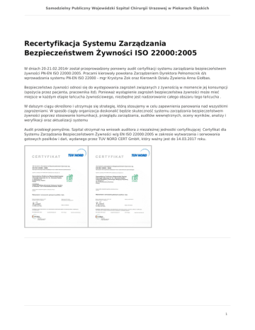 Samodzielny Publiczny Wojewódzki Szpital Chirurgii Urazowej w Piekarach Śląskich Recertyfikacja Systemu Zarządzania Bezpieczeństwem Żywności ISO 22000:2005 W dniach 20-21.02.2014r został przeprowadzony ponowny audit certyfikacji systemu zarządzania bezpieczeństwem żywności PN-EN ISO 22000:2005. Pracami kierowały powołana Zarządzeniem Dyrektora Pełnomocnik d/s wprowadzania systemu PN-EN ISO 22000 - mgr Krystyna Zok oraz Kierownik Działu Żywienia Anna Giołbas. Bezpieczeństwo żywności odnosi się do występowania zagrożeń związanych z żywnością w momencie jej konsumpcji (spożycia przez pacjenta, pracownika itd). Ponieważ wystąpienie zagrożeń bezpieczeństwa żywności może mieć miejsce w każdym etapie łańcucha żywnościowego, niezbędne jest nadzorowanie całego obszaru tego łańcucha . W dalszym ciągu określono i utrzymuje się strategię, którą stosujemy w celu zapewnienia panowania nad wszystkimi zagrożeniami. W sposób ciągły organizacja doskonalić będzie skuteczność systemu zarządzania bezpieczeństwem żywności poprzez stosowanie komunikacji, przeglądu zarządzania, auditów wewnętrznych, oceny wyników, analizy i weryfikacji oraz aktualizacji systemu Audit przebiegł pomyślnie. Szpital otrzymał na wniosek auditora z niezależnej jednostki certyfikującej Certyfikat dla Systemu Zarządzania Bezpieczeństwem Żywności w/g EN ISO 22000:2005 w zakresie wytwarzania i serwowania gotowych posiłków i dań, wydanego przez TUV NORD CERT GmbH, który ważny jest do 14.03.2017 roku. 1