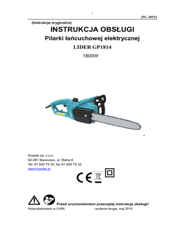 1 (PL-2015) (Instrukcja oryginalna) INSTRUKCJA OBSŁUGI Pilarki łańcuchowej elektrycznej LIDER GP1814 1800W Krysiak sp. z o.o. 62-081 Baranowo, ul. Rolna 6 Tel. 61 650 75 30, fax 61 650 75 32 www.krysiak.pl Przed uruchomieniem przeczytaj instrukcję obsługi! Wyprodukowano w CHRL - wydanie drugie, maj 2015 2 (PL-2015) Uwaga! Ze względu na ciągłe doskonalenie produktów zamieszczone rysunki, opisy mogą się różnić od zakupionego towaru oraz mogą zawierać elementy opcjonalne lub specjalistyczne, nieprzewidziane w wersji standardowej. Różnice te nie mogą być podstawą do reklamacji. Wszelkie dane zawarte w niniejszej instrukcji są zgodne z informacjami aktualnymi w chwili oddania do druku i mają jedynie charakter informacyjny. Zastrzega się prawo do wprowadzenia zmian specyfikacji technicznych i funkcjonowania wynikających z postępu technicznego. W razie wątpliwości prosimy o kontakt z najbliższym serwisem lub sprzedawcą. Zmiany techniczne i wizualne mogą być wprowadzane bez zapowiedzi, w trakcie procesu modyfikacji i ulepszania produktów. Wszelkie wymiary, wskazówki i dane podane w niniejszej instrukcji obsługi są w związku z tym podawane w sposób niewiążący. Roszczenia zgłaszane na podstawie treści instrukcji obsługi są nieważne. Spis treści (Instrukcja oryginalna) .............................................................................................................. 1 1. Zastosowanie............................................................................................................................. 6 2. Piktogramy i znaki ostrzegawcze .............................................................................................. 6 3. Ogólne wskazówki bezpieczeństwa .......................................................................................... 7 3.1. Bezpieczeństwo miejsca pracy ......................................................................................... 7 3.2. Bezpieczeństwo elektryczne............................................................................................. 8 3.3. Bezpieczeństwo użytkownika .......................................................................................... 8 3.4. Bezpieczeństwo pracy i użytkowania ............................................................................... 9 3.5. Dodatkowe zasady bezpieczeństwa dla elektrycznych pilarek łańcuchowych ...................... 9 3.6. Przyczyny i sposoby unikania odrzutów (kick-back) ..................................................... 11 4. Dane techniczne ...................................................................................................................... 13 5. Elementy pilarki (Rys.1, 2, 3) ........................................................................................... 13 6. Montaż prowadnicy i łańcucha (rys. 1,2,3) ............................................................................. 13 7. Napinanie łańcucha tnącego (Rys. 3) ...................................................................................... 14 8. Olej łańcuchowy / Smarowanie (rys. 4) .................................................................................. 15 9. Sprawdzenie funkcji automatycznego smarowania ................................................................ 15 10. Elementy bezpieczeństwa chroniące przed odrzutem ........................................................ 15 11. Informacje ogólne dotyczące piłowania ............................................................................. 16 12. Przedłużacz ......................................................................................................................... 16 13. Przed uruchomieniem ......................................................................................................... 17 15. Bezpieczna praca pilarką elektryczną ................................................................................. 17 15.1. Ścinanie gałęzi (okrzesywanie) .......................................................................................... 17 15.2. Ścinanie drzew ................................................................................................................... 18 15.3. Procedura ścinania ............................................................................................................. 19 15.4. Okrzesywanie (rys. 10) ...................................................................................................... 20 3 (PL-2015) 15.5. Przecinanie drewna ............................................................................................................ 21 15.6. Cięcie pnia na podłożu ................................................................................................... 21 16. Czyszczenie i konserwacja ................................................................................................. 22 16.1. Czyszczenie pilarki ............................................................................................................ 22 16.2. Prowadnica ......................................................................................................................... 23 16.3. Ostrzenie łańcucha (rys. 15)............................................................................................... 23 17. UTYLIZACJA I OCHRONA ŚRODOWISKA NATURALNEGO ................................... 25 18. GWARANCJA ................................................................................................................... 25 19. PRZECHOWYWANIE I TRANSPORT ................................................................................... 25 20. Deklaracja zgodności z dyrektywami UE ................................................................................. 26 4 (PL-2015) 5 (PL-2015) 6 (PL-2015) 1. Zastosowanie Elektryczna pilarka łańcuchowa jest przeznaczona tylko do cięcia drewna. Możemy wyróżnić następujące za