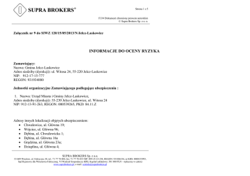 Strona 1 z 5 F334 Dokument chroniony prawem autorskim © Supra Brokers Sp. z o. o. Załącznik nr 9 do SIWZ 120/15/05/2013/N/Jelcz-Laskowice INFORMACJE DO OCENY RYZYKA Zamawiający: Nazwa: Gmina Jelcz-Laskowice Adres siedziby (dyrekcji): ul. Witosa 24, 55-220 Jelcz-Laskowice NIP: 912-17-15-777 REGON: 931934880 Jednostki organizacyjne Zamawiającego podlegające ubezpieczeniu : 1. Nazwa: Urząd Miasta i Gminy Jelcz-Laskowice, Adres siedziby (dyrekcji): 55-230 Jelcz-Laskowice, ul. Witosa 24 NIP: 912-13-91-263, REGON: 000539265, PKD: 84.11.Z Adresy innych lokalizacji objętych ubezpieczeniem: Chwałowice, ul. Główna 19; Wójcice, ul. Główna 96; Dębina, ul. Chwałowicka 1; Dębina, ul. Główna 16a Grędzina, ul. Główna 23a; Dziuplina, ul. Główna 4; SUPRA BROKERS Sp. z o.o. 53-609 Wrocław, ul. Fabryczna 10, tel.: 71 77 70 400, fax: 71 77 70 455 NIP: 899-25-23-230, REGON: 931886336, nr KRS: 0000155993, Sąd Rejonowy dla Wrocławia-Fabrycznej, VI Wydział Gospodarczy KRS, Kapitał zakładowy: 501 800 PLN - wpłacony w całości www.suprabrokers.pl, e-mail: [email protected] Strona 2 z 5 F334 Dokument chroniony prawem autorskim © Supra Brokers Sp. z o. o. Biskupice, ul. Główna 23a; Minkowice, ul. Kościuszki 86a; Minkowice, ul. Kościuszki 86b; Piekary, ul. Główna 17; Miłoszyce, ul. Główna 7a; Miłocice, ul. Główna 26a; Miłocice, ul. Główna 26b; Jelcz-Laskowice, ul. Witosa 24; Jelcz-Laskowice, ul. Witosa 41; Kopalina, ul. Główna 22a; Jelcz-Laskowice, szalet miejski; ul. Chabrowa Jelcz-Laskowice, ul. Techników 12; Jelcz-Laskowice, ul. Witosa 71. Jelcz-Laskowice, ul. Folwarczna 13a Wójcie, ul. Główna 30 Biskupice, ul. Główna 2a Kopalina ul Główna 30 2. Nazwa: Zespół Ekonomiczno-Administracyjny Adres: 55-231 Jelcz-Laskowice, ul. Witosa 41 Publiczna Szkoła Podstawowa w Wójcicach ul. Główna 87 Publiczna Szkoła Podstawowa Nr 2; al. Młodych 1 55-231 Jelcz-Laskowice, Publiczna Szkoła Podstawowa Nr 3 w Jelczu-Laskowicach ul. Bolesława Prusa 2 Publiczna Szkoła Podstawowa Nr 3 w Jelczu-Laskowicach ul. Hirszfelda 92 Zespół Szkół: Publiczna Szkoła Podstawowa i Publiczne Gimnazjum w Minkowicach, ul. Kościelna 20 SUPRA BROKERS Sp. z o.o. 53-609 Wrocław, ul. Fabryczna 10, tel.: 71 77 70 400, fax: 71 77 70 455 NIP: 899-25-23-230, REGON: 931886336, nr KRS: 0000155993, Sąd Rejonowy dla Wrocławia-Fabrycznej, VI Wydział Gospodarczy KRS, Kapitał zakładowy: 501 800 PLN - wpłacony w całości www.suprabrokers.pl, e-mail: [email protected] Strona 3 z 5 F334 Dokument chroniony prawem autorskim © Supra Brokers Sp. z o. o. Publiczne Gimnazjum Nr 1 w Jelczu-Laskowicach; ul. Szkolna 1 55-230 Jelcz-Laskowice Publiczne Gimnazjum Nr 2 w Jelczu-Laskowicach; al. Młodych 1 55-231 Jelcz-Laskowice Publiczna Szkoła Podstawowa w Miłoszycach ul. Główna 24 Miłoszyce Publiczna Szkoła Podstawowa w Miłoszycach ul. Świętochowskiego 3. Nazwa: Miejska Biblioteka Publiczna w Jelczu-Laskowicach Adres siedziby (dyrekcji): ul. Bożka 11, 33-231 Jelcz-Laskowice Adresy innych lokalizacji objętych ubezpieczeniem: Minkowice, ul. Kościuszki 86a (w remizie strażackiej), Miłocice, ul. Szkolna 1, Wójcice, ul. Główna, Jelcz-Laskowice, ul. B. Prusa 2a 4. Nazwa: Pływalnia Miejska Adres: ul. Basenowa 5, 55-220 Jelcz Laskowice Jelcz-Laskowice, ul. Stawowa 30 Jelcz-Laskowice, ul. Świerkowa 20 Chwałowice, ul. Szkolna 4 Jelcz-Laskowice, ul. Partyzantów 10; UBEZPIECZENIA MIENIA WYPŁACONE ODSZKODOWANIA I UTWORZONE REZERWY DLA SZKÓD, KTÓRE WYDARZYŁY SIĘ W OKRESIE OSTATNICH 3 LAT (TJ. OD 01.01.2009) WG DANYCH UZYSKANYCH OD TOWARZYSTW UBEZPIECZENIOWYCH SUPRA BROKERS Sp. z o.o. 53-609 Wrocław, ul. Fabryczna 10, tel.: 71 77 70 400, fax: 71 77 70 455 NIP: 899-25-23-230, REGON: 931886336, nr KRS: 0000155993, Sąd Rejonowy dla Wrocławia-Fabrycznej, VI Wydział Gospodarczy KRS, Kapitał zakładowy: 501 800 PLN - wpłacony w całości www.suprabrokers.pl, e-mail: [email protected] Strona 4 z 5 F334 Dokument chroniony prawem autorskim © Supra Brokers Sp. z o. o. Nr polisy OC z tytułu prowadzenia działalności gosp. Ubezpieczenie szyb OC z tytułu prowadzenia działalności gosp. OC z tytułu prowadzenia działalności gosp. NNW grupowe Data szkody 23.05.2012 10.08.2011 01.07.2011 23.05.2012 02.09.2012 Data zgłoszenia 19.12.2012 23.08.2011 05.07.2011 03.01.2013 31.01.2013 Obrażenia ciała Zbicie szyb Rodzaj szkody Przyczyna szkody Suma wypłaconych szkód Suma wypłaconych rent Suma rezerw na odszkodowania Suma rezerw na likwidację Status Uszkodozna maska Złamanie guzowatości kości samochodu i przednia szyba śródstopia prawego Skręcenie stawu skokowego Uraz doznany w trakcie zawodów pożarniczych 0,00 0,00 Poszkodowana upadła w wyniku potknięci asię o wystajacy pręt z nawierzchni chodnika 4003,79 0,00 Wybicie 4 szyb zbrojeniowych 935,00 0,00 W wyniku silnego wiatru oderwanie się cegły, która spadła na samochód 1002,14 0,00 0,00 0,00 WYPŁACONA/ZAMKNIĘTA 0,00 0,00 WYPŁACONA/ZAMKNIĘTA 0,00 0,00 WYPŁACONA/ZAMKNIĘTA Nazwa jednostki GMINA JELCZ-LASKOWICE Zespół Ekonomiczno-Administracyjny w JelczuLaskowicach Poszkodowana wpadła noga w dziure doznając obrażenia 0,00 0,00 0,00 0,00 ODMOWA 357,09 55,35 NIEWYPŁACONA/OTWARTA Rok Ilość szkód Wartość wypłaconych odszkodowań 2010 1 300,00 NNW 2010 2010 2010 2010 2010 2009 1 1 1 2 0 4 167,00 1 484,00 220,00 9 286,00 0,00 4 736,00 szyby stłuczenie kradzież z włamaniem, rabunek, wandalizm OC ogólna deliktowa OC ogólna deliktowa ogień i inne żywioły SUPRA BROKERS Sp. z o.o. 53-609 Wrocław, ul. Fabryczna 10, tel.: 71 77 70 400, fax: 71 77 70 455 NIP: 899-25-23-230, REGON: 931886336, nr KRS: 0000155993, Sąd Rejonowy dla Wrocławia-Fabrycznej, VI Wydział Gospodarczy KRS, Kapitał zakładowy: 501 800 PLN - wpłacony w całości www.suprabrokers.pl, e-mail: [email protected] ryzyko Strona 5 z 5 F334 Dokument chroniony prawem autorskim © Supra Brokers Sp. z o. o. UBEZPIECZENIA KOMUNIKACYJNE WYPŁACONE ODSZKODOWA