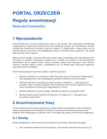 PORTAL ORZECZEŃ Reguły anonimizacji Wersja z dnia 19 czerwca 2012 r. 1 Wprowadzenie Anonimizacja jest to proces przetwarzania treści w taki sposób, aby uniemożliwić identyfikację występujących w dokumencie osób fizycznych (a dokładniej, sprawić, by ta identyfikacja nie była możliwa bez "nadmiernych kosztów, czasu lub działań"). Z drugiej strony, należy starać się, by zanonimizowany dokument w jak największym stopniu zachował swoją czytelność i nie zgubił żadnych treści natury ogólnej. Należy zwrócić uwagę, że pewne informacje bardzo często umożliwiają łatwą identyfikację osób fizycznych, w związku z powyższym powinny one z zasady być usuwane z anonimizowanych dokumentów. Są to między innymi: imiona, nazwiska, adresy osób fizycznych, dane różnych instytucji, różnego rodzaju numery i identyfikatory, etc. W dalszej części dokumentu będziemy doprecyzowywać te kategorie. Anonimizacja polega na wykonaniu jednej z czterech czynności: Zamianie całej frazy na pojedynczy inicjał. Stosujemy ją przy anonimizacji miejscowości i nazw geograficznych oraz występujących samotnie w tekście imion lub nazwisk. Zamiana całej frazy na pojedynczy inicjał, po którym następuje (...). Stosujemy ją w przypadku nazw urządzeń, pojazdów oraz handlowych nazw różnych substancji czy też innych produktów, w sytuacji gdy mają więcej niż 1 wyraz. Zamiana całej frazy na parę inicjałów. Stosujemy ją jedynie w przypadku osób. Zamiana pojedynczych wyrazów lub dłuższych ich ciągów na (...). Stosujemy ją w pozostałych przypadkach. 2 Anonimizowane frazy W celu ułatwienia anonimizacji sporządzone zostały bardziej szczegółowe zasady, wg których należy przeprowadzać anonimizację. W kolejnych podpunktach wymienione zostaną różne kategorie fraz występujących w tekście, wraz z informacją, jak należy z tymi frazami postępować. 2.1 Osoby Osoby występujące w treści orzeczenia zamieniane są na inicjały. Stosowane są reguły: imię i nazwisko zamieniane są na inicjały np. Jan Kowalski anonimizowany jest do J. K. jeżeli we frazie występuje więcej imion bądź nazwisk, brane są pod uwagę tylko pierwsze imię i ostatnie nazwisko np. Jan Marian Kowalski-Nowak anonimizowany jest do J. N. jeżeli w tekście występuje więcej osób o tych samych inicjałach, w zanonimizowanej wersji pojawiają się liczby pomagające określić, której z nich dotyczy dany fragment. Przykładowo tekst Jan Kowalski oraz Jakub Konieczny założyli spółkę. Przewodniczącym został Jan Kowalski. anonimizowany jest do J. K. (1) oraz J. K. (2) założyli spółkę. Przewodniczącym został J. K. (1). jeżeli w tekście występuje pojedyncze imię, bądź nazwisko, w zanonimizowanej wersji powinny pojawić się pojedyncze inicjały. Przykładowo tekst Jan oraz Tomasz poszli w odwiedziny do państwa Wróblewskich. anonizowany jest do J. oraz T. poszli w odwiedziny do państwa W.. Takich pojedynczych inicjałów nie numerujemy. WYJĄTEK 1: Anonimizacji nie są poddawani następujący urzędnicy państwowi: sędziowie składu orzekającego protokolant prokurator komornik sądowy WYJĄTEK 2: Anonimizacji nie są poddawani autorzy cytowanych książek, komentarzy, glos oraz artykułów naukowych. 2.2 Miejscowości Miejscowości występujące w treści orzeczeń zamieniane są na pojedynczy inicjał. W przypadku, gdy nazwa miejscowości składa się z kilku wyrazów, tak jak np. Kąty Wrocławskie, w zanonimizowanej wersji pojawia się inicjał tylko pierwszego z nich. WYJĄTEK 1: Anonimizacji nie podlegają miasta opisujące siedzibę sądu, na przykład fraza Sąd Apelacyjny we Wrocławiu nie podlega anonimizacji. WYJĄTEK 2: Anonimizacji nie podlegają miasta określające miejsce wydania nieanonimizowanej książki. 2.3 Inne Nazwy geograficzne Przymiotniki związane z nazwami geograficznymi zmieniane są na (...). W szczególności dotyczy to województw i powiatów. Rzeczownikowe nazwy geograficzne, pisane wielką literą, zamieniane są, tak jak miejscowości, na pojedynczy inicjał. Dotyczy to między innymi rzek, jezior, szczytów górskich oraz dzielnic miast. Natomiast w nazwach dróg ich numery (i inne oznaczenia) zamieniamy na (...) 2.4 Firmy, spółki, spółdzielnie, lokale usługowe W nazwach firm, spółek, spółdzielni występujących w treści orzeczenia, wszystkie nazwy własne oraz słowa mogące posłużyć do zidentyfikowania danej organizacji zamieniane są na ciąg „(...)”. Pozostają jedynie określenia organizacyjno-prawne, takie jak: typy spółek np. spółka z ograniczoną odpowiedzialnością, spółka jawna, spółka cywilna, typy przedsiębiorstwa, np. przedsiębiorstwo produkcyjno-handlowo-usługowe, skróty: s. a., sp. z o. o. 2.5 Organizacje, fundacje, instytucje Organizacje, fundacje i instytucje anonimizowane są podobnie jak firmy, spółki, spółdzielnie (patrz punkt poprzedni). Obowiązuje tu jednak szereg wyjątków: Nie anonimizujemy nazw organów, urzędów oraz instytucji publicznych (choć anonimizujemy informację o miejscu, w którym znajduje się ten urząd lub organ) Nie anonimizujemy nazw organizacji międzynarodowych, których członkami są państwa (na przykład Światowa Organizacja Zdrowia, Międzynarodowy Fundusz Walutowy, UNESCO) Nie anonimizujemy nazw organizacji ustalających różnego rodzaju normy, takich jak: American National Standards Institute, Polski Komitet Normalizacyjny, ... Nie anonimizujemy Polskiej Akademii Nauk i analogicznych instytucji z innych krajów Nie anonimizujemy rodzajowych nazw szkół wyższych, takich jak: Politechnika, Uniwersytet, Akademia Medyczna, Akademia Wychowania Fizycznego, Akademia Muzyczna, Akademia Sztuk Pięknych. Nie anonimizujemy organów samorządu zawodowego (takich jak na przykład Naczelna Izba Lekarska, Krajowa Izba Biegłych Rewidentów, Naczelna Rada Adwokacka) Nie anonimizujemy nazw sądów, takich jak Sąd Rejonowy, Naczelny Sąd Adminis