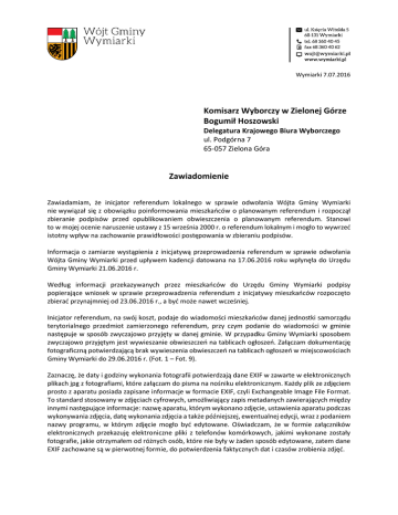 Wymiarki 7.07.2016 Komisarz Wyborczy w Zielonej Górze Bogumił Hoszowski Delegatura Krajowego Biura Wyborczego ul. Podgórna 7 65-057 Zielona Góra Zawiadomienie Zawiadamiam, że inicjator referendum lokalnego w sprawie odwołania Wójta Gminy Wymiarki nie wywiązał się z obowiązku poinformowania mieszkańców o planowanym referendum i rozpoczął zbieranie podpisów przed opublikowaniem obwieszczenia o planowanym referendum. Stanowi to w mojej ocenie naruszenie ustawy z 15 września 2000 r. o referendum lokalnym i mogło to wywrzeć istotny wpływ na zachowanie prawidłowości postępowania w zbieraniu podpisów. Informacja o zamiarze wystąpienia z inicjatywą przeprowadzenia referendum w sprawie odwołania Wójta Gminy Wymiarki przed upływem kadencji datowana na 17.06.2016 roku wpłynęła do Urzędu Gminy Wymiarki 21.06.2016 r. Według informacji przekazywanych przez mieszkańców do Urzędu Gminy Wymiarki podpisy popierające wniosek w sprawie przeprowadzenia referendum z inicjatywy mieszkańców rozpoczęto zbierać przynajmniej od 23.06.2016 r., a być może nawet wcześniej. Inicjator referendum, na swój koszt, podaje do wiadomości mieszkańców danej jednostki samorządu terytorialnego przedmiot zamierzonego referendum, przy czym podanie do wiadomości w gminie następuje w sposób zwyczajowo przyjęty w danej gminie. W przypadku Gminy Wymiarki sposobem zwyczajowo przyjętym jest wywieszanie obwieszczeń na tablicach ogłoszeń. Załączam dokumentację fotograficzną potwierdzającą brak wywieszenia obwieszczeń na tablicach ogłoszeń w miejscowościach Gminy Wymiarki do 29.06.2016 r. (Fot. 1 – Fot. 9). Zaznaczę, że daty i godziny wykonania fotografii potwierdzają dane EXIF w zawarte w elektronicznych plikach jpg z fotografiami, które załączam do pisma na nośniku elektronicznym. Każdy plik ze zdjęciem prosto z aparatu posiada zapisane informacje w formacie EXIF, czyli Exchangeable Image File Format. To standard stosowany w zdjęciach cyfrowych, umożliwiający zapis metadanych zawierających między innymi następujące informacje: nazwę aparatu, którym wykonano zdjęcie, ustawienia aparatu podczas wykonywania zdjęcia, datę wykonania zdjęcia a także późniejszej, ewentualnej edycji, wraz z podaniem nazwy programu, w którym zdjęcie mogło być edytowane. Oświadczam, że w formie załączników elektronicznych przekazuję elektroniczne pliki z telefonów komórkowych, jakimi wykonane zostały fotografie, jakie otrzymałem od różnych osób, które nie były w żaden sposób edytowane, zatem dane EXIF zachowane są w pierwotnej formie, do potwierdzenia faktycznych dat i czasów zrobienia zdjęć. Pierwsze obwieszczenie o zamiarze przeprowadzenia referendum pojawiło się na tablicy ogłoszeń przed urzędem Gminy w Wymiarkach w dniu 28.06.2016 roku około południa (fot. 10). Kolejne ogłoszenia zawisły na kilku innych tablicach w miejscowościach Gminy Wymiarki dopiero kilka dni później - po 29.06.2016 roku. Tymczasem jeden z inicjatorów referendum, pan Jerzy Niezgócki odwiedzając mieszkania prywatne w celu zbierania podpisów odwiedził między innymi dom pana XXXXXXXXXX zamieszkałego w Witoszynie i spotkał się z odmową udzielenia poparcia. Miało to miejsce 23.06.2016 r. lub 24.06.2016 r. Pan XXXXXXXXXX zwrócił uwagę na to, że podpisy zbierane są przed umieszczeniem obwieszczeń o zamiarze przeprowadzenia referendum. Nie jest mi znana ilość domostw odwiedzonych przez pana Jerzego Niezgóckiego i ilość ewentualnie zebranych podpisów w tym czasie. Zbieranie podpisów w mieszkaniach prywatnych w kilku miejscowościach Gminy Wymiarki w dniach od 23.06. 2016 r. do 29.06.2016 r. prowadziło w imieniu inicjatorów referendum jeszcze kilka osób, na co wskazywały przekazywane mi przez mieszkańców gminy ustne relacje. 27.06.2016 r., a zatem przed wywieszeniem obwieszczeń o zamiarze przeprowadzenia referendum, pan Jan Babiarz, mieszkaniec gminy, prezes OSP Wymiarki, niewymieniony wśród inicjatorów przeprowadzenia referendum, pozostawił w placówce Banku Spółdzielczego w Iłowej Oddział w Wymiarkach jednej z pracownic tejże placówki listy do zbierania podpisów na rzecz poparcia referendum. Według kilku informacji przekazanych przez mieszkańców jedna z osób, uzyskała od pracownicy banku swój numer PESEL do uzupełnienia listy. Nie jest znana ewentualna liczba podpisów, jakie zebrano w tym miejscu. Informacja o zdarzeniu została przekazana do zarządu Banku Spółdzielczego w Iłowej 28.06.2016 r. przez Wójta Gminy Wymiarki z prośbą o potwierdzenie. W tym samym dniu telefoniczną informację potwierdzającą zdarzenie wraz z wyjaśnieniami Wójtowi Gminy Wymiarki przekazała, w związku z nieobecnością Prezesa Jana Feduszczaka, pracownica Banku Spółdzielczego w Iłowej, która poinformowała również, że Zarząd Banku nie wiedział o zamiarze zbierania podpisów w placówce i nie wyrażał też pracownicy zgody na zbieranie podpisów w swojej placówce. Potwierdzono informację, że listę do zbierania podpisów dostarczył do oddziału Banku w Wymiarkach pan Jan Babiarz, który zabrał listę 28.06.2016 r. 29.06.2016 roku w rozmowie telefonicznej z Wójtem Gminy Wymiarki Wojciechem Olszewskim przebieg zdarzenia wraz z przekazaną wcześniej informacją potwierdził prezes Banku Spółdzielczego w Iłowej Jan Feduszczak. Potwierdzenie wskazanych wyżej okoliczności można uzyskać w Banku Spółdzielczym w Iłowej, ul. Kolejowa 4, 68-120 Iłowa, tel. 68 360 03 45. Równocześnie w poniedziałek 27.06.2016 r. do Urzędu Gminy Wymiarki mieszkańcy przekazywali informację, że podpisy podczas weekendu – od 24.06 do 26.06.2016 r. - zbierał pan Jan Babiarz przed cmentarzem komunalnym w Witoszynie, namawiając usilnie ludzi odwiedzających groby bliskich do poparcia inicjatywy referendum. Zgłaszający to mieszkańcy uznawali zdarzenie za niestosowne działanie mogące mieć odzwierciedlenie w naruszeniu przepi