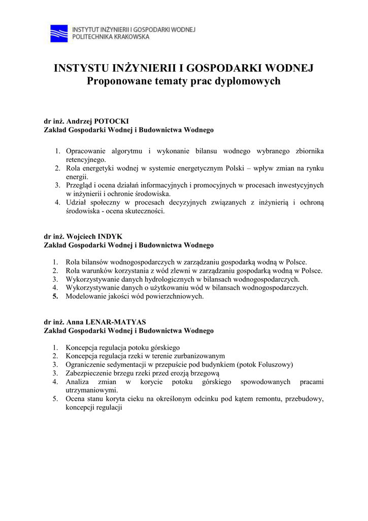 INSTYSTU INŻYNIERII I GOSPODARKI WODNEJ Proponowane