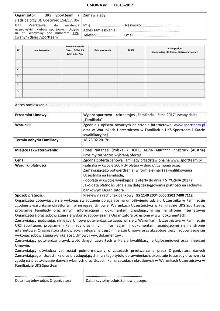 UMOWA nr ___/2016-2017 Organizator: UKS Sportteam z Zamawiający: siedzibą przy Ul. Gościniec 154/17, 05077 Warszawa, do ewidencji Imię:.............................. Nazwisko:.................................... uczniowskich klubów sportowych Urzędu Adres zamieszkania: ............................................................ m. st. Warszawy pod numerem 439, Telefon:......................... Email:........................................... zwanym dalej „Sportteam” LP. Imię i nazwisko Rozmiar koszulki 5-6lat, 7-8lat, XS S, M, L, XL, XXL Data urodzenia PESEL Narty-poziom początkujący/doskonalenie/zaawansowany 1 2 3 4 5 Adres zamieszkania: .................................................................................................................................................... Przedmiot Umowy: Warunki: Termin odbycia Familiady: Wyjazd sportowo – rekreacyjny „Familiada – Zima 2017” zwany dalej „Familiada” Zgodnie z opisem zawartym na stronie internetowej www.sportteam.pl oraz w Warunkach Uczestnictwa w Familiadzie UKS Sportteam i Karcie Kwalifikacyjnej 18-25.02.2017r. Miejsce zakwaterowania: Hotel Natanael (Polska) / HOTEL ALPINPARK**** Innsbruck (Austria) Prosimy zaznaczyć wybraną ofertę! Cena: Zgodna z ofertą cenową Familiady przedstawioną na www.sportteam.pl Warunki płatności -zaliczka w kwocie 500 PLN płatna w dniu otrzymania przez Zamawiającego potwierdzenia (w formie e-mail) zakwalifikowania Uczestnika na Familiadę, - dopłata w kwocie wynikającej z oferty do dnia 7 STYCZNIA 2017 r. Jako datę płatności uznaje się datę zaksięgowania płatności na rachunku bankowym Organizatora Sposób płatności: Przelew na rachunek bankowy: 95 1140 2004 0000 3502 7400 7112 Organizator zobowiązuje się wykonać świadczenie polegające na umożliwieniu udziału Uczestnika w Familiadzie zgodnie z warunkami określonymi w niniejszej Umowie, Warunkach Uczestnictwa w Familiadzie UKS Sportteam, programie Familiady oraz innymi informacjami i dokumentami znajdującymi się na stronie internetowej Organizatora oraz zobowiązuje się wykonać zobowiązania Organizatora określone w ww. dokumentach. Zamawiający podpisując niniejszą Umowę potwierdza, że zapoznał się z Warunkami Uczestnictwa w Familiadzie UKS Sportteam, programem Familiady oraz innymi informacjami i dokumentami znajdującymi się na stronie internetowej Organizatora stanowiących integralną część niniejszej Umowy oraz akceptuje treść i zobowiązuje się wykonać zobowiązania wynikające z Umowy i ww. dokumentów . Zamawiający potwierdza prawdziwość danych zawartych w Karcie kwalifikacyjnej/zgłoszeniowej oraz niniejszej Umowie. Zamawiający oświadcza że, został poinformowany o zasadach przetwarzania przez Organizatora danych Zamawiającego i Uczestnika oraz przysługujących mu z tego tytułu uprawnieniach, akceptuje te zasady oraz wyraża zgodę na przetwarzanie danych własnych oraz Uczestnika na zasadach określonych w Warunkach Uczestnictwa w Familiadzie UKS Sportteam. ....................................................... Data i czytelny odpis Organizatora ....................................................... Data i czytelny odpis Zamawiającego: