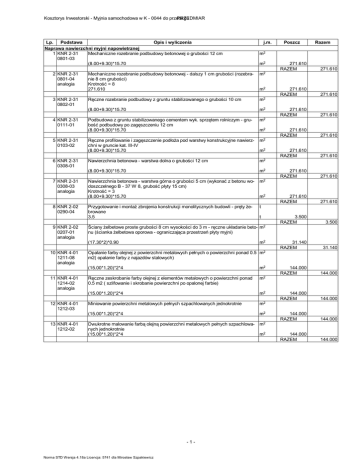 Kosztorys Inwestorski - Myjnia samochodowa w K - 0044 do przetargu PRZEDMIAR Lp. Podstawa Opis i wyliczenia Naprawa nawierzchni myjni napowietrznej 1 KNR 2-31 Mechaniczne rozebranie podbudowy betonowej o grubości 12 cm 0801-03 (8.00+9.30)*15.70 2 KNR 2-31 0801-04 analogia 3 KNR 2-31 0802-01 4 KNR 2-31 0111-01 5 KNR 2-31 0103-02 6 KNR 2-31 0308-01 7 KNR 2-31 0308-03 analogia 8 KNR 2-02 0290-04 9 KNR 2-02 0207-01 analogia 11 KNR 4-01 1214-02 analogia 12 KNR 4-01 1212-03 13 KNR 4-01 1212-02 Poszcz Razem m2 m2 Mechaniczne rozebranie podbudowy betonowej - dalszy 1 cm grubości (rozebranie 8 cm grubości) Krotność = 8 271.610 m2 Ręczne rozebranie podbudowy z gruntu stabilizowanego o grubości 10 cm m2 (8.00+9.30)*15.70 m2 Podbudowa z gruntu stabilizowanego cementem wyk. sprzętem rolniczym - grubość podbudowy po zagęszczeniu 12 cm (8.00+9.30)*15.70 m2 Ręczne profilowanie i zagęszczenie podłoża pod warstwy konstrukcyjne nawierzchni w gruncie kat. III-IV (8.00+9.30)*15.70 m2 Nawierzchnia betonowa - warstwa dolna o grubości 12 cm m2 (8.00+9.30)*15.70 m2 Nawierzchnia betonowa - warstwa górna o grubości 5 cm (wykonać z betonu wodoszczelnego B - 37 W 8, grubość płyty 15 cm) Krotność = 3 (8.00+9.30)*15.70 m2 Przygotowanie i montaż zbrojenia konstrukcji monolitycznych budowli - pręty żebrowane 3.5 t m2 m2 m2 m2 t 271.610 RAZEM 271.610 271.610 RAZEM 271.610 271.610 RAZEM 271.610 271.610 RAZEM 271.610 271.610 RAZEM 271.610 271.610 RAZEM 271.610 271.610 RAZEM 271.610 3.500 RAZEM 3.500 31.140 RAZEM 31.140 144.000 RAZEM 144.000 144.000 RAZEM 144.000 144.000 RAZEM 144.000 144.000 RAZEM 144.000 Ściany żelbetowe proste grubości 8 cm wysokości do 3 m - ręczne układanie beto- m2 nu (ścianka żelbetowa oporowa - ograniczająca przestrzeń płyty myjni) m2 (17.30*2)*0.90 10 KNR 4-01 1211-08 analogia j.m. Opalanie farby olejnej z powierzchni metalowych pełnych o powierzchni ponad 0.5 m2 m2( opalanie farby z najazdów stalowych) (15.00*1.20)*2*4 m2 Ręczne zeskrobanie farby olejnej z elementów metalowych o powierzchni ponad 0.5 m2 ( szlifowanie i skrobanie powierzchni po opalonej farbie) m2 (15.00*1.20)*2*4 m2 Miniowanie powierzchni metalowych pełnych szpachlowanych jednokrotnie m2 (15.00*1.20)*2*4 m2 Dwukrotne malowanie farbą olejną powierzchni metalowych pełnych szpachlowanych jednokrotnie (15.00*1.20)*2*4 m2 -1- Norma STD Wersja 4.18a Licencja: 5741 dla Mirosław Szpakiewicz m2