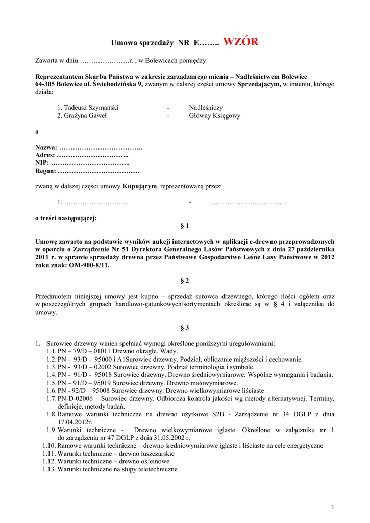 Umowa sprzedaży NR E…….. WZÓR Zawarta w dniu ………………….r. , w Bolewicach pomiędzy: Reprezentantem Skarbu Państwa w zakresie zarządzanego mienia – Nadleśnictwem Bolewice 64-305 Bolewice ul. Świebodzińska 9, zwanym w dalszej części umowy Sprzedającym, w imieniu, którego działa: 1. Tadeusz Szymański 2. Grażyna Gaweł Nadleśniczy Główny Księgowy - a Nazwa: ………………………………. Adres: ………………………….. NIP: …………………………….. Regon: ……………………………… zwaną w dalszej części umowy Kupującym, reprezentowaną przez: 1. ………………………. - …………………………… o treści następującej: §1 Umowę zawarto na podstawie wyników aukcji internetowych w aplikacji e-drewno przeprowadzonych w oparciu o Zarządzenie Nr 51 Dyrektora Generalnego Lasów Państwowych z dnia 27 października 2011 r. w sprawie sprzedaży drewna przez Państwowe Gospodarstwo Leśne Lasy Państwowe w 2012 roku znak: OM-900-8/11. §2 Przedmiotem niniejszej umowy jest kupno – sprzedaż surowca drzewnego, którego ilości ogółem oraz w poszczególnych grupach handlowo-gatunkowych/sortymentach określone są w § 4 i załączniku do umowy. §3 1. Surowiec drzewny winien spełniać wymogi określone poniższymi uregulowaniami: 1.1. PN – 79/D – 01011 Drewno okrągłe. Wady. 1.2. PN - 93/D - 95000 i A1Surowiec drzewny. Podział, obliczanie miąższości i cechowanie. 1.3. PN - 93/D – 02002 Surowiec drzewny. Podział terminologia i symbole. 1.4. PN - 91/D - 95018 Surowiec drzewny. Drewno średniowymiarowe. Wspólne wymagania i badania. 1.5. PN – 91/D – 95019 Surowiec drzewny. Drewno małowymiarowe. 1.6. PN - 92/D – 95008 Surowiec drzewny. Drewno wielkowymiarowe liściaste 1.7. PN-D-02006 – Surowiec drzewny. Odbiorcza kontrola jakości wg metody alternatywnej. Terminy, definicje, metody badań. 1.8. Ramowe warunki techniczne na drewno użytkowe S2B - Zarządzenie nr 34 DGLP z dnia 17.04.2012r. 1.9. Warunki techniczne Drewno wielkowymiarowe iglaste. Określone w załączniku nr 1 do zarządzenia nr 47 DGLP z dnia 31.05.2002 r. 1.10. Ramowe warunki techniczne – drewno średniowymiarowe iglaste i liściaste na cele energetyczne 1.11. Warunki techniczne – drewno łuszczarskie 1.12. Warunki techniczne – drewno okleinowe 1.13. Warunki techniczne na słupy teletechniczne 1 1.14. Tymczasowe zasady odbioru i ewidencji drewna kłodowanego iglastego określone w załączniku nr 1 do Zarządzenia nr 35 Dyrektora Generalnego Lasów Państwowych z dnia 14.05.2004 r. (w/w warunki i wymogi nie mają zastosowania w zakresie nie dotyczącym przedmiotu sprzedaży) lub według innych warunków/ustaleń, które winny być załącznikiem do niniejszej umowy, będących następstwem zapisów zamieszczonych na portalu e-drewno w polu „pokaż opis” lub sytuacji określonej w pkt 2 niniejszego paragrafu. 2. Na daną grupę handlowo – gatunkową w jednostce realizującej sprzedaż obowiązują jednolite normy/warunki techniczne. Żądanie przez „Kupującego” podwyższenia lub obniżenia jakości lub zmiany wymiarów w stosunku do norm/warunków technicznych określonych przez Nadleśnictwo w aukcjach internetowych w aplikacji e-drewno (drewno z wyborem) w przypadku możliwości realizacji przez Sprzedającego będzie skutkowało zmianą cen surowca drzewnego. Zmiana taka będzie następstwem negocjacji cenowej, przeprowadzonej pomiędzy Sprzedającym i Kupującym zaakceptowanej przez Dyrektora RDLP Szczecin. 3. W przypadku żądania przez Kupującego zmiany warunków technicznych/norm w trakcie realizowania umowy zmiana taka może wejść w życie po przeprowadzonych negocjacjach cenowych i uzyskaniu akceptacji Dyrektora RDLP Szczecin oraz spisaniu stosownego aneksu do umowy. §4 1. Sprzedający – Nadleśnictwo sprzeda, a Kupujący zakupi w okresie od dnia …………….. r. do dnia ………. r., surowiec drzewny w łącznej wielkości ………………. m³. Grupy handlowo-gatunkowe, ilości i ceny wymienione są w załączniku do niniejszej umowy, który jest jej integralną częścią. 2. Załącznik, o którym mowa w ust. 1 dotyczy ilości surowca drzewnego zakupionego w ramach aukcji internetowych w aplikacji e-drewno na I półrocze 2012 roku. 3. Sprzedaż realizowana będzie w oparciu o poniższy harmonogramy HARMONOGRAM Całość surowca objętego umową zostanie przygotowana / odebrana w miesiącach: …………………. 2012r. 4. Strony umowy oświadczają, że realizacja niniejszej umowy w granicach +/- 5% masy surowca drzewnego określonej w § 4 ust 1 oznacza jej wykonanie. 5. Przeznaczone do sprzedaży drewno pochodzi w całości z certyfikowanych obszarów leśnych o prawidłowej gospodarce, sklasyfikowane jako surowiec czysty, co potwierdza certyfikat SGSFM/COC-000243, ważny do 15 kwietnia 2014 roku. 6. Termin końcowy wskazany w ust. 1 jest terminem końcowym obowiązywania umowy. 7. W celu umożliwienia „Sprzedającemu” terminowej realizacji umowy ustala się, że przedpłaty na drewno będą dokonywane z takim wyprzedzeniem, aby umożliwiły „Sprzedającemu” realizację sprzedaży przed terminem końcowym obowiązywania umowy. Kwoty przedpłat za surowiec, który nie zostanie fizycznie odebrany w ww. terminie zostaną niezwłocznie zwrócone „Kupującemu”. 8. Upływ terminu obowiązywania umowy nie wyłącza prawa stron do naliczenia wymagalnych kar umownych opisanych w niniejszej umowie. 2 §5 1. Surowiec będzie odbierany/wydawany zgodnie z harmonogramami ustalonymi przez Kupującego i Sprzedającego. 2. W przypadku braku odrębnych uregulowań dot. harmonogramów strony umowy przyjmują, że będzie ona realizowana proporcjonalnie do upływu czasu, a niniejszy zapis wypełnia obowiązek spisania harmonogramów. 3. Zmiany ustalonego harmonogramu wymagają formy pisemnej i są możliwe do wprowadzenia za zgodą stron. 4. Harmonogram uważa się za zrealizowany,