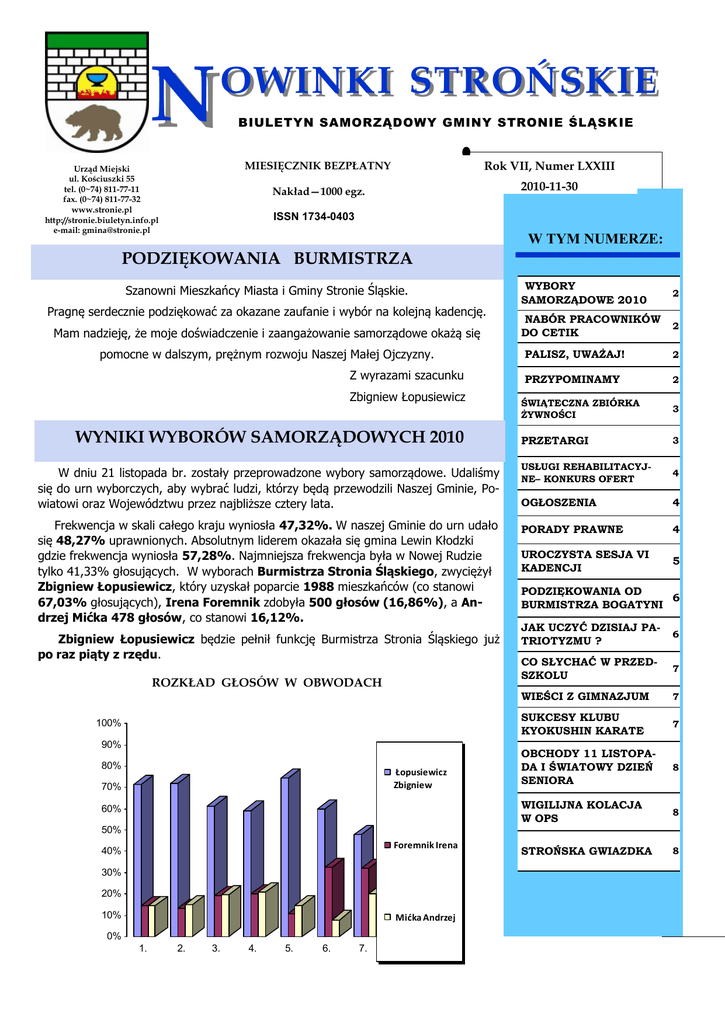 N OWINKI STROŃSKIE Urząd Miejski ul. Kościuszki 55 tel. (0~74) 811-77-11 fax. (0~74) 811-77-32 www.stronie.pl http://stronie.biuletyn.info.pl e-mail: [email protected] BIULETYN SAMORZĄDOWY GMINY STRONIE ŚLĄSK IE MIESIĘCZNIK BEZPŁATNY Rok VII, Numer LXXIII Nakład—1000 egz. 2010-11-30 ISSN 1734-0403 W TYM NUMERZE: PODZIĘKOWANIA BURMISTRZA Szanowni Mieszkańcy Miasta i Gminy Stronie Śląskie. Pragnę serdecznie podziękować za okazane zaufanie i wybór na kolejną kadencję. Mam nadzieję, że moje doświadczenie i zaangażowanie samorządowe okażą się pomocne w dalszym, prężnym rozwoju Naszej Małej Ojczyzny. Z wyrazami szacunku Zbigniew Łopusiewicz WYNIKI WYBORÓW SAMORZĄDOWYCH 2010 W dniu 21 listopada br. zostały przeprowadzone wybory samorządowe. Udaliśmy się do urn wyborczych, aby wybrać ludzi, którzy będą przewodzili Naszej Gminie, Powiatowi oraz Województwu przez najbliższe cztery lata. Frekwencja w skali całego kraju wyniosła 47,32%. W naszej Gminie do urn udało się 48,27% uprawnionych. Absolutnym liderem okazała się gmina Lewin Kłodzki gdzie frekwencja wyniosła 57,28%. Najmniejsza frekwencja była w Nowej Rudzie tylko 41,33% głosujących. W wyborach Burmistrza Stronia Śląskiego, zwyciężył Zbigniew Łopusiewicz, który uzyskał poparcie 1988 mieszkańców (co stanowi 67,03% głosujących), Irena Foremnik zdobyła 500 głosów (16,86%), a Andrzej Mićka 478 głosów, co stanowi 16,12%. Zbigniew Łopusiewicz będzie pełnił funkcję Burmistrza Stronia Śląskiego już po raz piąty z rzędu. ROZKŁAD GŁOSÓW W OBWODACH 100% 90% 80% Łopusiewicz Zbigniew 70% 60% 50% Foremnik Irena 40% 30% 20% 10% Mićka Andrzej 0% 1. 2. 3. 4. 5. 6. 7. WYBORY SAMORZĄDOWE 2010 2 NABÓR PRACOWNIKÓW DO CETIK 2 PALISZ, UWAŻAJ! 2 PRZYPOMINAMY 2 ŚWIĄTECZNA ZBIÓRKA ŻYWNOŚCI 3 PRZETARGI 3 USŁUGI REHABILITACYJNE– KONKURS OFERT 4 OGŁOSZENIA 4 PORADY PRAWNE 4 UROCZYSTA SESJA VI KADENCJI 5 PODZIĘKOWANIA OD 6 BURMISTRZA BOGATYNI JAK UCZYĆ DZISIAJ PATRIOTYZMU ? 6 CO SŁYCHAĆ W PRZEDSZKOLU 7 WIEŚCI Z GIMNAZJUM 7 SUKCESY KLUBU KYOKUSHIN KARATE 7 OBCHODY 11 LISTOPADA I ŚWIATOWY DZIEŃ SENIORA 8 WIGILIJNA KOLACJA W OPS 8 STROŃSKA GWIAZDKA 8 ROK VII, NUMER LXXIII STR. 2 WYBORY SAMORZĄDOWE 2010 Wyniki wyborów do Rady Miejskiej w Stroniu Śląskim Nr okręgu Imię i nazwisko Liczba otrzymanych % w skali okręgu 1 Wiktor Ryszard 285 48,22% 1 Węgrzyn Jerzy Mirosław 127 21,49% 1 Najduch Cyprian Kamil 117 19,80% 2 Pakuła Zdzisław Józef 180 28,89% 2 Laskowska Magdalena 130 20,87% 2 Ryczek Wiesław Andrzej 276 44,30% 3 Dobrowolski Stanisław 78 63,41% 4 Czerwińska Wiesława 92 25,63% 4 Janiszewska Gabriela 126 35,10% 5 Florowski Jan 174 45,08% 5 Suliński Ryszard 92 23,83% 6 Linde Roman Zenobiusz 52 33,12% 7 Grzelak Katarzyna Anna 73 33,80% 8 Frodyma Zbigniew Paweł 145 50,70% 9 Gulij Dariusz Jerzy 143 71,50% NABÓR PRACOWNIKÓW DO CETiK Dyrektor Centrum Edukacji, Turystyki i Kultury w Stroniu Śląskim OGŁASZA NABÓR KANDYDATÓW na poszczególne stanowiska pracy: 1. GŁÓWNY KSIĘGOWY INSTYTUCJI KULTURY, 2. SPECJALISTA DS.ORGANIZACJI I PROMOCJI PROJEKTÓW, 3. SPECJALISTA DS.ORGANIZACJI I PROMOCJI IMPREZ. SZCZEGÓŁOWE INFORMACJE DOSTĘPNE SĄ na www.stronie.pl oraz na tablicy ogłoszeń w Urzędzie Miejskim PRZYPOMINAMY Zbliża się termin płatności czynszów dzierżawnych: ● Do 15.XII.2010r.– grunty rolne i ogrody przydomowe ● Do 25.XII.2010r.— garaże komórki i inne. W wyborach do Sejmiku Województwa Dolnośląskiego z naszego okręgu (nr 3) mandat otrzymało 9 kandydatów (na 36 wszystkich mandatów). Przez najbliższe cztery lata reprezentować nas będą Dyduch Marek, Longawa Stanisław, Gromadzka Dorota, Szczygieł Zbigniew, Golak Julian, Sosiński Piotr, Goszyńska Elżbieta, Tutaj Jerzy oraz Wild Patryk. W Radzie Powiatu Kłodzkiego (29 mandatów), z okręgu nr 7 mandat otrzymali Kazimierz Drożdż, Borysław Zatoka oraz Bogusław Wijatyk. Zdobyli oni odpowiednio 1115, 527 i 400 głosów. W tym miejscu chcielibyśmy również pogratulować nowo wybranym radnym. Życzymy im wytrwałości w podejmowaniu rozsądnych decyzji dla przyszłości Gminy Stronie Śląskie, a tym którzy zakończyli kadencję, składamy serdeczne podziękowania za wkład jaki włożyli w rozwój Naszej Gminy. PALISZ, UWAŻAJ! 15 listopada weszła w życie nowelizacja ustawy antynikotynowej, która wprowadza zakaz palenia m.in. na placach zabaw, na przystankach komunikacji miejskiej i w środkach publicznego transportu. Nowelizacja ustawy antynikotynowej objęła również zakazem palenia szkoły, zakłady opieki zdrowotnej, placówki oświaty, wypoczynku i kultury oraz budynki tworzące obiekty sportowe. Zakaz palenia obowiązuje też w lokalach gastronomiczno-rozrywkowych dysponujących jedną salą. Ponadto rozporządzeniem ministra spraw wewnętrznych i administracji rozszerzone zostały kompetencje strażników miejskich, którzy za złamanie zakazu mogą nałożyć mandat (kara grzywny do 500zł.) Może czas najwyższy zastanowić się nad całkowitym rzuceniem palenia. Można zaoszczędzić nie tylko zdrowie, również pieniądze. ROK VII, NUMER LXXIII STR. 3 ŚWIĄTECZNA ZBIÓRKA ŻYWNOŚCI 3- 4 GRUDNIA Ogólnopolska Świąteczna Zbiórka Żywności odbędzie się również w Stroniu Śląskim w dniach 03. i 04. grudnia (piątek i sobota) 2010 roku. Zbiórka przeprowadzona zostanie w specjalnie oznakowanych sklepach, w których to wolontariusze - uczniowie z Gimnazjum w Stroniu Śląskim posiadający imienny identyfikator będą zbierali żywność. Zbiórka będzie nadzorowana przez pracowników Stowarzyszenia Aktywizacji Integracji Społecznej w Stroniu Śląskim. Zebrana żywność zostanie przekazana do najbardziej potrzebujących rodzin w naszej Gminie. PRZETARGI Burmistrz Stronia Śląskiego ogłasza Gminy Stronie Śląskie: przetargi ustne nieograniczone na sprzedaż n/w nieruchomości , stanowiących własność I. Przetargi odbędą się w dniu 6 g