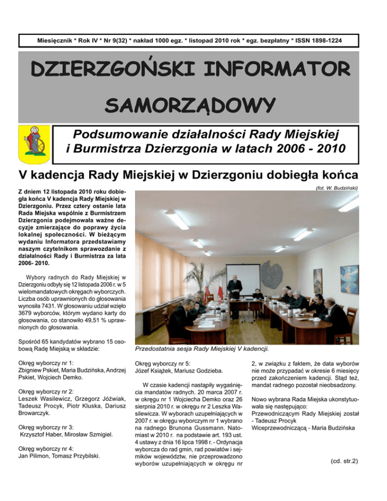 DZIERZGOŃSKI INFORMATOR SAMORZĄDOWY listopad 2010 Miesięcznik * Rok IV * Nr 9(32) * nakład 1000 egz. * listopad 2010 rok * egz. bezpłatny * ISSN 1898-1224 Podsumowanie działalności Rady Miejskiej i Burmistrza Dzierzgonia w latach 2006 - 2010 V kadencja Rady Miejskiej w Dzierzgoniu dobiegła końca (fot. W. Budziński) Z dniem 12 listopada 2010 roku dobiegła końca V kadencja Rady Miejskiej w Dzierzgoniu. Przez cztery ostanie lata Rada Miejska wspólnie z Burmistrzem Dzierzgonia podejmowała ważne decyzje zmierzające do poprawy życia lokalnej społeczności. W bieżącym wydaniu Informatora przedstawiamy naszym czytelnikom sprawozdanie z działalności Rady i Burmistrza za lata 2006- 2010. Wybory radnych do Rady Miejskiej w Dzierzgoniu odbyły się 12 listopada 2006 r. w 5 wielomandatowych okręgach wyborczych. Liczba osób uprawnionych do głosowania wynosiła 7431. W głosowaniu udział wzięło 3679 wyborców, którym wydano karty do głosowania, co stanowiło 49,51 % uprawnionych do głosowania. Spośród 65 kandydatów wybrano 15 osobową Radę Miejską w składzie: Okręg wyborczy nr 1: Zbigniew Pskiet, Maria Budzińska, Andrzej Pskiet, Wojciech Demko. Okręg wyborczy nr 2: Leszek Wasilewicz, Grzegorz Jóźwiak, Tadeusz Procyk, Piotr Kluska, Dariusz Browarczyk. Okręg wyborczy nr 3: Krzysztof Haber, Mirosław Szmigiel. Okręg wyborczy nr 4: Jan Pilimon, Tomasz Przybilski. Przedostatnia sesja Rady Miejskiej V kadencji. Okręg wyborczy nr 5: Józef Książek, Mariusz Godzieba. W czasie kadencji nastąpiły wygaśnięcia mandatów radnych. 20 marca 2007 r. w okręgu nr 1 Wojciecha Demko oraz 26 sierpnia 2010 r. w okręgu nr 2 Leszka Wasilewicza. W wyborach uzupełniających w 2007 r. w okręgu wyborczym nr 1 wybrano na radnego Brunona Gussmann. Natomiast w 2010 r. na podstawie art. 193 ust. 4 ustawy z dnia 16 lipca 1998 r. - Ordynacja wyborcza do rad gmin, rad powiatów i sejmików województw, nie przeprowadzono wyborów uzupełniających w okręgu nr 2, w związku z faktem, że data wyborów nie może przypadać w okresie 6 miesięcy przed zakończeniem kadencji. Stąd też, mandat radnego pozostał nieobsadzony. Nowo wybrana Rada Miejska ukonstytuowała się następująco: Przewodniczącym Rady Miejskiej został - Tadeusz Procyk Wiceprzewodniczącą - Maria Budzińska (cd. str.2) listopad 2010 DZIERZGOŃSKI INFORMATOR SAMORZĄDOWY V kadencja Rady Miejskiej... (cd. ze str.1) Komisje stałe Rady: 1.Komisja Rewizyjna: 1/ Maria Budzińska – Członek - do 5 grudnia 2006 r. 2/ Józef Książek – Przewodniczący Komisji 3/ Mirosław Szmigiel - Członek 4/ Piotr Kluska - Zastępca Przewodniczącego - od 5 grudnia 2006 r. 2.Komisja Rozwoju Gospodarczego i Budżetu: 1/ Andrzej Pskiet – Przewodniczący Komisji 2/ Leszek Wasilewicz – Zastępca Przewodniczącego do 25 sierpnia 2010 r. 3/ Wojciech Demko – Członek do 20 marca 2007r. 4/ Józef Książek - Członek 5/ Zbigniew Pskiet - Członek 6/ Dariusz Browarczyk - Członek od 10 lipca 2007r., Zastępca Przewodniczącego od 25 sierpnia 2010 r. 3.Komisja Rolnictwa i Ochrony Środowiska: 1/ Krzysztof Haber – Przewodniczący Komisji 2/ Jan Pilimon – Zastępca Przewodniczącego 3/ Grzegorz Jóźwiak - Członek 4/ Tomasz Przybilski - Członek 5 /Mirosław Szmigiel – Członek 4. Komisja Oświaty, Kultury, Ochrony Zdrowia i Bezpieczeństwa Publicznego: 1/ Wojciech Demko - Przewodniczący Komisji do 20 marca 2007r. 2/ Piotr Kluska - Członek, Przewodniczący Komisji od 20 marca 2007 r. 3/ Mariusz Godzieba – Zastępca Przewodniczącego 4/ Maria Budzińska – Członek 5/ Dariusz Michał Browarczyk – Członek do 10 lipca 2007 r. 6/ Brunon Bussmann - Członek od 10 lipca 2007 r. 5.Komisja Statutowa: 1/ Krzysztof Haber – Przewodniczący Komisji od 28.12.2006 r. 2/ Andrzej Pskiet – Zastępca ca Przewodniczącego 3/ Wojciech Demko - Członek do 15 lutego 2007 r. 4/ Mariusz Godzieba – Członek - od 15 lutego 2007 r. Działalność Rady i jej organów: Rada Miejska jako organ stanowiący i kontrolny zajmowała się sprawami należącymi do jej kompetencji, przede wszystkim: uchwalaniem budżetu gminy i rozpatrywaniem sprawozdań z jego działalności, uchwalaniem m.in. stawek podatków i opłat, programów gospodarczych takich jak: − gminne programy profilaktyki i rozwiązywania problemów alkoholowych, − przeciwdziałania narkomanii w gminie Dzierzgoń do 2014 r., − opieki nad zabytkami, − gospodarowania zasobem mieszkaniowym gminy Dzierzgoń do 2011 r., − Wieloletni Plan Inwestycyjny do 2013 r., − strategia ekoenergetycza do 2021 r., − system profilaktyki i opieki nad dzieckiem i rodziną do 2010 r., − system przeciwdziałania przemocy w rodzinie, − usuwania wyrobów zawierających azbest dla gminy Dzierzgoń do 2011 r., − współpracy gminy Dzierzgoń z organizacjami pozarządowymi i innymi podmiotami uprawnionymi prowadzącymi działalność pożytku publicznego, − wieloletni plan rozwoju i modernizacji urządzeń wodociągowych i kanalizacyjnych, − programy odnowy wsi. Rada podjęła uchwały pozwalające zrealizować miedzy innymi następujące projekty: − „Słoneczne Dachy dla Gminy Dzierzgoń”, − Lokalna Grupa Działania „ Kraina Dolnego Powiśla”, − „Od Przedszkola do Profesora”, − „Integracja społeczna i aktywizacja lokalna kluczem do wzrostu samooceny osób zagrożonych wykluczeniem społecznym", − Kampania promocyjnej ryb i produktów rybnych w Dzierzgoniu w ramach Sektorowego Programu Operacyjnego Rybołóstwo i Przetwórstwo Ryb, − „Akademia Samorządowca”, − „Uczeń na wsi”, − „Budowa i wyposażenie wiejskiego centrum kultury i rekreacji wraz z niezbędną infrastrukturą techniczną, zlokalizowanego w miejscowości Bruk, − „Architekci własnego krajobrazu", − „E- zespoły przedszkolne w powiecie sztumskim”, Ponadto Rada rozpatrywała sprawozdania i informacje jednostek organizacyjnych gminy. Wyrażała zgody na sprzedaż i nabycie nier