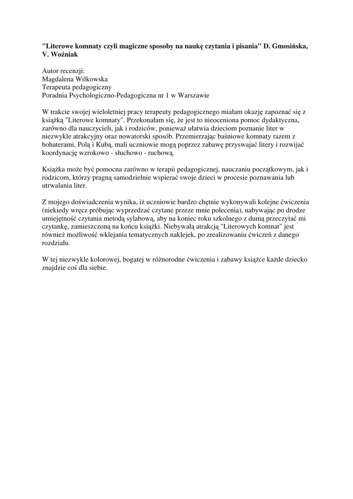 "Literowe komnaty czyli magiczne sposoby na naukę czytania i pisania" D. Gmosińska, V. Woźniak Autor recenzji: Magdalena Wilkowska Terapeuta pedagogiczny Poradnia Psychologiczno-Pedagogiczna nr 1 w Warszawie W trakcie swojej wieloletniej pracy terapeuty pedagogicznego miałam okazję zapoznać się z książką "Literowe komnaty". Przekonałam się, że jest to nieoceniona pomoc dydaktyczna, zarówno dla nauczycieli, jak i rodziców, ponieważ ułatwia dzieciom poznanie liter w niezwykle atrakcyjny oraz nowatorski sposób. Przemierzając baśniowe komnaty razem z bohaterami, Polą i Kubą, mali uczniowie mogą poprzez zabawę przyswajać litery i rozwijać koordynację wzrokowo - słuchowo - ruchową. Książka może być pomocna zarówno w terapii pedagogicznej, nauczaniu początkowym, jak i rodzicom, którzy pragną samodzielnie wspierać swoje dzieci w procesie poznawania lub utrwalania liter. Z mojego doświadczenia wynika, iż uczniowie bardzo chętnie wykonywali kolejne ćwiczenia (niekiedy wręcz próbując wyprzedzać czytane przeze mnie polecenia), nabywając po drodze umiejętność czytania metodą sylabową, aby na koniec roku szkolnego z dumą przeczytać mi czytankę, zamieszczoną na końcu książki. Niebywałą atrakcją "Literowych komnat" jest również możliwość wklejania tematycznych naklejek, po zrealizowaniu ćwiczeń z danego rozdziału. W tej niezwykle kolorowej, bogatej w różnorodne ćwiczenia i zabawy książce każde dziecko znajdzie coś dla siebie.