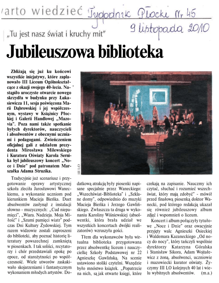 Jubileuszowa biblioteka Zbliżają się już ku końcowi wszystkie inicjatywy, które zapla nowało III Liceum Ogólnokształ cące z okazji swojego 40-lecia. Na- ' stąpiło uroczyste otwarcie nowego skrzydła w budynku przy Łuka siewicza 11, sesja poświęcona Ma rii Dąbrowskiej i jej współczes nym, wystawy w Książnicy Płoc kiej i Galerii Handlowej „Mazovia". Poza nami także spotkanie byłych dyrektorów, nauczycieli i absolwentów z obecnymi ucznia mi i pedagogami. Zwieńczeniem oficjalnej gali z udziałem prezy denta Mirosława Milewskiego i Kuratora Oświaty Karola Serni ka był jubileuszowy koncert „No ce i Dnie" pod patronatem Mar szałka Adama Struzika. Tradycyjnie już scenariusz i przy gotowanie oprawy artystycznej szkoła zleciła Jarosławowi Waneckiemu, a wykonanie uczniom pod kierunkiem Macieja Bieńka. Duet absolwentów zasłynął z instalacji słowno - muzycznych: „Cud niepa mięci", „Wiara. Nadzieja. Moja Mi łość" i „Szumi pamięci wiatr" pod czas Dni Kultury Żydowskiej. Tym razem widzowie zostali zaproszeni do biblioteki, aby poznać historię li teratury powszechnej zamkniętą w piosenkach. I tak soliści, recytato rzy i chór przedstawiali epokę po epoce, od starożytności po współ czesność. Wiele utworów zaskaki wało skojarzeniami i fantastycznym wykonaniem młodych artystów. Do datkową atrakcją były piosenki napi sane specjalnie przez Waneckiego: „Wszechświat-Biblioteka" i „Szkla ne domy", odpowiednio do muzyki Macieja Bieńka i Jerzego Gawliń skiego. Zwłaszcza ta druga w wyko naniu Karoliny Wiśniewskiej (absol wentki, która brała udział we wszystkich koncertach dwójki reali zatorów) wzruszyła gości. Tłem dla wykonawców była wir tualna biblioteka przygotowana przez absolwentkę liceum i nauczy cielkę Szkoły Podstawowej nr 22 Agnieszkę Gawlińską. Na scenie ustawiono stoliki czytelni. Wszędzie było mnóstwo książek. „Popatrzcie na nich, są jak otwarte księgi, które czekają na zapisanie. Nauczmy ich czytać, słuchać i rozumieć wszech świat, który mają zdobyć" - mówił przed finałową piosenką doktor Wanecki, pod którego redakcją ukazał się również jubileuszowy album zdjęć i wspomnień o liceum. Koncert i album połączyły tytuło we „Noce i Dnie" oraz owacyjnie przyjęty walc Agnieszki Osieckiej i Waldemara Kazaneckiego „Od no cy do nocy", który tańczyli wspólnie dyrektorzy Katarzyna Góralska i Stanisław Sikora, Adam Wojtałewicz z żoną, absolwenci, uczniowie i mazowiecki kurator oświaty. Ży czymy III LO kolejnych 40 lat i wie lu wybitnych absolwentów. (m.a.)