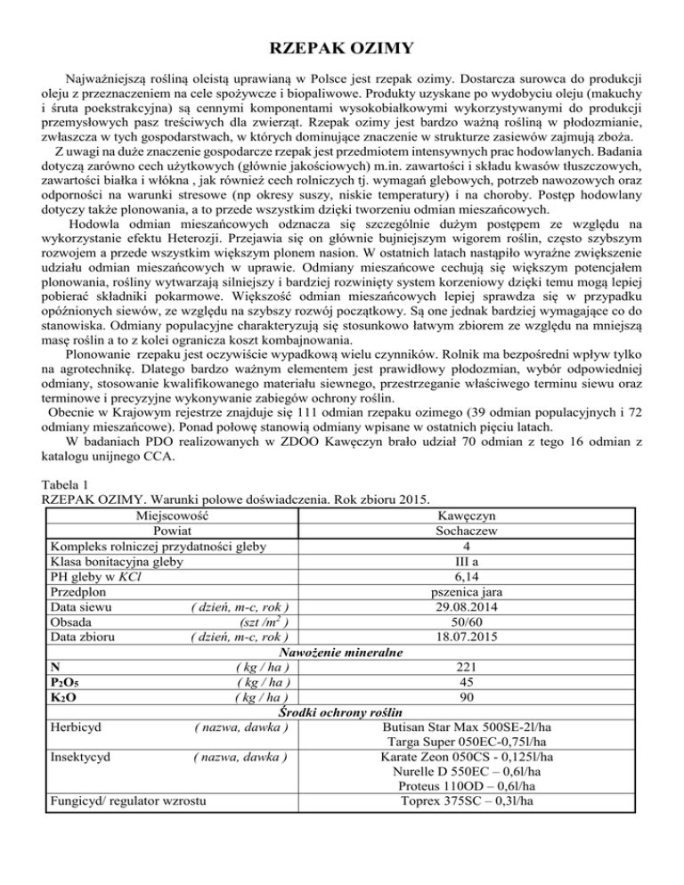 RZEPAK OZIMY Najważniejszą rośliną oleistą uprawianą w Polsce jest rzepak ozimy. Dostarcza surowca do produkcji oleju z przeznaczeniem na cele spożywcze i biopaliwowe. Produkty uzyskane po wydobyciu oleju (makuchy i śruta poekstrakcyjna) są cennymi komponentami wysokobiałkowymi wykorzystywanymi do produkcji przemysłowych pasz treściwych dla zwierząt. Rzepak ozimy jest bardzo ważną rośliną w płodozmianie, zwłaszcza w tych gospodarstwach, w których dominujące znaczenie w strukturze zasiewów zajmują zboża. Z uwagi na duże znaczenie gospodarcze rzepak jest przedmiotem intensywnych prac hodowlanych. Badania dotyczą zarówno cech użytkowych (głównie jakościowych) m.in. zawartości i składu kwasów tłuszczowych, zawartości białka i włókna , jak również cech rolniczych tj. wymagań glebowych, potrzeb nawozowych oraz odporności na warunki stresowe (np okresy suszy, niskie temperatury) i na choroby. Postęp hodowlany dotyczy także plonowania, a to przede wszystkim dzięki tworzeniu odmian mieszańcowych. Hodowla odmian mieszańcowych odznacza się szczególnie dużym postępem ze względu na wykorzystanie efektu Heterozji. Przejawia się on głównie bujniejszym wigorem roślin, często szybszym rozwojem a przede wszystkim większym plonem nasion. W ostatnich latach nastąpiło wyraźne zwiększenie udziału odmian mieszańcowych w uprawie. Odmiany mieszańcowe cechują się większym potencjałem plonowania, rośliny wytwarzają silniejszy i bardziej rozwinięty system korzeniowy dzięki temu mogą lepiej pobierać składniki pokarmowe. Większość odmian mieszańcowych lepiej sprawdza się w przypadku opóźnionych siewów, ze względu na szybszy rozwój początkowy. Są one jednak bardziej wymagające co do stanowiska. Odmiany populacyjne charakteryzują się stosunkowo łatwym zbiorem ze względu na mniejszą masę roślin a to z kolei ogranicza koszt kombajnowania. Plonowanie rzepaku jest oczywiście wypadkową wielu czynników. Rolnik ma bezpośredni wpływ tylko na agrotechnikę. Dlatego bardzo ważnym elementem jest prawidłowy płodozmian, wybór odpowiedniej odmiany, stosowanie kwalifikowanego materiału siewnego, przestrzeganie właściwego terminu siewu oraz terminowe i precyzyjne wykonywanie zabiegów ochrony roślin. Obecnie w Krajowym rejestrze znajduje się 111 odmian rzepaku ozimego (39 odmian populacyjnych i 72 odmiany mieszańcowe). Ponad połowę stanowią odmiany wpisane w ostatnich pięciu latach. W badaniach PDO realizowanych w ZDOO Kawęczyn brało udział 70 odmian z tego 16 odmian z katalogu unijnego CCA. Tabela 1 RZEPAK OZIMY. Warunki polowe doświadczenia. Rok zbioru 2015. Miejscowość Kawęczyn Powiat Sochaczew Kompleks rolniczej przydatności gleby 4 Klasa bonitacyjna gleby III a PH gleby w KCl 6,14 Przedplon pszenica jara Data siewu ( dzień, m-c, rok ) 29.08.2014 Obsada (szt /m2 ) 50/60 Data zbioru ( dzień, m-c, rok ) 18.07.2015 Nawożenie mineralne N ( kg / ha ) 221 P2O5 ( kg / ha ) 45 K2O ( kg / ha ) 90 Środki ochrony roślin Herbicyd ( nazwa, dawka ) Butisan Star Max 500SE-2l/ha Targa Super 050EC-0,75l/ha Insektycyd ( nazwa, dawka ) Karate Zeon 050CS - 0,125l/ha Nurelle D 550EC – 0,6l/ha Proteus 110OD – 0,6l/ha Fungicyd/ regulator wzrostu Toprex 375SC – 0,3l/ha Tabela 2 RZEPAK OZIMY. Plon nasion odmian ( % wzorca ). Lata zbioru 2013, 2014,2015 Plon ziarna w % wzorca Lp. Odmiana 2015 1 2 3 Wzorzec w dt/ha 1 2 3 4 5 6 7 8 9 10 11 12 13 14 15 Adriana Bellevue Bogart Monolit Sherlock Pamela Lohana ES Scarlet Harry Quartz Brendy Aixer ES Valegro Metys Sidney 16 17 18 Goya DA Vinci Vision 19 20 21 22 23 24 25 26 27 28 29 30 31 32 33 34 35 36 37 38 39 40 41 42 43 NK Petrol Rohan Visby Abakus NK Technic Poznaniak Artoga Gladius SY Kolumb Xenon DK Exquisite Inspiration Rumba SY Cassidy Bonanza DK Estrom Marathon Marcopoloos Sherpa SYCarlo Tores Arsenal DK Exclusiv DK Impression Garou 2014 2013 2013-2015 4 5 6 48,97 50,04 41,8 Odmiany populacyjne z krajowego rejestru 102 94 98 90 88 100 90 83 72 93 91 74 98 89 102 93 96 99 92 93 105 91 105 101 92 96 89 87 87 100 93 102 Odmiany populacyjne z katalogu CCA 93 93 103 95 96 91 89 99 Odmiany mieszańcowe z krajowego rejestru 105 112 99 100 104 107 99 109 101 102 103 108 104 105 105 91 97 94 102 108 94 103 103 104 95 112 93 96 94 102 101 118 106 111 103 101 97 101 115 104 111 101 107 102 102 108 102 100 94 108 100 105 104 104 103 104 104 99 110 109 102 116 110 111 109 104 101 102 104 108 100 - 46,1 95 93 78 83 95 98 99 97 94 106 105 106 105 105 96 102 104 103 98 112 102 107 107 102 101 104 104 104 109 114 - 1 44 45 46 47 48 49 50 51 52 53 54 55 56 57 2 3 4 5 Konkret 85 95 Mercedes 106 108 Minerva 112 106 SY Marten 95 84 Arango 102 DK Exssence 103 Graf 104 Oriolus 95 Popular 101 Shrek 106 SY Polana 103 SY Samoa 96 SY Saveo 101 Tryumf 93 Odmiany populacyjne z katalogu CCA 58 Albatros 100 109 107 59 NK Caravel 103 109 99 60 PR46W20 105 97 103 61 PR46W24 104 102 102 62 Alabaster 100 102 63 DK Excelium 108 113 64 DK Explicit 108 118 65 NK Linus 101 105 66 Atenzo 109 67 Hybrirock 109 68 Kodiak 104 69 PR46 W26 97 70 PT 213 103 Wzorzec – wszystkie badane odmiany. 6 - 108 105 100 102 -