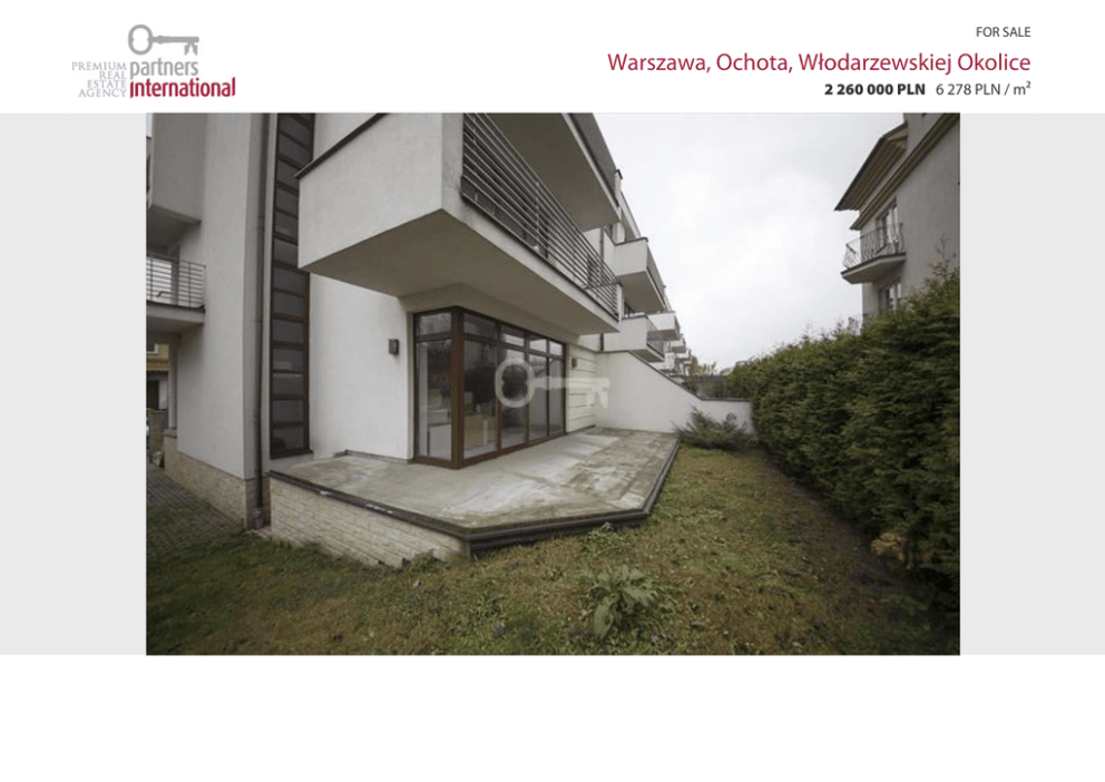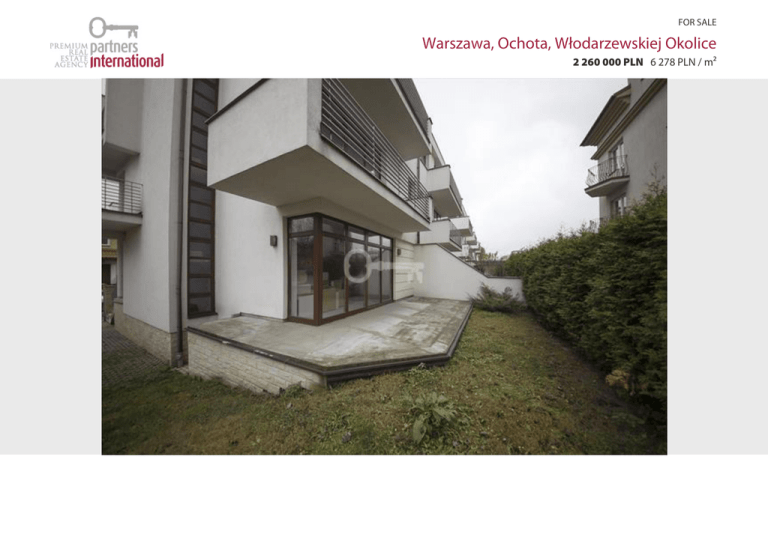 FOR SALE Warszawa, Ochota, Włodarzewskiej Okolice 2 260 000 PLN 6 278 PLN / m² AREA: 360 M² LIVING AREA (SQ.M.): 270 M² PLOT SIZE: 360 M² ROOMS: 8 BEDROOMS: N/D YEAR OF BUILT: 2009 OFFER NO: 21992 Description UNIQUE DUPLEX NEAR SZCZĘŚLIWICKI PARK! House in development, modern architecture. DISTRIBUTION: – Ground floor: Kitchen open to dining area and living room with fireplace (approx. 50 sqm), a separate room (7.41 sqm), toilet (2.41 sqm), entrance from the living room to the terrace (19.31 m2) – Floor 1: 2 bedrooms with bathroom, one bedroom with walk-in-closet (approx. 22 sqm), bathroom (8.22 sqm), second bedroom (approx 15.30 sqm) with private bathroom (about 8.51 sqm) and a balcony (8.32 sqm) – Floor 2: 3 bedrooms and bathroom (5.52 sqm) with entrance from the lobby. Dimensions of bedrooms: bedroom with walk-in-closet (approx. 22 sqm), 12.49 sqm and 12.60 sqm, exit to the balcony (8.32 sqm) – At the level of the garage, space for 2 cars, a boiler room and utility room. LOCATION: The house is located in an intimate setting with modern, low-detached houses. Driveway with cobblestones. Excellent location close to the center, in the vicinity of Szczęśliwicki Park and numerous green spaces, allowing for relax and recreation. Full infrastructure – shopping centers: Blue City, Reduta, schools and kindergartens, sports and cultural entertainment. Developed public transport: trams, buses, railway station and SKM Mazovia. ADDITIONAL INFORMATION: The shape of the plot: 23/12 The building was built of brick ceramic, covered with acrylic plaster. Wooden window frames, roof covered with tiles. The internal installations are made of copper. Media: electricity, power, gas, water, sewer line CONTACT: Beata Dziedzic, Tel: 502624500 Broker responsible: Joanna Czapska (professional license No. 4585) Outlined above proposal is not a commercial offer for the purposes of the law but is informative. All data relating to real estate was obtained on the basis statements of the Sellers. Plan Location Partners International Katarzyna Joanna Czapska Ul. Koszykowa 10/19 00-564 Warszawa tel. (+48 22) 646 52 02 fax: (+48 22) 646 26 99 partnersinternational.pl/en Responsible agent: BEATA DZIEDZIC phone: 502624500 E-mail: [email protected]