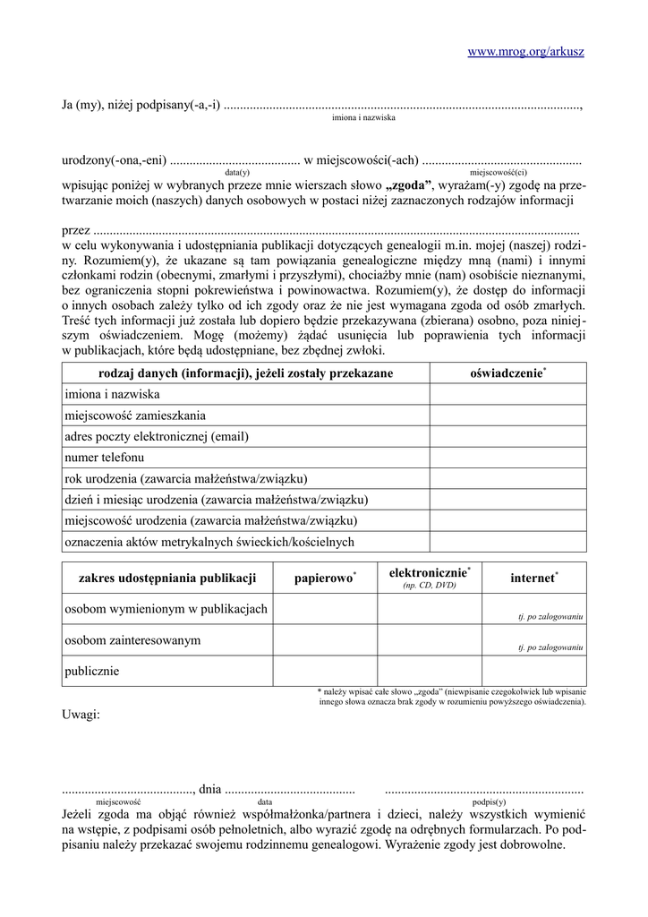 www.mrog.org/arkusz Ja (my), niżej podpisany(-a,-i) ............................................................................................................., imiona i nazwiska urodzony(-ona,-eni) ........................................ w miejscowości(-ach) ................................................. data(y) miejscowość(ci) wpisując poniżej w wybranych przeze mnie wierszach słowo „zgoda”, wyrażam(-y) zgodę na przetwarzanie moich (naszych) danych osobowych w postaci niżej zaznaczonych rodzajów informacji przez ..................................................................................................................................................... w celu wykonywania i udostępniania publikacji dotyczących genealogii m.in. mojej (naszej) rodziny. Rozumiem(y), że ukazane są tam powiązania genealogiczne między mną (nami) i innymi członkami rodzin (obecnymi, zmarłymi i przyszłymi), chociażby mnie (nam) osobiście nieznanymi, bez ograniczenia stopni pokrewieństwa i powinowactwa. Rozumiem(y), że dostęp do informacji o innych osobach zależy tylko od ich zgody oraz że nie jest wymagana zgoda od osób zmarłych. Treść tych informacji już została lub dopiero będzie przekazywana (zbierana) osobno, poza niniejszym oświadczeniem. Mogę (możemy) żądać usunięcia lub poprawienia tych informacji w publikacjach, które będą udostępniane, bez zbędnej zwłoki. oświadczenie* rodzaj danych (informacji), jeżeli zostały przekazane imiona i nazwiska miejscowość zamieszkania adres poczty elektronicznej (email) numer telefonu rok urodzenia (zawarcia małżeństwa/związku) dzień i miesiąc urodzenia (zawarcia małżeństwa/związku) miejscowość urodzenia (zawarcia małżeństwa/związku) oznaczenia aktów metrykalnych świeckich/kościelnych papierowo* zakres udostępniania publikacji elektronicznie* internet* (np. CD, DVD) osobom wymienionym w publikacjach tj. po zalogowaniu osobom zainteresowanym tj. po zalogowaniu publicznie * należy wpisać całe słowo „zgoda” (niewpisanie czegokolwiek lub wpisanie innego słowa oznacza brak zgody w rozumieniu powyższego oświadczenia). Uwagi: ........................................, dnia ........................................ miejscowość data ............................................................. podpis(y) Jeżeli zgoda ma objąć również współmałżonka/partnera i dzieci, należy wszystkich wymienić na wstępie, z podpisami osób pełnoletnich, albo wyrazić zgodę na odrębnych formularzach. Po podpisaniu należy przekazać swojemu rodzinnemu genealogowi. Wyrażenie zgody jest dobrowolne.