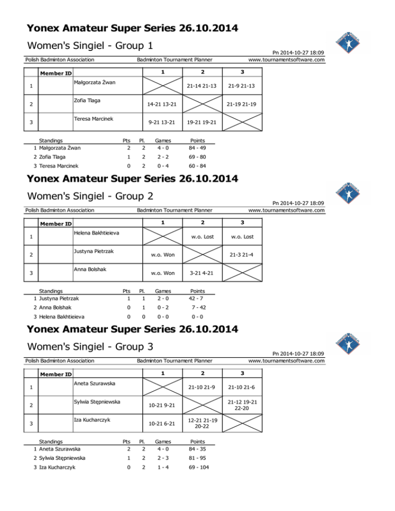 Yonex Amateur Super Series 26.10.2014 Women's Singiel - Group 1 Polish Badminton Association 1 Member ID Małgorzata Żwan 1 Zofia Tlaga 2 Standings 1 Małgorzata Żwan 2 3 21-14 21-13 21-9 21-13 14-21 13-21 Teresa Marcinek 3 Pn 2014-10-27 18:09 www.tournamentsoftware.com Badminton Tournament Planner 9-21 13-21 21-19 21-19 19-21 19-21 Pts 2 Pl. 2 Games 4-0 Points 84 - 49 2 Zofia Tlaga 1 2 2-2 69 - 80 3 Teresa Marcinek 0 2 0-4 60 - 84 Yonex Amateur Super Series 26.10.2014 Women's Singiel - Group 2 Polish Badminton Association 1 Member ID Helena Bakhtieieva 1 Justyna Pietrzak 2 Standings 1 Justyna Pietrzak 2 3 w.o. Lost w.o. Lost w.o. Won Anna Bolshak 3 Pn 2014-10-27 18:09 www.tournamentsoftware.com Badminton Tournament Planner w.o. Won 21-3 21-4 3-21 4-21 Pts 1 Pl. 1 Games 2-0 Points 42 - 7 2 Anna Bolshak 0 1 0-2 7 - 42 3 Helena Bakhtieieva 0 0 0-0 0-0 Yonex Amateur Super Series 26.10.2014 Women's Singiel - Group 3 Polish Badminton Association 1 Member ID 1 2 3 Aneta Szurawska Sylwia Stępniewska 2 3 21-10 21-9 21-10 21-6 21-12 19-21 22-20 10-21 9-21 Iza Kucharczyk Standings 1 Aneta Szurawska Pn 2014-10-27 18:09 www.tournamentsoftware.com Badminton Tournament Planner 10-21 6-21 12-21 21-19 20-22 Pts 2 Pl. 2 Games 4-0 Points 84 - 35 2 Sylwia Stępniewska 1 2 2-3 81 - 95 3 Iza Kucharczyk 0 2 1-4 69 - 104 Yonex Amateur Super Series 26.10.2014 Women's Singiel - Group 4 Polish Badminton Association 1 Member ID Anna Trzeciakowska 1 Aleksandra Bielska 2 Standings 1 Aleksandra Bielska 2 3 11-21 13-21 w.o. Won 21-11 21-13 Nguyen Yen 3 Pn 2014-10-27 18:09 www.tournamentsoftware.com Badminton Tournament Planner w.o. Lost w.o. Won w.o. Lost Pts 1 Pl. 1 Games 2-0 Points 42 - 24 2 Anna Trzeciakowska 0 1 0-2 24 - 42 3 Nguyen Yen 0 0 0-0 0-0 Yonex Amateur Super Series 26.10.2014 WOMEN'S SINGIEL Date City, Country Website 26 paź 2014 Wasrzawa, POL www.badmintonpogon.pl Printed: 2014-10-27 18:09:27 Member ID 1 Quarterfinals Semifinals Final Winner Małgorzata Żwan Małgorzata Żwan 21-10 21-18 2 Sylwia Stępniewska Aleksandra Bielska 21-5 21-9 3 Aleksandra Bielska Aleksandra Bielska w.o. 4 Anna Bolshak Aneta Szurawska 21-19 22-20 5 Zofia Tlaga Aneta Szurawska 21-6 21-10 6 Aneta Szurawska Aneta Szurawska 21-10 21-19 7 Anna Trzeciakowska Anna Trzeciakowska 21-19 19-21 21-19 8 Justyna Pietrzak