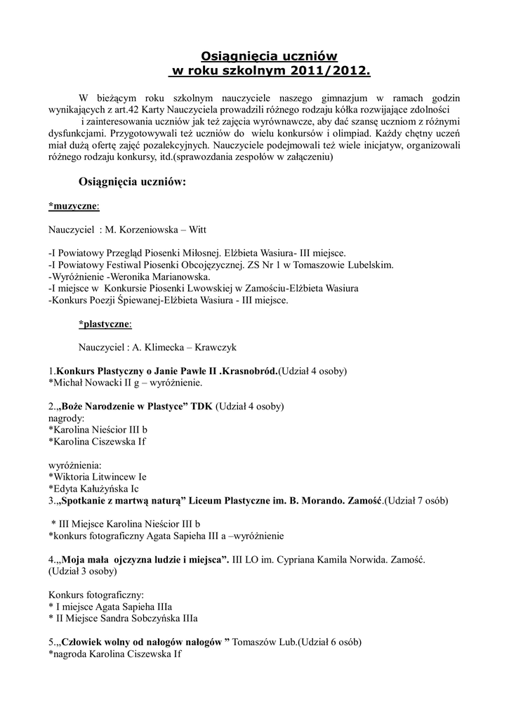 Osiągnięcia uczniów w roku szkolnym 2011/2012. W bieżącym roku szkolnym nauczyciele naszego gimnazjum w ramach godzin wynikających z art.42 Karty Nauczyciela prowadzili różnego rodzaju kółka rozwijające zdolności i zainteresowania uczniów jak też zajęcia wyrównawcze, aby dać szansę uczniom z różnymi dysfunkcjami. Przygotowywali też uczniów do wielu konkursów i olimpiad. Każdy chętny uczeń miał dużą ofertę zajęć pozalekcyjnych. Nauczyciele podejmowali też wiele inicjatyw, organizowali różnego rodzaju konkursy, itd.(sprawozdania zespołów w załączeniu) Osiągnięcia uczniów: *muzyczne: Nauczyciel : M. Korzeniowska – Witt -I Powiatowy Przegląd Piosenki Miłosnej. Elżbieta Wasiura- III miejsce. -I Powiatowy Festiwal Piosenki Obcojęzycznej. ZS Nr 1 w Tomaszowie Lubelskim. -Wyróżnienie -Weronika Marianowska. -I miejsce w Konkursie Piosenki Lwowskiej w Zamościu-Elżbieta Wasiura -Konkurs Poezji Śpiewanej-Elżbieta Wasiura - III miejsce. *plastyczne: Nauczyciel : A. Klimecka – Krawczyk 1.Konkurs Plastyczny o Janie Pawle II .Krasnobród.(Udział 4 osoby) *Michał Nowacki II g – wyróżnienie. 2.,,Boże Narodzenie w Plastyce” TDK (Udział 4 osoby) nagrody: *Karolina Nieścior III b *Karolina Ciszewska If wyróżnienia: *Wiktoria Litwincew Ie *Edyta Kałużyńska Ic 3.,,Spotkanie z martwą naturą” Liceum Plastyczne im. B. Morando. Zamość.(Udział 7 osób) * III Miejsce Karolina Nieścior III b *konkurs fotograficzny Agata Sapieha III a –wyróżnienie 4.,,Moja mała ojczyzna ludzie i miejsca”. III LO im. Cypriana Kamila Norwida. Zamość. (Udział 3 osoby) Konkurs fotograficzny: * I miejsce Agata Sapieha IIIa * II Miejsce Sandra Sobczyńska IIIa 5.,,Człowiek wolny od nałogów nałogów ” Tomaszów Lub.(Udział 6 osób) *nagroda Karolina Ciszewska If *nagroda specjalna Zuzanna Ziąbkowska III b 6.,,Euro 2012”. Międzynarodowy Otwarty Konkurs Plastyczny dla Dzieci i Młodzieży. Ukraina.(Udział 6 osób) Grand Prix Zuzanna Barczak Ie Michał Nowacki II g I Miejsce Aleksandra Kizowska II c II Miejsce Karolina Nieścior III b Zuzanna Nabrdalik Ib 7.,,400 lat miasta Tomaszowa”(Udział 1 osoba) * nagroda Joanna Wojtowicz III c 8.Strajk Szkolny na Lubelszczyźnie .Lublin. Regionalna Sekcja Oświaty i Wychowania NSZZ Solidarność (Udział 5 osób) * III Miejsce - Michał Nowacki II g * wyróżnienie- Weronika Fus III a 9.Szkolny Konkurs Plastyczny,,Irlandię i Wielką Brytanie chcę zobaczyć” Nauczyciele ;Elżbieta Fedczyszyn,Anna Kolasa,Agnieszka Klimecka – Krawczyk,Elżbieta Łasocha. I miejsce: *Aleksandra Burda III d *Zuzanna Barczak Ie * Kasia Jędrzejewska III a II Miejsce: Weronika Fus IIIa Dorota Piwko If Karolina Ciszewska If Wyróżnienia: Angelika Grzesik III d Magdalena Bukała I f Magdalena Kominek III a 10.Szkolny Konkurs Bożonarodzeniowy na stroik,kartkę świąteczną i ozdoby choinkowe. Nauczyciele ;Elżbieta Fedczyszyn, Anna Kolasa,Agnieszka Klimecka – Krawczyk,Elżbieta Łasocha. Nagrody : Marta Ciągło Ie Karolina Ciszewska If Weronika Fus III a Monika Jurek Ie Adrianna Kiszczuk Ie Magdalena Kominek III a Dorota Nowak Ie Patrycja Pitura IIIa Joanna Wojtowicz III c Wyróżnienia: Katarzyna Bender Ig Aleksandra Kwarciana Ig Zuzanna Nabrdalik Ib Aleksandra Szymczuk If 11.Szkolny Konkurs Wielkanocny: Nauczyciele :Elżbieta Fedczyszyn, Anna Kolasa,Agnieszka Klimecka – Krawczyk,Elżbieta Łasocha. Nagrody: Adrianna Kiszczuk Ie Dorota Nowak Ie Katarzyna Nowak III d Monika Jurek Ie Karolina Lepionka Ie Aleksandra Szymczuk If Wyróżnienia: *Małgorzata Milichiewicz Ie *Magdalena Kominek IIIa * Zuzanna Nabrdalik Ib *Katarzyna Wasyl Ie *Patrycja Pitura III a *Karolina Ciszewska If * matematyczne: Nauczyciel :Marek Michalski Amanda Żuk – Finalistka Turnieju Matematycznego Zagimak *biologiczne: Nauczyciel :Jolanta Jakubus - 4 osoby brały udział w olimpiadzie szkolnej, -Maciej Leńczuk - Finalista Okręgówki Zdrowego Stylu Życia. Lublin. *polonistyczne : -Konkurs ,,Człowiek wolny od nałogów”w kategorii literackiej nagrody : Małgorzata Bundyra III a ,nauczyciel Elżbieta Łasocha, Monika Falkowska Ig, nauczyciel Zdzisława Stechnij, Aleksandra Szymczuk , If nauczyciel Elżbieta Gryglicka Nagroda dla szkoły w Spektaklu Teatralnym na ,,Człowiek Wolny od Nałogów” przygotowanie nauczyciel Elżbieta Gryglicka, Zdzisława Stechnij, Elżbieta Fedczyszyn. *Konkurs Ortograficzny ,,Żak 2012” - Ewa Dużyńska I c- Laureatka Konkursu Ortograficznego ,,Żak 2012” nauczyciel Bożena Szacfajer I Miejsce – Magdalena Bulira III b nauczyciel Jolanta Piotrowska *Karolina Maryńczak – nagroda w Powiatowym Konkursie Sztuki Recytatorskiej i Pieśni Papieskiej „Jan Paweł II- wciąż jest wśród nas”nauczyciel Jolanta Piotrowska *Kamil Palak II f - nagroda w Konkursie Literackim ,,W świecie fantazji” nauczyciel Jolanta Piotrowska. *historyczne : -Wojewódzki Konkurs Historyczny : laureatką została Ewa Dużyńska I c, uczennica przygotowana pod kierunkiem pani Anny Bartnickiej , finalistką Katarzyna Jóźwiak III d, przygotowana pod kierunkiem pana Krzysztofa Wronki. ,,Tomaszów moje miasto”- Konkurs Historyczny- nauczyciel Andrzej Gromek I miejsce Magdalena Bukała Ie III miejsce Patrycja Banaś I f IV miejsce – Katarzyna Woś II g *techniczne : III miejsce w kategorii szkół gimnazjalnych w Ogólnopolskim Turnieju Bezpieczeństwa Ruchu Drogowego,Nauczyciel Irena Pawłowicz *geograficzne: -Roksana Podkowa II a -Laureatka Kuratoryjnego Konkursu z Geografii nauczyciel Mirosław Tucki -II Miejsce w Konkursie Wojewódzkim ,,Lubelszczyzna Moja Mała Ojczyzna”(Magda Bulira, Magda Biront,Gabriela Rumak)nauczyciel Waldemar Jurczyszyn.