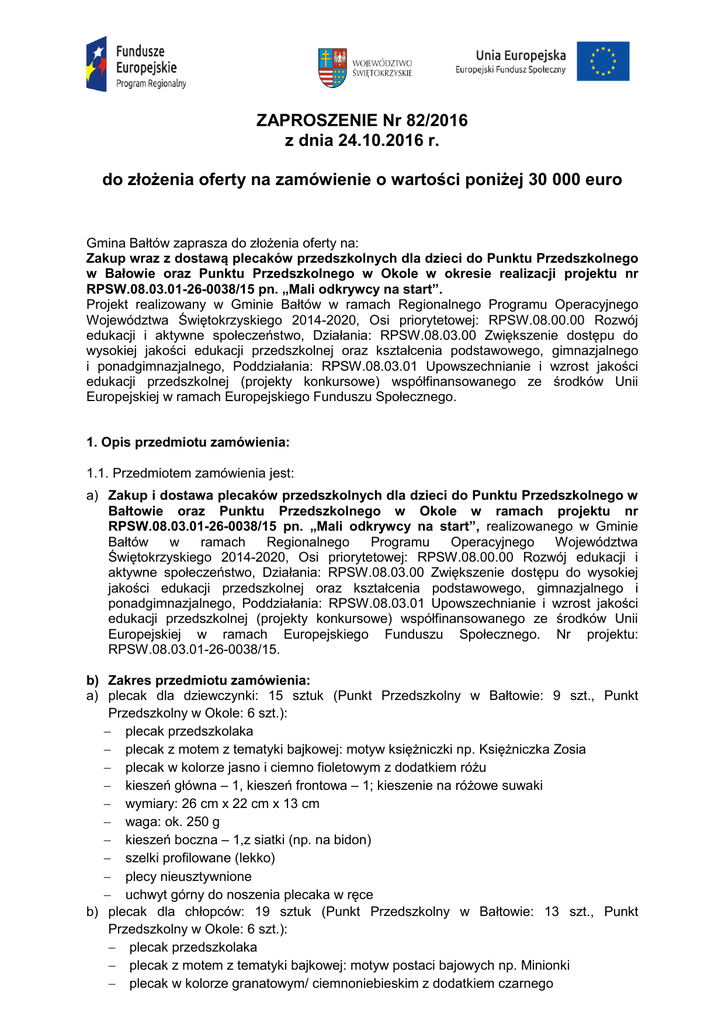 ZAPROSZENIE Nr 82/2016 z dnia 24.10.2016 r. do złożenia oferty na zamówienie o wartości poniżej 30 000 euro Gmina Bałtów zaprasza do złożenia oferty na: Zakup wraz z dostawą plecaków przedszkolnych dla dzieci do Punktu Przedszkolnego w Bałowie oraz Punktu Przedszkolnego w Okole w okresie realizacji projektu nr RPSW.08.03.01-26-0038/15 pn. „Mali odkrywcy na start”. Projekt realizowany w Gminie Bałtów w ramach Regionalnego Programu Operacyjnego Województwa Świętokrzyskiego 2014-2020, Osi priorytetowej: RPSW.08.00.00 Rozwój edukacji i aktywne społeczeństwo, Działania: RPSW.08.03.00 Zwiększenie dostępu do wysokiej jakości edukacji przedszkolnej oraz kształcenia podstawowego, gimnazjalnego i ponadgimnazjalnego, Poddziałania: RPSW.08.03.01 Upowszechnianie i wzrost jakości edukacji przedszkolnej (projekty konkursowe) współfinansowanego ze środków Unii Europejskiej w ramach Europejskiego Funduszu Społecznego. 1. Opis przedmiotu zamówienia: 1.1. Przedmiotem zamówienia jest: a) Zakup i dostawa plecaków przedszkolnych dla dzieci do Punktu Przedszkolnego w Bałtowie oraz Punktu Przedszkolnego w Okole w ramach projektu nr RPSW.08.03.01-26-0038/15 pn. „Mali odkrywcy na start”, realizowanego w Gminie Bałtów w ramach Regionalnego Programu Operacyjnego Województwa Świętokrzyskiego 2014-2020, Osi priorytetowej: RPSW.08.00.00 Rozwój edukacji i aktywne społeczeństwo, Działania: RPSW.08.03.00 Zwiększenie dostępu do wysokiej jakości edukacji przedszkolnej oraz kształcenia podstawowego, gimnazjalnego i ponadgimnazjalnego, Poddziałania: RPSW.08.03.01 Upowszechnianie i wzrost jakości edukacji przedszkolnej (projekty konkursowe) współfinansowanego ze środków Unii Europejskiej w ramach Europejskiego Funduszu Społecznego. Nr projektu: RPSW.08.03.01-26-0038/15. b) Zakres przedmiotu zamówienia: a) plecak dla dziewczynki: 15 sztuk (Punkt Przedszkolny w Bałtowie: 9 szt., Punkt Przedszkolny w Okole: 6 szt.): plecak przedszkolaka plecak z motem z tematyki bajkowej: motyw księżniczki np. Księżniczka Zosia plecak w kolorze jasno i ciemno fioletowym z dodatkiem różu kieszeń główna – 1, kieszeń frontowa – 1; kieszenie na różowe suwaki wymiary: 26 cm x 22 cm x 13 cm waga: ok. 250 g kieszeń boczna – 1,z siatki (np. na bidon) szelki profilowane (lekko) plecy nieusztywnione uchwyt górny do noszenia plecaka w ręce b) plecak dla chłopców: 19 sztuk (Punkt Przedszkolny w Bałtowie: 13 szt., Punkt Przedszkolny w Okole: 6 szt.): plecak przedszkolaka plecak z motem z tematyki bajkowej: motyw postaci bajowych np. Minionki plecak w kolorze granatowym/ ciemnoniebieskim z dodatkiem czarnego kieszeń główna – 1, kieszeń frontowa – 1 wymiary: 26,5 cm x 21 cm x 1 cm waga: ok. 190 g kieszeń boczna – 1,z siatki (np. na bidon) szelki profilowane (lekko) plecy usztywnione, pokryte oddychającym materiałem uchwyt górny do noszenia plecaka w ręce Plecaki muszą być wykonane zgodnie z obowiązującymi bezpieczeństwa oraz muszą być objęte gwarancją producenta. normami jakości i Do oferty proszę dołączyć propozycję plecaków w formie zdjęć. c) Wymagany termin wykonania zamówienia: zgodnie z zamówieniem/ umową d) Zakres obowiązków: realizacja zakupu wraz z dostawą zgodnie z zamówieniem/ umową dostawa zamówienia do Punktu Przedszkolnego w Bałtowie i Punktu Przedszkolnego w Okole, po wcześniejszym uzgodnieniu terminu dostawy e) Termin dostawy: zgodnie z zamówieniem/ umową f) Rozliczenie: rozliczenie po prawidłowo wykonanym zamówieniu, na podstwie protokołu zdawczo-odbiorczego oraz faktury, przelewem na numer rachunku bankowego g) Miejsce dostawy: i. Gmina Bałtów – Punkt Przedszkolny w Bałtowie, 27-423 Bałtów, Bałtów 32 ii. Gmina Bałtów – Punkt Przedszkolny w Okole, 27-423 Bałtów, Okół 82 h) Wspólny Słownik Zamówienia: 18931100-5– Plecaki i) Zamówienia dodatkowe: Zamawiający przewiduje wystąpienie uzupełniających w wysokości nie więcej niż 10% wartości zamówienia zamówień 2. O udzielenie niniejszego zamówienia mogą ubiegać się wykonawcy, którzy spełniają warunki, dotyczące: a. Posiadania uprawnień do wykonywania określonej działalności lub czynności, jeżeli przepisy prawa nakładają obowiązek ich posiadania. Działalność prowadzona na potrzeby wykonania przedmiotu zamówienia nie wymaga posiadania specjalnych uprawnień. Zamawiający dokona oceny spełniania warunków udziału w postępowaniu w tym zakresie na podstawie oświadczenia o spełnianiu warunków udziału w postępowaniu. b. Posiadania wiedzy i doświadczenia. Zamawiający nie wyznacza szczegółowego warunku w tym zakresie. Zamawiający dokona oceny spełniania warunków udziału w postępowaniu w tym zakresie na podstawie oświadczenia o spełnianiu warunków udziału w postępowaniu. c. Dysponowania odpowiednim potencjałem technicznym oraz osobami zdolnymi do wykonania zamówienia. Zamawiający nie wyznacza szczegółowego warunku w tym zakresie. Zamawiający dokona oceny spełniania warunków udziału w postępowaniu w tym zakresie na podstawie oświadczenia o spełnianiu warunków udziału w postępowaniu oraz Formularza ofertowego wykonawcy. d. Sytuacji ekonomicznej i finansowej. Zamawiający nie wyznacza szczegółowego warunku w tym zakresie. Zamawiający dokona oceny spełniania warunków udziału w postępowaniu w tym zakresie na podstawie oświadczenia o spełnianiu warunków udziału w postępowaniu. 3. Kryteria oceny ofert, informacja o wagach punktowych lub procentowych przypisanych do poszczególnych kryteriów oceny oferty, opis sposobu przyznawania punktacji za spełnienie danego kryterium oceny oferty. 1. Kryteria oceny ofert - zamawiający uzna oferty za spełniające wymagania i przyjmie do szczegółowego rozpatrywania, jeżeli: 1) Oferta, spełnia wymagania określone niniejszym zaproszeniem. 2) Oferta została złożona, w określonym przez zamawiającego terminie. 3) Oferta została złożo