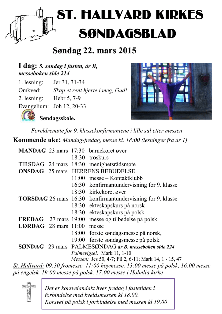 St. Hallvard kirkes søndagsblad Søndag 22. mars 2015 I dag: 5. søndag i fasten, år B, messeboken side 214 1. lesning: Omkved: 2. lesning: Evangelium: Jer 31, 31-34 Skap et rent hjerte i meg, Gud! Hebr 5, 7-9 Joh 12, 20-33 Søndagsskole. Foreldremøte for 9. klassekonfirmantene i lille sal etter messen Kommende uke: Mandag-fredag, messe kl. 18:00 (lesninger fra år 1) MANDAG 23 mars 17:30 barnekoret øver 18:30 troskurs TIRSDAG 24 mars 18:30 menighetsrådsmøte ONSDAG 25 mars HERRENS BEBUDELSE 11:00 messe – Kontaktklubb 16:30 konfirmantundervisning for 9. klasse 18:30 kirkekoret øver TORSDAG 26 mars 16:30 konfirmantundervisning for 9. klasse 18:30 ekteskapskurs på norsk 18:30 ekteskapskurs på polsk FREDAG 27 mars 19:00 messe og tilbedelse på polsk LØRDAG 28 mars 11:00 messe 18:00 første søndagsmesse på norsk, 19:00 første søndagsmesse på polsk SØNDAG 29 mars PALMESØNDAG år B, messeboken side 224 Palmevigsel: Mark 11, 1-10 Messen: Jes 50, 4-7; Fil 2, 6-11; Mark 14, 1 - 15, 47 St. Hallvard: 09:30 fromesse, 11:00 høymesse, 13:00 messe på polsk, 16:00 messe på engelsk, 19:00 messe på polsk, 17:00 messe i Holmlia kirke Det er korsveiandakt hver fredag i fastetiden i forbindelse med kveldsmessen kl 18.00. Korsvei på polsk i forbindelse med messen kl 19.00 Tildekning av kors og bilder Det er en gammel tradisjon å dekke til krusifiks og bilder i kirken med fiolette eller røde kleder. Vi gjør dette også i St. Hallvard kirke, og tildekkingen skjer allerede før den femte søndagen i fasten (denne søndagen). Hensikten er å vise at vi nå for alvor nærmer oss Jesu lidelse og død. Fra fastetidens begynnelse er flere ting blitt borte fra liturgien - Gloria og Alleluja, ingen blomster foran alteret, orgelet brukes mindre etc - dette blir enda tydeligere nå når også krusifikser og helgenbilder dekkes til. Krusifiksene og bildene kommer til syne igjen før påskevigilien starter. Og denne skikken kan man om ønskelig også praktisere i hjemmet ved at man tildekker krusifikser og religiøse bilder med passende tøystykker. Palmegrenklipping Vaktmester Christy Lawrens trenger palmegrenklippere til Palmesøndagens palmegrener. Vi møtes i menighetssalen fredag 27. mars kl 10:00. Notiser: Kontoret vil være ubetjent i Stille uke. Vanlig kontortid fra og med tirsdag 7. april. Kontaktklubben møtes til lunsj og hyggelig samvær hver onsdag etter messen kl 11:00. Alle er velkommen! 25. mars avholdes siste møte i Kontaktklubben før påske. 1. april er det messe kl 11:00, men Kontaktklubben møtes ikke. 8. april møtes Kontaktklubben første gang etter påske Familiekoret har øvelse hver mandag kl 17:30. Kirkekoret har øvelse onsdager kl 18:30 og søndager kl 10:15 før høymesse kl 11:00 Menighetsrådet har sitt neste møte 24. mars. Søndag 29. mars, Palmesøndag, begynner sommertiden. Husk å stille klokka en time fram! Vi takker for kollekt Kr 481 katekesemesse kr 406 lørdag kveld på norsk kr 339 lørdag kveld på polsk kr 1 625 fromesse på norsk kr 4 117 høymesse på norsk kr 3 276 messe på polsk fra 15. mars kr 867 engelsk messe kr 804 messe på eritreisk kr 1 487 messe på polsk søndag kveld kr 948 messe på Nesodden kr 1 038 messe på Holmlia kr 2 431 kirkekaffe STILLE UKE OG PÅSKE I ST. HALLVARD Palmesøndag 29. mars 09:30 fromesse 11:00 høymesse på norsk 13:00 messe på polsk 16:00 messe på engelsk 19:00 messe på polsk 17:00 messe i Holmlia kirke Innsamling av fastebøssene Mandag 30. mars 17:00 tilbedelse og skriftemål 18:00 messe Tirsdag 31. mars 18:00 oljevigselsmesse i St. Olav kirke, ingen messe i St. Hallvard Onsdag 1. april 11:00 messe (ikke Kontaktklubb, neste gang 8. april) 18:00 messe Skjærtorsdag 2. april 17:00 skjærtorsdagsmesse på polsk 19:00 skjærtorsdagsmesse på norsk 20:30 agapemåltid 20:30 sakramenttilbedelse og skriftemål til midnatt 15:00 skjærtorsdagsmesse i Holmlia kirke Langfredag 3. april (faste og abstinens) 15:00 pasjonsgudstjeneste på norsk 17:00 pasjonsgudstjeneste på polsk 15:00 pasjonsgudstjeneste i Holmlia kirke Kollekt til Det hellige land Påskeaften lørdag 4. april 11:00 velsignelse av påskemat på polsk (hver halvtime frem til kl 13:00) 19:00 påskevigilie på polsk 22:00 påskevigilie på norsk 1. Påskedag søndag 5. april 07:30 messe på polsk 09:30 messe på norsk 10:30 skriftemål 11:00 Påskedagsmesse 13:00 messe på polsk 14:30 messe på eritreisk 16:00 messe på engelsk 13:30 messe i Skoklefall kirke, 17:00 messe i Holmlia kirke Mandag i påskeoktaven 6. april 2. påskedag 11:00 messe 2. påskedag 13:00 messe 2. påskedag på polsk 17:00 tilbedelse og skriftemål 18:00 messe på norsk "5 brød og 2 fisker" - Næring for kropp og sjel Familiehelg på Mariaholm 5.-7. juni aktiviteter diskusjon bønn familietid liturgi lek samtaler fotball messe Hvem kan delta? Familier med barn i alle aldre, besteforeldre, deler av familien… Sted: Mariaholm, katolsk leirsted i Spydeberg, 1 time fra Oslo. Tid: fredag 5 juni kl 17 – søndag 7 juni kl 16 Transport: egen bil, eller ved henting fra togstasjon i Spydeberg eller sitte på med noen Pris: kr 550 (voksen) / kr 300 (barn); kr 150 (barn i reiseseng) NB! Fra og med fjerde barn gratis Påmeldingsfrist: 10. mai 2015 Bindende påmelding sendes som e-post til Darko Wakounig: [email protected] Spørsmål? Kontakt arrangementskomitéen på [email protected]. Tilbud til familier, barn og unge Familiehelg 5.-7. juni 2015 «Fem brød og to fisker» – næring for kropp og sjel er tema for årets familiehelg som St. Hallvard menighet arrangerer tradisjonen tro . Påmeldingen er åpen og sendes til [email protected] eller menighetskontoret. Om du kan tenke deg å være med i planleggingsgruppe eller bidra med praktisk hjelp, ta kontakt med Marta: [email protected] eller med menighetskontoret. Informasjonsmøte om konfirmasjonen 2015 Søndag 22. mars er alle foreldre til årets konfirmanter bedt til informasjonsmøte kl 12-13, etter norsk høymesse. Møtet finner sted i l