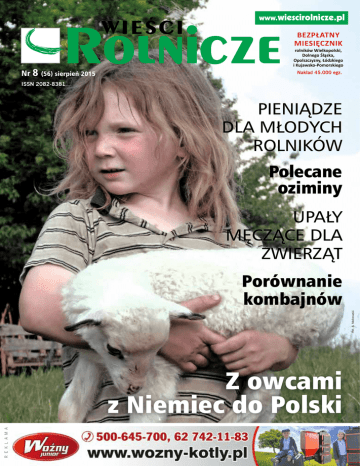 www.wiescirolnicze.pl BEZPŁATNY MIESIĘCZNIK Nr 8 (56) sierpień 2015 rolników Wielkopolski, Dolnego Śląska, Opolszczyzny, Łódzkiego i Kujawsko-Pomorskiego Nakład 45.000 egz. ISSN 2082-8381 PIENIĄDZE DLA MŁODYCH ROLNIKÓW Polecane oziminy UPAŁY MĘCZĄCE DLA ZWIERZĄT Fot. A. Malinowski Porównanie kombajnów R E K L A M A Z owcami z Niemiec do Polski WIEŚCI ROLNICZE | NR 8 (56) SIERPIEŃ 2015 WIEŚCI ROLNICZE | NR 8 (56) SIERPIEŃ 2015 02 REKLAMY 03 Spis treści Informacje Aleksandra Pilarczyk redaktor naczelna Emerytura polityczna Przed wyborami parlamentarnymi rolnicy mogą liczyć na jakieś bonusy w systemie emerytalnym. Gazety donoszą ostatnio, że wg nowego projektu na emeryturę będzie mógł przejść nawet 56-letni właściciel gospodarstwa (po czterdziestu latach pracy, licząc od szesnastego roku życia). Jaka wtedy będzie wysokość jego świadczenia, nie wiadomo, ale mogłoby to być na takiej zasadzie: państwo udaje, że godnie płaci, a rolnik - że już nie pracuje. Przecież wykluczenie z zawodu mężczyzny w sile wieku, z doświadczeniem, którego żadnymi studiami nie da się zastąpić, byłoby kadrowym marnotrawstwem. I dla konkretnego gospodarstwa, i w skali całego państwa. Politycy popadają ze skrajności w skrajność. Według aktualnie obowiązujących przepisów po 2017 roku rolnicy nie mogliby już przechodzić na wcześniejszą emeryturę (55 lat dla kobiet i 60 lat dla mężczyzn). Wiek emerytalny stopniowo by się wydłużał aż do 67 lat. Mężczyźni osiągnęliby go w 2020 r., a kobiety w 2040 (tak jak w ZUS-ie). Jak przy przechodzeniu na emeryturę w tak późnym wieku zapewnić w rodzinnym gospodarstwie następstwo pokoleń? Co drugie musiałoby chyba wypadać z obiegu, tak żeby wnukowie, którym zapisze się ziemię, mogli wystąpić o premię dla młodego rolnika. 4 Kradną deszczownie Wnioski na zalesianie do 17 sierpnia 4 4 5.000 zł dla studenta Pomoc dla poszkodowanych przez suszę 5 Wybory z niską frekwencją 6 Czas na młodych 7 8 Dokumentowanie sprzedaży przez rolnika vatowca 9 Milion na oczyszczalnie i panele fotowoltaiczne 9 Zwrot akcyzy za paliwo - już czas składać wnioski 10 Może i dorobić, i jeść obiad ze swoim następcą 11 Wcześniejsze emerytury z KRUS 12-13 Lokalność siłą banków spółdzielczych 42-44 Z owcami z Niemiec do Polski 65-66 Przed nami 67-72 Za nami s. 20-21 Uprawy Wskażą tereny wrażliwe na brak wody Odmiany po raz pierwszy zalecane Poplony - czas na siew Ustrzec oziminy przed chorobami Facelia na kłopoty ze stanowiskiem Jak zminimalizować straty w ziarnie? Rośliny mogą rosnąć w powietrzu Bielone czy zielone? Uważaj na ślimaki Giełdowe ceny warzyw i owoców Czy warto inwestować w łąkę? 14 15-16 17 18-19 20-21 22-23 24-26 28-30 31 32-33 34-35 Hodowla Jak pomóc bydłu przetrwać upał? Najpopularniejsze są duże króliki 37-39 40-41 Ketoza - wróg hodowcy! Roboty udojowe zgodne z behawioryzmem 45-47 48-50 s. 45-47 Technika rolnicza Żniwa w rekordowym czasie Gleba lubi niskie ciśnienie Kombajny do marchwi Techniczne wizytówki Znajdź nas na Facebooku! 52-54 56-57 58-60 62-63 WIEŚCI DLA DOMU Najpiękniejszy kwiat pani Stefanii Tuja Szmaragd spełnia ich marzenia „Fantazja z gradem” na Naleśnikowej Bibie Z kaszą jaglaną w roli głównej Najlepsze potrawy z wieprzowiny Rzucali broną i wieszali pranie Maliny dobre nie tylko na przeziębienie Owoce egzotyczne nie tylko na talerzu 74-75 76-77 78 78 79 79 80-81 82 REDAGUJE ZESPÓŁ: Redaktor naczelny - Aleksandra Pilarczyk Piotr Piotrowicz, Aneta Rzeźniczak, Anetta Nakład: 45.000 egz. ADRES REDAKCJI: Przespolewska, Elżbieta Rzepczyk, Honorata 63-200 Jarocin, ul. Kasprzaka 1a, ADRES WYDAWNICTWA: Dmyterko, Dorota Jańczak, Ania Kopras-Fijołek, tel. 62 747-15-31, Południowa Oficyna Wydawnicza Sp. z o.o., Ksenia Pięta, Magdalena Teodorczyk, Przemysław tel./fax 62 747-37-60 Góralczyk, Justyna Napieraj, Hubert Mościpan, Artur 63-200 Jarocin ul. Kasprzaka 1a, Krawczyk. tel. 62 747-15-31, tel./fax 62 747-37-60. E-MAIL: [email protected] Korekta: Jacek Kaliszan. PROJEKT GRAFICZNY: STRONA INTERNETOWA: www.wiescirolnicze.pl Polecamy Szymon Mofina. DRUK: AGORA S.A., 64-920 Piła, ul. Krzywa 35. PROJEKTY REKLAM: Szymon Mofina, Łukasz Zięciak, Dariusz Fijołek, Piotr Kołaski, Piotr Budnik, Krzysztof Szukalski, Zbigniew Pacanowski, Maciej Mostowy, Waldemar Stańko, Karolina Ciemniak. Zeskanuj kod QR lub wejdź na stronę: www.facebook.com/wiescirolnicze DZIAŁ REKLAMY: Aneta Rzeźniczak - kierownik (Jarocin) - tel. 512-135-918, Anna Moczydłowska (Jarocin) - tel. 508-510-537, Artur Antczak (Jarocin) - tel. 508-318-922, Angelika Włodarczyk (Jarocin) - tel. 509-082-772, Przemysław Markiewicz (Pleszew) - tel. 602-367-873, Patrycja Skorzybót (Pleszew) - tel. 512-136-544, Małgorzata Wieczorek (Rawicz) - tel. 516-131-104, Anna Danek (Rawicz) - tel. 600-210-433, Justyna Pasieracka (Gostyń) - tel. 604-983-569, Paulina Pawłowska (Gostyń) - tel. 512-135-914, WIEŚCI ROLNICZE | NR 8 (56) SIERPIEŃ 2015 WIEŚCI ROLNICZE | NR 8 (56) SIERPIEŃ 2015 04 INFORMACJE INFORMACJE 05 Powiat pleszewski Kradną deszczownie K ilku mieszkańców gminy Gołuchów (powiat pleszewski) okradło dwóch rolników z Czechla i Kuchar. Chodzi o deszczownie, które często widać na polach. Wprawdzie nie przywłaszczono całych urządzeń, ale zraszacze. Jednak bez tych części urządzenia nie działają. Deszczownie są rolnikom bardzo potrzebne. - Cały czas jest susza - mówił rolnik z Czechla, który został okradziony. Dzięki nawadnianiu ratują swoje rośliny, przede wszystkim warzywa. - Pierwsza kradzież była dwa tygodnie temu w czwartek, a druga tydzień temu w czwartek - opowiadał w lipcu. Jego jedna deszczownia była w Kucharkach, a druga w pobliżu domu. Jeden ze zraszaczy kosztuje 4.000 zł. - To waży około 5 kilogramów i wykonane jest z aluminium - wyjaśniał młody rolnik. Zaznacza, że podejrzani o kradzieże zostali już zatrz