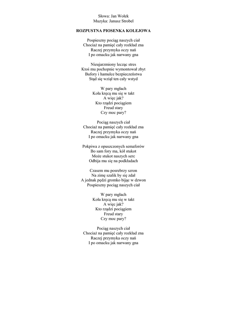 Słowa: Jan Wołek Muzyka: Janusz Strobel ROZPUSTNA PIOSENKA KOLEJOWA Pospieszny pociąg naszych ciał Chociaż na pamięć cały rozkład zna Raczej przymyka oczy nań I po omacku jak narwany gna Nieujarzmiony lecząc stres Ktoś mu pochopnie wymontował zbyt Bufory i hamulce bezpieczeństwa Stąd się wziął ten cały wstyd W pary mgłach Koła kręcą mu się w takt A więc jak? Kto rządzi pociągiem Freud stary Czy moc pary? Pociąg naszych ciał Chociaż na pamięć cały rozkład zna Raczej przymyka oczy nań I po omacku jak narwany gna Pokpiwa z opuszczonych semaforów Bo sam fory ma, kół stukot Może stukot naszych serc Odbija mu się na podkładach Czasem mu posrebrzy szron Na zimę szalik by się zdał A jednak pędzi gromko bijąc w dzwon Pospieszny pociąg naszych ciał W pary mgłach Koła kręcą mu się w takt A więc jak? Kto rządzi pociągiem Freud stary Czy moc pary? Pociąg naszych ciał Chociaż na pamięć cały rozkład zna Raczej przymyka oczy nań I po omacku jak narwany gna