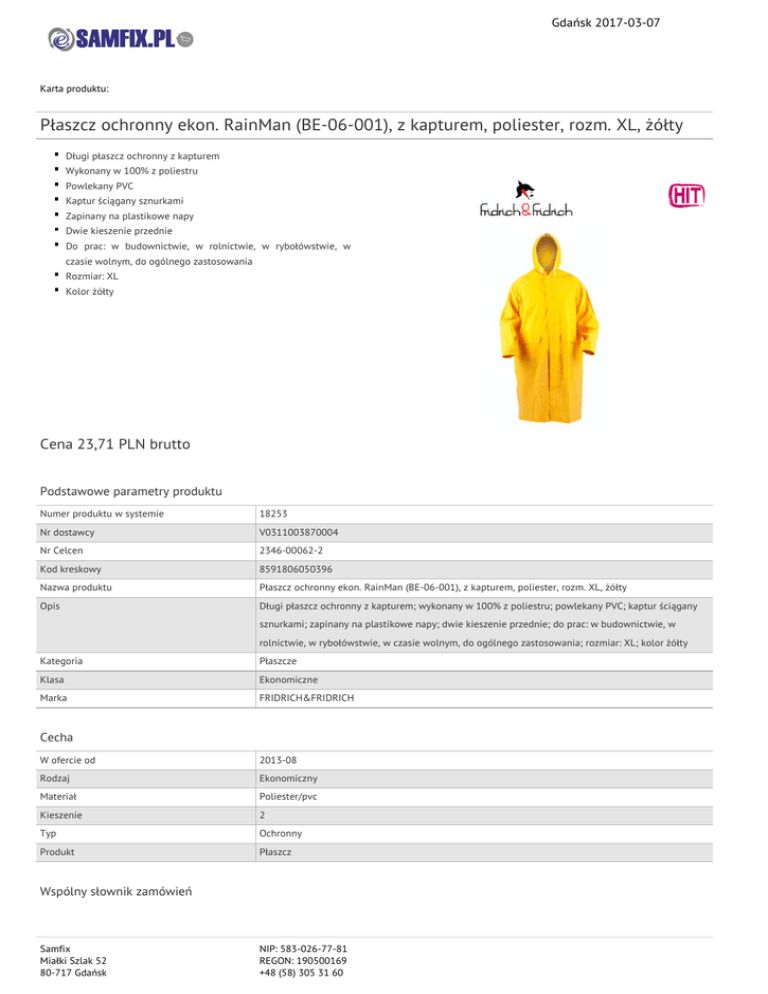 Gdańsk 2017-03-07 Karta produktu: Płaszcz ochronny ekon. RainMan (BE-06-001), z kapturem, poliester, rozm. XL, żółty Długi płaszcz ochronny z kapturem Wykonany w 100% z poliestru Powlekany PVC Kaptur ściągany sznurkami Zapinany na plastikowe napy Dwie kieszenie przednie Do prac: w budownictwie, w rolnictwie, w rybołówstwie, w czasie wolnym, do ogólnego zastosowania Rozmiar: XL Kolor żółty Cena 23,71 PLN brutto Podstawowe parametry produktu Numer produktu w systemie 18253 Nr dostawcy V0311003870004 Nr Celcen 2346-00062-2 Kod kreskowy 8591806050396 Nazwa produktu Płaszcz ochronny ekon. RainMan (BE-06-001), z kapturem, poliester, rozm. XL, żółty Opis Długi płaszcz ochronny z kapturem; wykonany w 100% z poliestru; powlekany PVC; kaptur ściągany sznurkami; zapinany na plastikowe napy; dwie kieszenie przednie; do prac: w budownictwie, w rolnictwie, w rybołówstwie, w czasie wolnym, do ogólnego zastosowania; rozmiar: XL; kolor żółty Kategoria Płaszcze Klasa Ekonomiczne Marka FRIDRICH&FRIDRICH Cecha W ofercie od 2013-08 Rodzaj Ekonomiczny Materiał Poliester/pvc Kieszenie 2 Typ Ochronny Produkt Płaszcz Wspólny słownik zamówień Samfix Miałki Szlak 52 80-717 Gdańsk NIP: 583-026-77-81 REGON: 190500169 +48 (58) 305 31 60 Gdańsk 2017-03-07 Karta katalogowa produktu cd. Płaszcz ochronny ekon. RainMan (BE-06-001), z kapturem, poliester, rozm. XL, żółty CPV 35113450-8 Wymiary Rozmiar XL Certyfikaty Nowy produkt w ofercie Standard Hit Standard Kolor Kolor Żółty Pozostałe zdjęcia produktu Serdecznie zapraszamy do współpracy Zespół Samfix. Samfix Miałki Szlak 52 80-717 Gdańsk NIP: 583-026-77-81 REGON: 190500169 +48 (58) 305 31 60