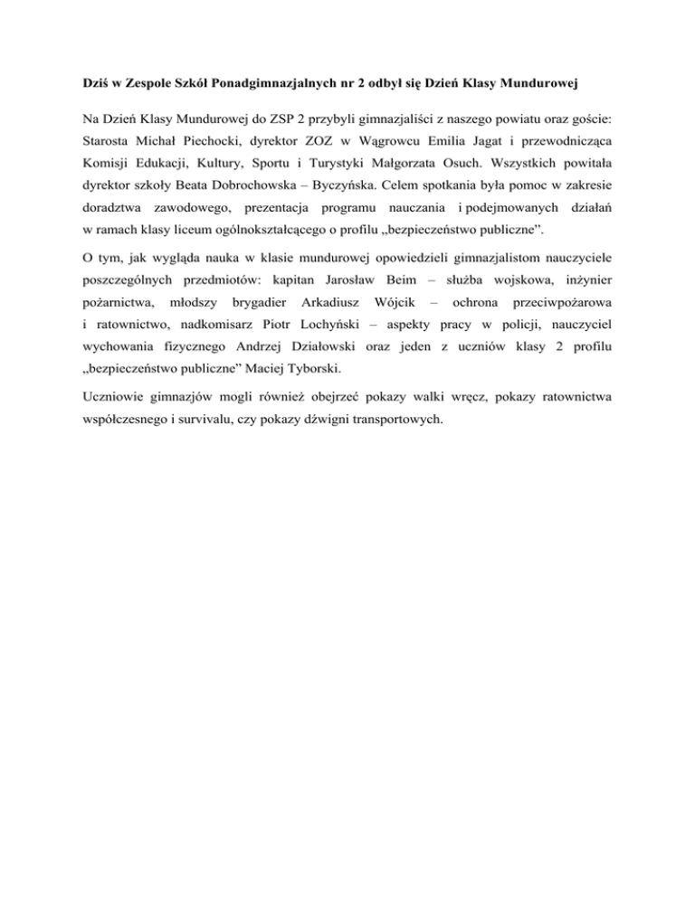 Dziś w Zespole Szkół Ponadgimnazjalnych nr 2 odbył się Dzień Klasy Mundurowej Na Dzień Klasy Mundurowej do ZSP 2 przybyli gimnazjaliści z naszego powiatu oraz goście: Starosta Michał Piechocki, dyrektor ZOZ w Wągrowcu Emilia Jagat i przewodnicząca Komisji Edukacji, Kultury, Sportu i Turystyki Małgorzata Osuch. Wszystkich powitała dyrektor szkoły Beata Dobrochowska – Byczyńska. Celem spotkania była pomoc w zakresie doradztwa zawodowego, prezentacja programu nauczania i podejmowanych działań w ramach klasy liceum ogólnokształcącego o profilu „bezpieczeństwo publiczne”. O tym, jak wygląda nauka w klasie mundurowej opowiedzieli gimnazjalistom nauczyciele poszczególnych przedmiotów: kapitan Jarosław Beim – służba wojskowa, inżynier pożarnictwa, młodszy brygadier Arkadiusz Wójcik – ochrona przeciwpożarowa i ratownictwo, nadkomisarz Piotr Lochyński – aspekty pracy w policji, nauczyciel wychowania fizycznego Andrzej Działowski oraz jeden z uczniów klasy 2 profilu „bezpieczeństwo publiczne” Maciej Tyborski. Uczniowie gimnazjów mogli również obejrzeć pokazy walki wręcz, pokazy ratownictwa współczesnego i survivalu, czy pokazy dźwigni transportowych.