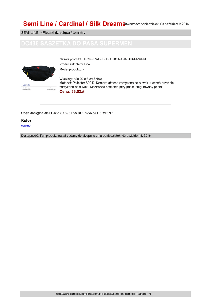 Semi Line / Cardinal / Silk DreamsUtworzono: poniedziałek, 03 październik 2016 SEMI LINE > Plecaki dziecięce / tornistry DC436 SASZETKA DO PASA SUPERMEN Nazwa produktu: DC436 SASZETKA DO PASA SUPERMEN Producent: Semi Line Model produktu: Wymiary: 13x 20 x 6 cm Materiał: Poliester 600 D. Komora głowna zamykana na suwak, kieszeń przednia zamykana na suwak. Możliwość noszenia przy pasie. Regulowany pasek. Cena: 38.62zł Opcje dostępne dla DC436 SASZETKA DO PASA SUPERMEN : Kolor czarny. Dostępność: Ten produkt został dodany do sklepu w dniu poniedziałek, 03 październik 2016 http://www.cardinal.semi-line.com.pl | [email protected] | | Strona 1/1