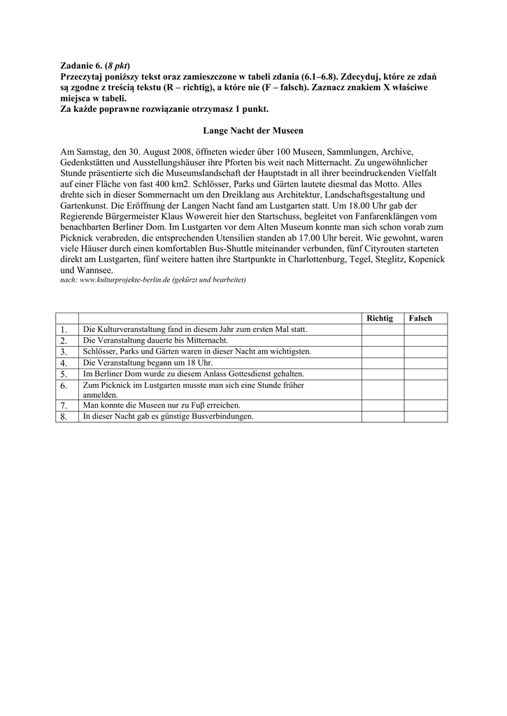 Zadanie 6. (8 pkt) Przeczytaj poniższy tekst oraz zamieszczone w tabeli zdania (6.1–6.8). Zdecyduj, które ze zdań są zgodne z treścią tekstu (R – richtig), a które nie (F – falsch). Zaznacz znakiem X właściwe miejsca w tabeli. Za każde poprawne rozwiązanie otrzymasz 1 punkt. Lange Nacht der Museen Am Samstag, den 30. August 2008, öffneten wieder űber 100 Museen, Sammlungen, Archive, Gedenkstätten und Ausstellungshäuser ihre Pforten bis weit nach Mitternacht. Zu ungewöhnlicher Stunde präsentierte sich die Museumslandschaft der Hauptstadt in all ihrer beeindruckenden Vielfalt auf einer Fläche von fast 400 km2. Schlösser, Parks und Gärten lautete diesmal das Motto. Alles drehte sich in dieser Sommernacht um den Dreiklang aus Architektur, Landschaftsgestaltung und Gartenkunst. Die Eröffnung der Langen Nacht fand am Lustgarten statt. Um 18.00 Uhr gab der Regierende Bűrgermeister Klaus Wowereit hier den Startschuss, begleitet von Fanfarenklängen vom benachbarten Berliner Dom. Im Lustgarten vor dem Alten Museum konnte man sich schon vorab zum Picknick verabreden, die entsprechenden Utensilien standen ab 17.00 Uhr bereit. Wie gewohnt, waren viele Häuser durch einen komfortablen Bus-Shuttle miteinander verbunden, fűnf Cityrouten starteten direkt am Lustgarten, fűnf weitere hatten ihre Startpunkte in Charlottenburg, Tegel, Steglitz, Kopenick und Wannsee. nach: www.kulturprojekte-berlin.de (gekűrzt und bearbeitet) Richtig 1. 2. 3. 4. 5. 6. 7. 8. Die Kulturveranstaltung fand in diesem Jahr zum ersten Mal statt. Die Veranstaltung dauerte bis Mitternacht. Schlösser, Parks und Gärten waren in dieser Nacht am wichtigsten. Die Veranstaltung begann um 18 Uhr. Im Berliner Dom wurde zu diesem Anlass Gottesdienst gehalten. Zum Picknick im Lustgarten musste man sich eine Stunde frűher anmelden. Man konnte die Museen nur zu Fuβ erreichen. In dieser Nacht gab es gűnstige Busverbindungen. Falsch