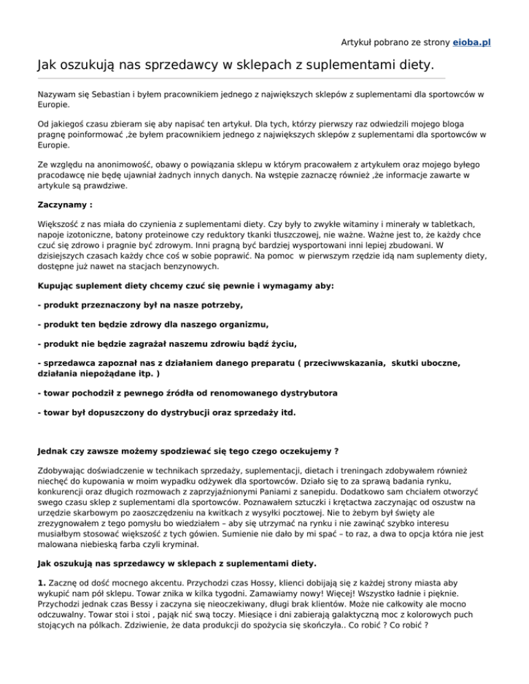 Artykuł pobrano ze strony eioba.pl Jak oszukują nas sprzedawcy w sklepach z suplementami diety. Nazywam się Sebastian i byłem pracownikiem jednego z największych sklepów z suplementami dla sportowców w Europie. Od jakiegoś czasu zbieram się aby napisać ten artykuł. Dla tych, którzy pierwszy raz odwiedzili mojego bloga pragnę poinformować ,że byłem pracownikiem jednego z największych sklepów z suplementami dla sportowców w Europie. Ze względu na anonimowość, obawy o powiązania sklepu w którym pracowałem z artykułem oraz mojego byłego pracodawcę nie będę ujawniał żadnych innych danych. Na wstępie zaznaczę również ,że informacje zawarte w artykule są prawdziwe. Zaczynamy : Większość z nas miała do czynienia z suplementami diety. Czy były to zwykłe witaminy i minerały w tabletkach, napoje izotoniczne, batony proteinowe czy reduktory tkanki tłuszczowej, nie ważne. Ważne jest to, że każdy chce czuć się zdrowo i pragnie być zdrowym. Inni pragną być bardziej wysportowani inni lepiej zbudowani. W dzisiejszych czasach każdy chce coś w sobie poprawić. Na pomoc w pierwszym rzędzie idą nam suplementy diety, dostępne już nawet na stacjach benzynowych. Kupując suplement diety chcemy czuć się pewnie i wymagamy aby: - produkt przeznaczony był na nasze potrzeby, - produkt ten będzie zdrowy dla naszego organizmu, - produkt nie będzie zagrażał naszemu zdrowiu bądź życiu, - sprzedawca zapoznał nas z działaniem danego preparatu ( przeciwwskazania, skutki uboczne, działania niepożądane itp. ) - towar pochodził z pewnego źródła od renomowanego dystrybutora - towar był dopuszczony do dystrybucji oraz sprzedaży itd. Jednak czy zawsze możemy spodziewać się tego czego oczekujemy ? Zdobywając doświadczenie w technikach sprzedaży, suplementacji, dietach i treningach zdobywałem również niechęć do kupowania w moim wypadku odżywek dla sportowców. Działo się to za sprawą badania rynku, konkurencji oraz długich rozmowach z zaprzyjaźnionymi Paniami z sanepidu. Dodatkowo sam chciałem otworzyć swego czasu sklep z suplementami dla sportowców. Poznawałem sztuczki i krętactwa zaczynając od oszustw na urzędzie skarbowym po zaoszczędzeniu na kwitkach z wysyłki pocztowej. Nie to żebym był święty ale zrezygnowałem z tego pomysłu bo wiedziałem – aby się utrzymać na rynku i nie zawinąć szybko interesu musiałbym stosować większość z tych gówien. Sumienie nie dało by mi spać – to raz, a dwa to opcja która nie jest malowana niebieską farba czyli kryminał. Jak oszukują nas sprzedawcy w sklepach z suplementami diety. 1. Zacznę od dość mocnego akcentu. Przychodzi czas Hossy, klienci dobijają się z każdej strony miasta aby wykupić nam pół sklepu. Towar znika w kilka tygodni. Zamawiamy nowy! Więcej! Wszystko ładnie i pięknie. Przychodzi jednak czas Bessy i zaczyna się nieoczekiwany, długi brak klientów. Może nie całkowity ale mocno odczuwalny. Towar stoi i stoi , pająk nić swą toczy. Miesiące i dni zabierają galaktyczną moc z kolorowych puch stojących na pólkach. Zdziwienie, że data produkcji do spożycia się skończyła.. Co robić ? Co robić ? Z pomocą nadchodzi bawełniany wacik oraz zmywacz do paznokci ! Opcjonalnie szmatka czy patyczek do nosa. Sztuczka bardzo prosta, mało kto patrzy na datę spożycia produktu, ok ,w dzisiejszych czasach coraz więcej ludzi. A co powiedzie na następną sztuczkę ? Drukowanie własnych naklejek z nową datą produkcji i naklejanie ich na produkt ? Widziałem na własne oczy nawet hologramy zamawiane na polskim serwisie ogłoszeniowym… RADA : Zawsze zwracaj uwagę na datę spożycia produktu i nie daj się oszukać. Najczęściej daty te drukowane są na wieczku oraz na denku. Często również na zaokrąglonej części preparatu. W razie wątpliwości zapytaj sprzedawcę o dokładna datę kiedy należy spożyć preparat. Jeśli będzie kręcił albo wyczujesz coś nie tak, radzę opuścić ten sklep. 2. Rzecz się dzieję w tym samym sklepie ( przykładowy sklep pod artykuł – wyimaginowany. Przykład autentyczny. ) Preparaty straciły potencjał a teraz w modzie fast foody. Trzeba coś wymyślić aby zapłacić chociaż za lokal. Pomysłowy przedsiębiorca postanawia sam wyprodukować preparat. Piwnicę przekształca w laboratorium niczym z kreskówki i tajemniczą alchemią traktuje wszystkie składniki pozyskane w internecie. Efekt ? Na półkę sklepową trafiają najbardziej chwalone i najmocniejsze preparaty prosto z USA ! Pomijamy oczywiście etymologię składników oraz kilka dorodnych samic z rodziny szczurowatych pasących się w przydomowej piwniczce. RADA : Proszę was nie dajcie się oszukać takiemu sprzedawcy. Wystarczy spojrzeć na opakowanie. Firmy produkujące suplementy diety dysponują ogromnym kapitałem dodatkowo wizerunek firmy odbija się w wizerunku produktu. Im ładniejsze opakowanie tym lepsza sprzedaż. Nie muszę chyba tłumaczyć dlaczego unikać takich preparatów ? Strzeżcie się tego typu preparatów na pólkach : 3. Już mi się nie chce dawać tych durnych wstępów bo być może nikogo to nie obchodzi. Jeśli przychodzisz do sklepu po jeden konkretny preparat, który polecił Ci kolega z klubu czy przeczytałeś o nim w internecie – kup tylko ten preparat i uciekaj ze sklepu ! dlaczego ? w skrócie : Wielu sprzedawców jest świetnie wyszkolonych w kwestii sprzedaży do tego stopnia, że uwierzcie mi, pomimo twardej psychiki wielu poległo i wychodziło z kilkoma preparatami. Przypomniała mi się historia z mojego sklepu jak były szef tak zmanipulował klienta, że ten zrobił zakupy na grubo ponad 2000zł ( nie jest to wcale wygórowana kwota, powiem raczej średniak), po 10 min wrócił i wrzeszczał dlaczego wcisnęliśmy mu tyle rzeczy jak on chciał tylko białko.. Prawdziwe.. 4. 99 % produktów na wysokości Twojego wzroku to produkty z kończącą się datą produkcji do spożycia bąd