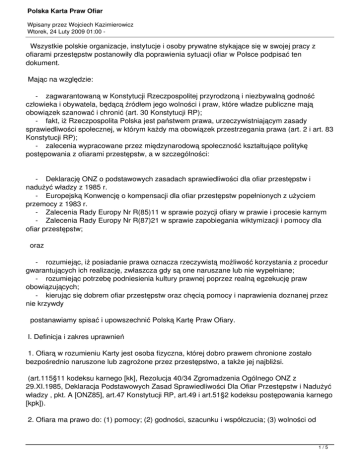 Polska Karta Praw Ofiar Wpisany przez Wojciech Kazimierowicz Wtorek, 24 Luty 2009 01:00 - Wszystkie polskie organizacje, instytucje i osoby prywatne stykające się w swojej pracy z ofiarami przestępstw postanowiły dla poprawienia sytuacji ofiar w Polsce podpisać ten dokument. Mając na względzie: - zagwarantowaną w Konstytucji Rzeczpospolitej przyrodzoną i niezbywalną godność człowieka i obywatela, będącą źródłem jego wolności i praw, które władze publiczne mają obowiązek szanować i chronić (art. 30 Konstytucji RP); - fakt, iż Rzeczpospolita Polska jest państwem prawa, urzeczywistniającym zasady sprawiedliwości społecznej, w którym każdy ma obowiązek przestrzegania prawa (art. 2 i art. 83 Konstytucji RP); - zalecenia wypracowane przez międzynarodową społeczność kształtujące politykę postępowania z ofiarami przestępstw, a w szczególności: - Deklarację ONZ o podstawowych zasadach sprawiedliwości dla ofiar przestępstw i nadużyć władzy z 1985 r. - Europejską Konwencję o kompensacji dla ofiar przestępstw popełnionych z użyciem przemocy z 1983 r. - Zalecenia Rady Europy Nr R(85)11 w sprawie pozycji ofiary w prawie i procesie karnym - Zalecenia Rady Europy Nr R(87)21 w sprawie zapobiegania wiktymizacji i pomocy dla ofiar przestępstw; oraz - rozumiejąc, iż posiadanie prawa oznacza rzeczywistą możliwość korzystania z procedur gwarantujących ich realizację, zwłaszcza gdy są one naruszane lub nie wypełniane; - rozumiejąc potrzebę podniesienia kultury prawnej poprzez realną egzekucję praw obowiązujących; - kierując się dobrem ofiar przestępstw oraz chęcią pomocy i naprawienia doznanej przez nie krzywdy postanawiamy spisać i upowszechnić Polską Kartę Praw Ofiary. I. Definicja i zakres uprawnień 1. Ofiarą w rozumieniu Karty jest osoba fizyczna, której dobro prawem chronione zostało bezpośrednio naruszone lub zagrożone przez przestępstwo, a także jej najbliżsi. (art.115§11 kodeksu karnego [kk], Rezolucja 40/34 Zgromadzenia Ogólnego ONZ z 29.XI.1985, Deklaracja Podstawowych Zasad Sprawiedliwości Dla Ofiar Przestępstw i Nadużyć władzy , pkt. A [ONZ85], art.47 Konstytucji RP, art.49 i art.51§2 kodeksu postępowania karnego [kpk]). 2. Ofiara ma prawo do: (1) pomocy; (2) godności, szacunku i współczucia; (3) wolności od 1/5 Polska Karta Praw Ofiar Wpisany przez Wojciech Kazimierowicz Wtorek, 24 Luty 2009 01:00 - wtórnej wiktymizacji; (4) dostępu do wymiaru sprawiedliwości; (5) mediacji i pojednania ze sprawcą; (6) do restytucji i kompensacji. (ONZ 85, Art.2 Konstytucji RP, Art.2§1 kpk) 3. Ofiara niezależnie od tego, czy ujawniony został sprawca przestępstwa i czy ma miejsce postępowanie karne (kiedy ofiara uzyskuje status pokrzywdzonego), bądź cywilne (kiedy ofiara uzyskuje status poszkodowanego) oraz niezależnie od więzi rodzinnej łączącej sprawcę i ofiarę winna uzyskać potrzebną jej pomoc prawną, materialną, medyczną, psychologiczną i socjalną. (art.2, art.31 pkt.1,2; art.32 Konstytucji RP, art.2§1 pkt3 kodeksu postępowania karnego [kpk], art.49§1 kpk). II. Prawo do godności, szacunku i współczucia. 4. Ofiara ma prawo do traktowania jej z godnością, szacunkiem i współczuciem. Do szczególnego przestrzegania tego prawa zobowiązani są przedstawiciele wymiaru sprawiedliwości, służby zdrowia i służb socjalnych. (art.47 Konstytucji RP, art.1 ust.2 oraz art.14.3 Ustawy o Policji z 1990 r., Deklaracja o Policji, przyjęta w 1979 r. przez Radę Europy oraz Kodeks ONZ postępowania funkcjonariuszy porządku prawnego (Rezolucja nr 34/169 Zgromadzenia Ogólnego ONZ z 17 XII 1979 r.), art.30 Ustawy o zawodzie lekarza w zw. z art.12 i art.13 Kodeksu etyki lekarskiej z 1993 r, art.8 kodeksu postępowania administracyjnego z 1960 r [kpa]). 5. Nie można przerzucać odpowiedzialności za przestępstwo ze sprawcy na ofiarę. Nie można usprawiedliwiać przestępstwa tradycją, kulturą, stereotypami minimalizującymi winę sprawcy. III. Prawo do bezpieczeństwa i zakaz ponownego dręczenia ofiary 6. Ofiara ma prawo do bezpieczeństwa i ochrony oraz poszanowania jej życia rodzinnego i prywatnego. Ofiary nie wolno ponownie dręczyć - należy dołożyć wszelkich starań, by uniknęła ona powtórnej wiktymizacji. Oznacza to zakaz wkraczania w prywatność ofiary i jej rodziny ze strony wszystkich, którzy stykają się z nią w związku z popełnionym przestępstwem, w szczególności: przedstawicieli organów państwowych, służb medycznych i socjalnych, mediów. (art.8 Konwencji o ochronie praw człowieka i podstawowych wolności z 1950 r [KE], art.191§3, 20 kpk). 7. Ofiara ma prawo do traktowania ze szczególną troską i powagą przez organy wymiaru sprawiedliwości i organy ścigania. Postępowanie w sprawie powinno być prowadzone tak, by uwzględniać interesy i stan ofiary. Jej przesłuchania winny być: ograniczone do minimum, prowadzone w sposób kulturalny, wolne od opóźnień, odwołań i zmuszania ofiary do wielokrotnego przeżywania na nowo tragedii jakiej doświadczyła. (art.30 Konstytucji RP, art. 231 kk) 8. Ofiara ma prawo do bezpieczeństwa osobistego, a obowiązkiem Policji i prokuratury jest jej to bezpieczeństwo zapewnić. (art.14.3 i 15.1 pkt 3 Ustawy o Policji, art. 231§1 kk). 2/5 Polska Karta Praw Ofiar Wpisany przez Wojciech Kazimierowicz Wtorek, 24 Luty 2009 01:00 - 9. Ofiara może zażądać utajnienia swoich danych osobowych. (art.184 kpk). 10. Ofiara ma prawo domagać się zastrzeżenia danych dotyczących jej miejsca zamieszkania do wyłącznej wiadomości prokuratora lub sądu. (art.191§3 kpk) 11. Ofiara ma prawo do zachowania anonimowości w sprawozdaniach prasowych, telewizyjnych, w internecie i w innych mediach, dotyczących jej sprawy. (art.13 pkt.2 Ustawy Prawo prasowe) 12. Właściwe organy państwowe są zobowiązane do przyjęcia każdego zawiadomienia o przestępstwie zgłoszonego przez ofiarę i podjęcia odpowiedniej interwencji. D