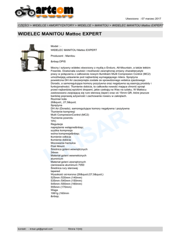 Utworzono : 07 marzec 2017 CZĘŚCI > WIDELCE I AMORTYZATORY > WIDELCE > MANITOU > WIDELEC MANITOU Mattoc EXPERT WIDELEC MANITOU Mattoc EXPERT Model : WIDELEC MANITOU Mattoc EXPERT Producent : Manitou OPIS Mocny i sztywny widelec stworzony z myślą o Enduro, All-Mountain, a także lekkim Freeride. Doskonała czułość i możliwość zewnętrznej zmiany charakterystyki pracy w połączeniu z całkowicie nowym tłumikiem Multi Compresion Control (MC2) umożliwijają ustawienie pod najbardziej wymagającego ridera. Sprężyna powietrzna DH Air zaczerpnięta została ze sprawdzonego widelca zjazdowego Dorado, a samoregulujące komory pozytywna oraz negatywna są esencją prostoty i funkcjonalności. Tłumienie dobicia, to całkowita nowość mająca chronić sprzęt przed najbardziej epickimi dropami, jakie czekają na Was na szlaku. W Mattocu zastosowano zwężającą się rure sterową (taper) oraz oś 15mm QR, które jeszcze bardziej poprawią sztywność i zachowanie roweru w zakrętach. Rozmiar koła 26", 27,5" Sprężyna DH Air (Dorado), samoregulujące komory negatywna i pozytywna Tłumienie kompresji Multi CompresionControl (MC2) Tłumienie powrotu TPC Regulacje naprężenie wstępne szybka kompresja wolna kompresja tłumienie odbicia tłumienie dobicia Mocowanie hamulca Post Mount Średnica goleni wewnętrznych 34mm Materiał goleni wewnetrznych aluminium Materiał goleni zewnętrznych cieniowane aluminium 7050 Średnica rury sterowej tapered Wysokość oś-korona (26"/27,5") 525mm /535mm (140mm) 535mm /545mm (150mm) 545mm /555mm (160mm) 555mm (170mm) Waga 1991g (160mm R A K kontakt : - [email protected] S I R Strona 1/{nb} Utworzono : 07 marzec 2017 CZĘŚCI > WIDELCE I AMORTYZATORY > WIDELCE > MANITOU > WIDELEC MANITOU Mattoc EXPERT WIDELEC MANITOU Mattoc EXPERT R A 26", 160mm, taper, czarny, oś QR15 27,5", 160mm, taper, czarny, oś QR15 S I R Cena : 2.649,00 PLN Brutto ( 2.153,66 PLN Netto) K Dostępność: Produkt dostępny w naszym sklepie od 31 styczeń 2015 kontakt : - [email protected] Strona 2/{nb}