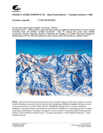 OFERTA FERII ZIMOWYCH – Hotel SantaMaria ***pokoje hotelowe +HB Termin wyjazdu: - 17.03-24.03.2012 W tym roku zapraszamy do doliny Val di Sole - Włochy. Już sama nazwa – „dolina słońca” daje nam dużą szansę na spędzenie udanych ferii. Na nasz wyjazd wybrałem mały ale urokliwy ośrodek narciarski – Pejo. W zasięgu ręki mamy duże ośrodki narciarskie: Tonale, Folgarida, Marilewa, Madonna di Campillo, czy Andalo. Dla osób szukających spokoju polecam Pejo, dla osób żądnych wrażeń i emocji safari narciarskie po „dolinie słońca”. PEJO - pierwsza historyczna stacja turystyczna w rejonie doliny Val di Sole, słynąca ze swych źródeł termalnych, posadowiona u stóp masywu alpejskiego Ortles Cevedale, którego szczyty wznoszą się ponad wysokość 3000 metrów. 16 km tras zjazdowych o różnych stopniach trudności z gwarantowanym zaśnieżeniem naturalnym, dodatkowo wspomaganym przez system sztucznego naśnieżania. Instalacje wyciągowe są nowoczesne i skutecznie pokrywają potrzeby rejonu (3 linie kolejek krzesełkowych, 2 wyciągi narciarskie, 1 linia kolejki kabinowej, 1 linia kolejki linowej). _________________________________________________________________________________________________________________ Ogorzałek Carving S’cool Tel. 602 255 706 43-300 Bielsko Biała e-mail : [email protected] ul. Piastowska 26/18 www.szkolacarvingu.pl Zapraszamy do Hotelu SantaMaria*** - usytuowany w cichej i słonecznej okolicy, zaledwie 300 m od wyciągów, niedaleko od źródeł termalnych i centrum miasta. Hotel ostatnio odnowiony, prowadzony przez zgraną rodzinę. Oferuje wysokiej jakości usługi. Pokoje są wygodne z możliwością dostosowania do własnych potrzeb. Każdy pokój posiada łazienkę z suszarką do włosów, TV, sejf Do dyspozycji gości stylowa restauracja, drink bar, sale do spotkań, czytelnia, Telewizja satelitarna oraz duży ekran, Internet, prywatny parking. 1. Termin wyjazdu: - 17.03-24.03.2012 2. Ilość dni pobytu: -6 3. Ilość noclegów: -7 4. Kraj : - Włochy 5. Miejscowość: - PEJO 6. - Hotel SantaMaria*** Hotel : Via dei Cavai 8 38024 Pejo Fonti (Trentino) www.hotelsantamaria.it tel: +39 0463 753 242 ITALIA a. Pokoje - 2-osobowe z możliwością 2 dostawek. 2 7. Koszt całkowity imprezy: a. Pokój 2-osobowy - 370 euro + 500 zł (osoba dorosła) b. Dla dzieci do 11 lat odpowiednie zniżki 8. Koszt zawiera: a. 7 x nocleg + wyżywienie HB b. Skipass – 6 dni Pejo c. Szkolenie carvingowe – 6 dni d. Ubezpieczenie PZU Turystyczne z opcją narciarską 9. Koszt nie zawiera: - dojazdu - napoje do kolacji dodatkowo płatne Dla stałych uczestników wyjazdów (2 lub więcej wyjazdów) – rabat 100 ZŁ Rozrywka po nartach: • Lodowisko • • • Pejo Fonti. Czynne codziennie w godz. 10.00-12.00, 15.00-19.00, 20.30-23.00. Terme di Pejo Via delle Acque Acidule, 3, 38020 Pejo Fonti, tel. 0463.753.226, fax 0364.743.207. Zabiegi kosmetyczne, masaże, terapie oraz leczenie schorzeń dróg oddechowych, skórnych, układu trawiennego etc Centro salute Basen (dorośli 7 EUR/dzieci 6 EUR), hydromasaż (dorośli 7 EUR/dzieci 6 EUR), siłownia (dorośli 7 EUR/dzieci 6 EUR) Centro benessere łaźnia turecka 7 EUR, hydromasaż 7 EUR PLAN DNIA 7.00 – powitanie słońca i ćwiczenia oddechowe 08.00 – 09.00 – śniadanie 10.00 – 15.00 – warsztaty na stoku 15.00 – 16.00 – kamera na stoku 16.00 – 17.00 – popołudniowa kawa lub herbata (pyszna przekąska) 17.00 - 18.30 – czas relaksu, body carving - ćwiczenia bazujące na jodze 18.30 – 19.30 - obiadokolacja 19.30 – …….. – video analiza, prezentacje, dyskusje… Udział we wszystkich zajęciach dozwolony – nieobowiązkowy Materiały szkoleniowe: www.szkolacarvingu.pl/technika SKIPOL – ciekawa maszynka do pracy nad techniką jazdy. 3