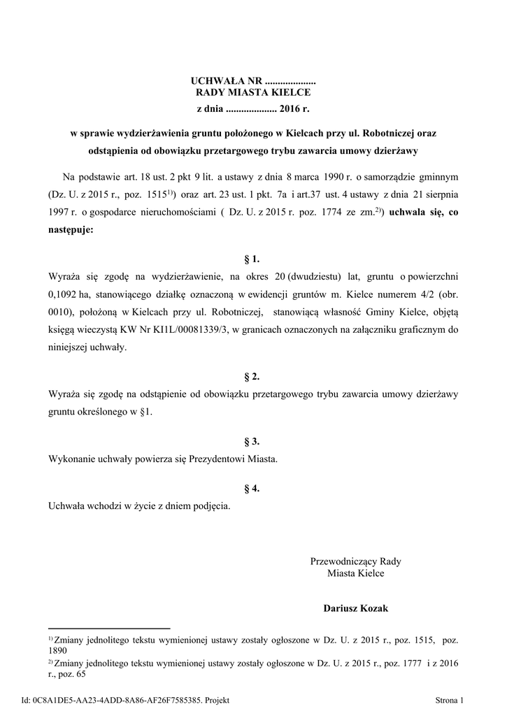 UCHWAŁA NR .................... RADY MIASTA KIELCE z dnia .................... 2016 r. w sprawie wydzierżawienia gruntu położonego w Kielcach przy ul. Robotniczej oraz odstąpienia od obowiązku przetargowego trybu zawarcia umowy dzierżawy Na podstawie art. 18 ust. 2 pkt 9 lit. a ustawy z dnia 8 marca 1990 r. o samorządzie gminnym (Dz. U. z 2015 r., poz. 15151)) oraz art. 23 ust. 1 pkt. 7a i art.37 ust. 4 ustawy z dnia 21 sierpnia 1997 r. o gospodarce nieruchomościami ( Dz. U. z 2015 r. poz. 1774 ze zm.2)) uchwala się, co następuje: § 1. Wyraża się zgodę na wydzierżawienie, na okres 20 (dwudziestu) lat, gruntu o powierzchni 0,1092 ha, stanowiącego działkę oznaczoną w ewidencji gruntów m. Kielce numerem 4/2 (obr. 0010), położoną w Kielcach przy ul. Robotniczej, stanowiącą własność Gminy Kielce, objętą księgą wieczystą KW Nr KI1L/00081339/3, w granicach oznaczonych na załączniku graficznym do niniejszej uchwały. § 2. Wyraża się zgodę na odstąpienie od obowiązku przetargowego trybu zawarcia umowy dzierżawy gruntu określonego w §1. § 3. Wykonanie uchwały powierza się Prezydentowi Miasta. § 4. Uchwała wchodzi w życie z dniem podjęcia. Przewodniczący Rady Miasta Kielce Dariusz Kozak Zmiany jednolitego tekstu wymienionej ustawy zostały ogłoszone w Dz. U. z 2015 r., poz. 1515, poz. 1890 2) Zmiany jednolitego tekstu wymienionej ustawy zostały ogłoszone w Dz. U. z 2015 r., poz. 1777 i z 2016 r., poz. 65 1) Id: 0C8A1DE5-AA23-4ADD-8A86-AF26F7585385. Projekt Strona 1 Uzasadnienie Działka położona w Kielcach przy ul. Robotniczej, objęta księgą wieczystą KW Nr KI1L/00081339/3, oznaczona w ewidencji gruntów m. Kielce nr 4/2 (obr. 0010), stanowi własność Gminy Kielce. W dniu 25 stycznia 2016 roku do Prezydenta Miasta Kielce, wpłynął wniosek osoby prawnej, w sprawie wydzierżawienia gruntu o powierzchni 1092 m², stanowiącego w/w działkę , położonego przy ul. Robotniczej w Kielcach, z przeznaczeniem pod miejsca postojowe (pow. 500 m²), drogę dojazdową (pow. 50 m²), zieleń (pow. 50 m²) oraz plac manewrowy (pow. 492 m²), na okres 20 lat. Przedmiotowy teren od strony wschodniej, przylega bezpośrednio do działek ozn. numerami 64/27 i 7/2 (obr. 0010), będących w użytkowaniu wieczystym wnioskodawcy, na której planuje on wybudować budynek usługowo – handlowy. Zgodnie z art. 18 ust. 2 pkt 9 lit. a ustawy z dnia 8 marca 1990 r. o samorządzie gminnym (Dz. U. z 2013 r., poz. 594 ze zm.) do wyłącznej właściwości rady gminy należy podejmowanie uchwał w sprawach majątkowych gminy, przekraczających zakres zwykłego zarządu, w tym dotyczących zasad wydzierżawiania na czas oznaczony dłuższy niż 3 lata lub na czas nieoznaczony. Natomiast w myśl art. 37 ust. 4 ustawy z dnia 21 sierpnia 1997 r. o gospodarce nieruchomościami (jednolity tekst z 2015 r. poz. 782 ze zm.) zawarcie umów dzierżawy gruntów stanowiących zasób gminy, na czas dłuższy niż 3 lata, następuje w drodze przetargu, przy czym rada miasta może wyrazić zgodę na odstąpienie od obowiązku przetargowego trybu zawarcia tych umów. W związku z powyższym, proponuje się podjęcie niniejszej uchwały. Id: 0C8A1DE5-AA23-4ADD-8A86-AF26F7585385. Projekt Strona 2 ZAŁĄCZNIK GRAFICZNY DO UCHWAŁY RADY MIASTA KIELCE NR .................../2016 Z DNIA ....................2016 R. w sprawie wydzierżawienia gruntu położonego przy ul. Robotniczej (dz. nr 4/2 obr. 0010 ) Skala 1 : 500 Id: 0C8A1DE5-AA23-4ADD-8A86-AF26F7585385. Projekt Strona 3 Id: 0C8A1DE5-AA23-4ADD-8A86-AF26F7585385. Projekt Strona 4