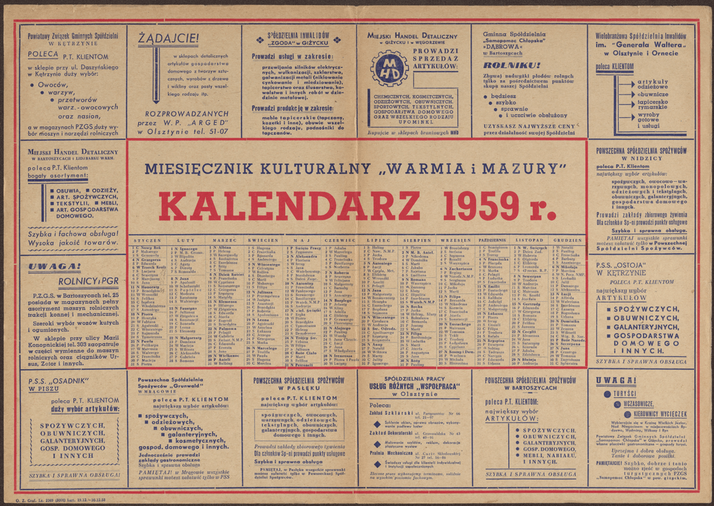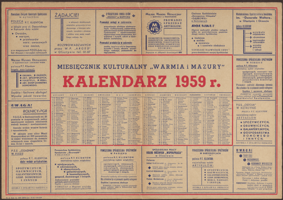 W . SPÓŁDZIELNIA IN W A L ID Ó W ŻĄDAJCIE! Powiatowy Związek Gminnych Spółdzielni KĘTRZYNIE POLE£A P.T. KLIENTOM w sklepie przy ul. Daszyńskiego w Kętrzynie duży wybór: w sk le p a c h O w o c ów , • w a r z yw , • kiego itp. rodzaju nasion, przez H D andel w W . P. „ ARG Olsztynie tel. m eble t a p i c e r s k i e (tapczany, kozetki i inne), obuwie w s z e l kiego rodzaju, podnośniki do tap czan ów . E D" 51-0 7 D G m inna Spółdzielnia e t a l ic z n y Wielobranżowa S p ó ł d z i e l n i a Inwalidów „Samopomoc Chłopska" PROWADZI SPRZEDAŻ ARTYKUŁÓW: »DĄBROWA « im. "Generała W altera» w B a rto szy cach w Olsztynie i Ornecie poleca KLIENTOM R O L /W IR C /! Z byw aj n a d w y ż k i p ł o d ó w r o ln y c h ty lk o za p o ś r e d n i c t w e m p u n k tó w sk upu n a szej S p ó ł d z i e ln i UPOMINKI. K u p u jcie w sk lep a ch bran żow y ch artykuły odzieżowe obuwnicze ► łapicersko rym arskie ► wyroby gotowe i usługi ► • będziesz • szybko • spraw nie • i uczciw ie obsłużony CHEMICZNYCH, KOSMETCZNYCH, ODZIEŻOWYCH. OBUWNICZYCH. SPORTOWYCH, T E K S T Y L N Y C H , GOSPODARSTWA D O M O W E G O O R A Z W S Z E L K I E G O RO DZAJU Prowadzi produkcję w zakresie: ROZPROWADZANYCH a w magazynach PZGS.duży wy bór moszyn i narzędzi rolniczych iejsk i pasty w s z e l przetworów w a r z , - owoc owych oraz M i wikliny o r a z H andel ie j s k i w G IŻ Y C K U f w W Ę G O R Z E W IE przewijania silników elektrycz nych, wulkanizacji, szklarsłw a, galw an izacji metali (niklowanie cynkowanie i m iedziowanie), tapicerstwo oraz ślusarstwa, ko walstw a i innych robót w d z ie dzinie metalowej. z t w o r z y w sztu cz nyc h, w y r o b ó w z d r z e w a • M Prowadzi usługi w z a k re s ie : d e t al ic zn yc h a rt yk uł ów g o s p o d a r s t w a domowego * „ZGODA" w GIŻYCKU UZYSKASZ NAJW YŻSZE CENY ^ p rzez d z ia ł a ln o ś ć s w o je j S p ó łd z i e ln i MHD POWSZECHNA SPÓŁDZIELNIA SPOŻYWCOW eta lic z n y W NIDZICY W BARTOSZYCACH i LIDZBARKU WARM. MIESIĘCZNIK KULTURALNY „ W A R M I A i M A Z U R Y p o leca P.T. Klientom bogaty asortyment: ■ ■ ■ ■ OBUWIA, ■ ODZIEZY, ART. SPOŻYWCZYCH, TEKSTYLII, ■ MEBLI, ART. GOSPODARSTWA DOMOWEGO. ## KALENDARZ 1959 r. S z y b k a i f a ch o wa o b s ł u g a ! Wysoka jakość u w a g a towarów. : R O LN / c y ' PGR P.Z.G.S. w Bartoszycach tel. 25 p o siad a w m ag azy n ach pełny asortym ent m aszyn rolniczych trakcji konnej i m echanicznej. Szeroki wybór wozów kutych i ogumionych. W sklepie przy ulicy Marii Konopnickiej tel. 303 zaopatruje w części w ym ienne do m aszyn rolniczych oraz ciągników Ur sus, Zetor i innych. P.S.S. „ O S A D N I K " w PI SZU poleca P.T. KLIENTOM duży wybór a rty k u łó w -. | SPOŻYWCZYCH, OBUWNICZYCH, GALANTERYJNYCH, GOSP. DOM OW EGO I INNYCH STYCZEŃ 1 2 3 4 5 6 7 8 9 10 11 12 13 14 15 16 17 18 19 20 21 22 23 24 25 26 27 28 29 30 31 LUTY C N o w y Rok 1 N Ignacego P M akarego 2 P M. B. G rom u. S G enow efy 3 W H ip o lita Ń G rzegorza 4 S A ndrzeja P Edw arda 5 C Agaty W T rzech K róli 6 P D oroty Ś Lucjana 7 S R om ualda C Sew eryna 8 N Ja n a P M arcjanny 9 P A polonii S J a n a _____ • Ń H on ora ty ^ j 10 W S cholastyki 11 S P o p i e l e c P B enedykta 12 C M odesta W W eroniki 13 P K atarzyny S F eliksa 14 S W alen teg o C Izydora P W łodzim ierza 15 N F au styna S A ntoniego 16 P Ju lian n y IN P iotra 17 W Zbigniew a P H enryka 18 S K onstancji W F abiana 19 C K onrada S A gnieszki 20 P Leona C W incentego 21 S Eleonory P R ajm unda S Tym oteusza 22 N M a łgorzaty Ń P a w ła 23 P D am iana P P olikarp a 24 W M acieja W M ateusza 25 S W ik to ra Ś W alereg o 26 C A leksandra C F ranciszka 27 P G ab riela P M acieja 28 S R om ana S P iotra MARZEC 1 Ń A lb in a 2 P H eleny 3 W K unegundy 4 S K azim ierza 5 C Euzebiusza 6 P Róży 7 S T om asza 8 Ń D zie ń K ob iet 9 P F ranciszka 10 W C y p rian a 11 Ś K onstantego 12 C G rzegorza 13 P Krystyny 14 S M atyldy 15 Ń K lem en sa 16 P H ilareg o 17 W Z b ig n iew a 18 S E dw arda 19 C Józefa 20 P Eugenii 21 S Benedykta 22 N P a lm o w a 23 P P elag ii 24 W G ab riela 25 Ś Z w iast. N.M.P. 26 C Edm unda 27 P E rnesta 28 S Jan a_________ 2 9 .Ń W ie lk a n o c 30 P A n ie li 31 W B albiny P ow szechna Spółdzielnia Spożyw ców „ Grunwald*' W MRĄGOWIE Z. Graf. Lz. 2369 (5000) kart. 1 9 .1 2 .-3 0 .1 2 .5 8 MAJ 1 S H ugona 2 c F ranciszka 3 p R yszarda 4 s A m brożego 5 Ń W in c e n te g o 6 p C elestyna / W R ufina 8 Ś D ionizego 9 C Marii 10 P M akarego U s F ilip a 12 IN J u liu sza 13 P Przem ysław a 14 W Ju sty n a 15 S A nastazji 16 c B enedykta 17 p R oberta 18 s A poloniusza 19 Ń L eona 20 p Agnieszki 2) W Anzelma 22 S Łukasza 23 c Jerzego 24 p G rzegorza 25 s M arka 26 27 28 29 30 Ń p W S c M arceleg o T eo fila P aw ła H ugona M arcina 1 2 3 4 5 6 7 8 9 10 11 12 13 14 15 16 P S N P W S C P S IN P W Ś C P S Ś w ię to Pracy Zygm unta___ A lek sa n d ra F lo rian a Ireny J an a W n iebow stąp. S tan isław a D zień Zmyć. A n to n in y Franciszka Pankracego S erw acego B onifacego W n ieb .N .M .P . A n drzeja__ __ 17 N 4 lei. Ś w iątk i 18 19 20 21 22 23 24 25 26 27 28 29 30 31 Eryka Piotra B enedykta Tym oteusza H eleny D ezyd e rc o o__ i T ró jc y Ś w . ] U rbana F ilip a Ju liu sza B oże C ia ło Marl i Feliksa _____ P e tr o n e li P W Ś C P S N P W » C P S N C Z E R W IE C 1 2 3 4 5 6 P W $ C P S 7 8 9 10 11 12 13 14 15 16 17 18 19 Ń P W S C P S N P W $ C P 20 S 21 Ń 22 23 24 25 26 27 28 29 30 P W Ś C P S Ń P W 1 2 3 4 5 6 7 R oberta 8 Sew eryna 9 F elicjan a 10 M ałgorzaty 11 Barnaby 12 J an a 13 A ntoniego 14 B a zy leg o 15 Jo lan ty 16 Aliny 17 A dolfa 18 Elżbiety 19 G erw azego 20 Florentyny 21 A lo jzeg o 22 Pauliny 23 W andy 24 Ja n a Chrzcie. 25 Łucji 26 Jan a 27 W ład y sław a 28 Iren eu sza 29 P io tra i Pawia 30 Lucyny , 31 Jakuba M arcelego Pauliny F ranciszka B onifacego N o rb erta POWSZ
