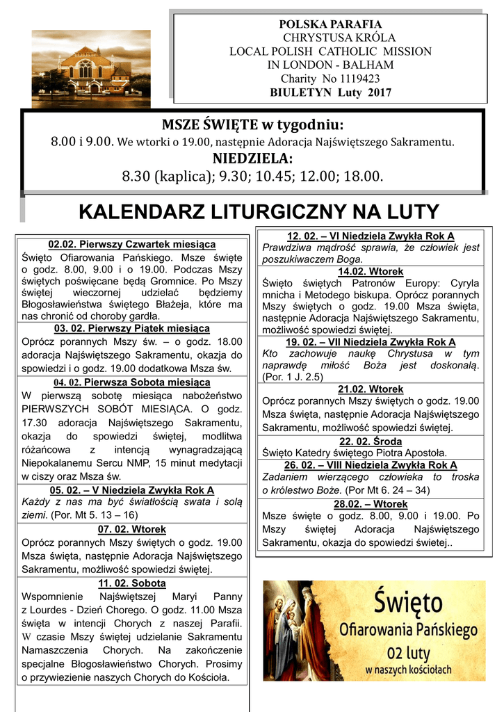 POLSKA PARAFIA CHRYSTUSA KRÓLA LOCAL POLISH CATHOLIC MISSION IN LONDON - BALHAM Charity No 1119423 BIULETYN Luty 2017 MSZE ŚWIĘTE w tygodniu: 8.00 i 9.00. We wtorki o 19.00, następnie Adoracja Najświętszego Sakramentu. NIEDZIELA: 8.30 (kaplica); 9.30; 10.45; 12.00; 18.00. KALENDARZ LITURGICZNY NA LUTY 02.02. Pierwszy Czwartek miesiąca Święto Ofiarowania Pańskiego. Msze święte o godz. 8.00, 9.00 i o 19.00. Podczas Mszy świętych poświęcane będą Gromnice. Po Mszy świętej wieczornej udzielać będziemy Błogosławieństwa świętego Błażeja, które ma nas chronić od choroby gardła. 03. 02. Pierwszy Piątek miesiąca Oprócz porannych Mszy św. – o godz. 18.00 adoracja Najświętszego Sakramentu, okazja do spowiedzi i o godz. 19.00 dodatkowa Msza św. 04. 02. Pierwsza Sobota miesiąca W pierwszą sobotę miesiąca nabożeństwo PIERWSZYCH SOBÓT MIESIĄCA. O godz. 17.30 adoracja Najświętszego Sakramentu, okazja do spowiedzi świętej, modlitwa różańcowa z intencją wynagradzającą Niepokalanemu Sercu NMP, 15 minut medytacji w ciszy oraz Msza św. 05. 02. – V Niedziela Zwykła Rok A Każdy z nas ma być światłością swata i solą ziemi. (Por. Mt 5. 13 – 16) 07. 02. Wtorek Oprócz porannych Mszy świętych o godz. 19.00 Msza święta, następnie Adoracja Najświętszego Sakramentu, możliwość spowiedzi świętej. 11. 02. Sobota Wspomnienie Najświętszej Maryi Panny z Lourdes - Dzień Chorego. O godz. 11.00 Msza święta w intencji Chorych z naszej Parafii. W czasie Mszy świętej udzielanie Sakramentu Namaszczenia Chorych. Na zakończenie specjalne Błogosławieństwo Chorych. Prosimy o przywiezienie naszych Chorych do Kościoła. 12. 02. – VI Niedziela Zwykła Rok A Prawdziwa mądrość sprawia, że człowiek jest poszukiwaczem Boga. 14.02. Wtorek Święto świętych Patronów Europy: Cyryla mnicha i Metodego biskupa. Oprócz porannych Mszy świętych o godz. 19.00 Msza święta, następnie Adoracja Najświętszego Sakramentu, możliwość spowiedzi świętej. 19. 02. – VII Niedziela Zwykła Rok A Kto zachowuje naukę Chrystusa w tym naprawdę miłość Boża jest doskonalą. (Por. 1 J. 2.5) 21.02. Wtorek Oprócz porannych Mszy świętych o godz. 19.00 Msza święta, następnie Adoracja Najświętszego Sakramentu, możliwość spowiedzi świętej. 22. 02. Środa Święto Katedry świętego Piotra Apostoła. 26. 02. – VIII Niedziela Zwykła Rok A Zadaniem wierzącego człowieka to troska o królestwo Boże. (Por Mt 6. 24 – 34) 28.02. – Wtorek Msze święte o godz. 8.00, 9.00 i 19.00. Po Mszy świętej Adoracja Najświętszego Sakramentu, okazja do spowiedzi świetej.. KOMUNIKATY 1. KONFERENCJA APOSTOLSTWA ŚWIECKICH odbędzie się w dniu 04. 02. 2017 w Siedzibie Polskiej Misji Katolickiej na Devoni. Rozpoczęcie Konferencji o godz. 13.30. Wykład wprowadzający wygłosi Ks. Marian Łękawa, Rektor Polskiej Misji Katolickiej w Szkocji. Zapraszamy do udziału w Konferencji. 2. W dalszym ciągu przyjmujemy zgłoszenia na Wizytę Duszpasterską – Kolędę. Kartki zgłoszeniowe znajdują się w kruchcie Kościoła. Po wypełnieniu prosimy je oddać w zakrystii 3. Kolejne spotkanie kandydatów do bierzmowania 25 lutego 2017 o godz. 16.15 w kościele. W zakładce PRZYGOTOWANIA/BIERZMOWANIE znajduje się już konspekt naszego ostatniego spotkania (28.01). Bardzo proszę, o wydrukowanie tego konspektu i przepracowanie w domu do następnego spotkania. UWAGA: Konspekt ten zabieramy ze sobą na kolejne spotkanie do pracy w grupach. 4. Zachęcamy do włączenia się w akcję „Gift Aid Declaration”. 5. W dniach od 11 do 18 lutego Dziewczęca Służba Maryjna (tak zwane Maryjki) udają się wraz z Rodzicami, opiekunem muzycznym Panem Jakubem na pielgrzymkę do Rzymu. Opiekę duchową sprawował będzie ks. Waldemar. Polecajmy ich w naszych modlitwach. 6. Msza Święta dla dzieci pierwszokomunijnych z poświęceniem modlitewników, łańcuszka z medalikiem oraz różańca w niedzielę 19 lutego o godz. 14.30. 7. Osoby parkujące swe samochody przed naszym ośrodkiem, proszone są o wykupienie karty parkingowej w cenie £40. Kartę można wykupić u p. Waldemara Michalskiego w ośrodku parafialnym w biurze na pierwszym piętrze Parkowanie bez ważnej karty = mandat w wysokości £120. ŻYCIE KONSEKROWANE „Ludzie świeccy ze względu na świecką naturę swego powołania odzwierciedlają tajemnicę Wcielonego Słowa przede wszystkim jako Tego, który jest Alfą i Omegą świata, podstawą i miarą wartości wszystkich rzeczy stworzonych. Z kolei ci, którzy otrzymali święcenia, są żywymi wizerunkami Chrystusa Głowy i Pasterza, prowadzącego swój lud, który wędruje przez rzeczywistość doczesną, pomiędzy „już” a „jeszcze nie”, w oczekiwaniu na Jego przyjście w chwale. Życie konsekrowane nie polega jedynie na naśladowaniu Chrystusa całym sercem, na miłowaniu Go "bardziej niż ojca i matkę, bardziej niż syna i córkę" - tego bowiem wymaga się od każdego ucznia; polega natomiast na przeżywaniu i wyrażaniu swej konsekracji przez poddanie Chrystusowi całej egzystencji, które "upodabnia" do Niego, i przez totalny wysiłek, który zapowiada - na miarę osiągalną w doczesności i zgodnie z różnymi charyzmatami - eschatologiczną doskonałość. – Jan Paweł II. INTENCJE MODLITW NA MIESIĄC LUTY Intencja ogólna: Aby ludzie przeżywający próby, zwłaszcza ubodzy, uchodźcy i spychani na margines, spotykali się z przyjęciem i znajdowali wsparcie w naszych wspólnotach. Uwaga: to nie jest błąd, w tym roku mamy tylko jedną intencję papieską w każdym miesiącu, jeden miesiąc ewangelizacyjna, kolejny miesiąc - ogólna POLSKA WSPÓLNOTA KATOLICKA BALHAM – LONDYN 232/234 Balham High Road; SW17 7AW DUSZPASTERZE: PROBOSZCZ: Ks. Prałat Kanonik Władysław Wyszowadzki; WIKARIUSZ: Ks. Waldemar Haręza Phone: ks. Proboszcz: (020) 86725070; ks. Wikariusz: (020) 87670358 www.parafia-balham.co.uk; [email protected]