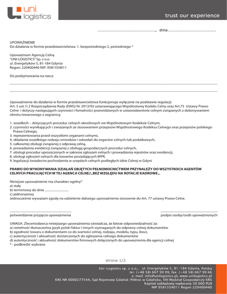 .........................................., dnia................................... UPOWAŻNIENIE Do działania w formie przedstawicielstwa: 1. bezpośredniego 2. pośredniego * Upoważniam Agencję Celną “UNI-LOGISTICS” Sp. z o.o. ul. Energetyków 5, 81-184 Gdynia Regon: 220400440 NIP: 9581554011 Do podejmowania na rzecz: ....................................................................................................................................................................................................................................................................... ....................................................................................................................................................................................................................................................................... Upoważnienie do działania w formie przedstawicielstwa funkcjonuje wyłącznie na podstawie regulacji: Art. 5 ust.1i 2 Rozporządzenia Rady (EWG) Nr 2913/92 ustanawiającego Wspólnotowy Kodeks Celny oraz Art.75 Ustawy Prawo Celne i dotyczy następująych czynności i fomalności przewidzianych w ustawodawstwie celnym związanych z dokonywaniem obrotu towarowego z zagranicą: 1. wszelkich – dotyczących procedur celnych określonych we Wspólnotowym Kodeksie Celnym, 2. czynności wynikających i zwiazanych ze stosowaniem przepisów Wspólnotowego Kodeksu Celnego oraz przepisów polskiego Prawa Celnego, 3. reprezentowania przed wszystkimi organami celnymi, 4. składania wszelkiego rodzaju wniosków i odwołań do organów celnych lub podatkowych, 5. całkowitej obsługi związanej z odprawą celną, 6. prowadzenia ewidencji związanej z obsługą gospodarczych procedur celnych, 7. obsługi procedur uproszczonych w zakresie zgłoszeń celnych i prowadzenia rejestrów oraz ewidencji, 8. obsługi zgłoszeń celnych dla towarów posiadających WPR, 9. legalizacji świadectw pochodzenia w urzędach celnych podległych Izbie Celnej w Gdyni PRAWO DO WYKONYWANIA DZIAŁAŃ OBJĘTYCH PEŁNOMOCNICTWEM PRZYNALEŻY DO WSZYSTKOCH AGENTÓW CELNYCH PRACUJĄCYCH W TEJ AGENCJI CELNEJ „BEZ WZGLĘDU NA ROTACJE KADROWE „ Niniejsze upoważnienie ma charakter ogólny* a) stały b) terminowy do dnia .............................. c) jednorazowy Jednocześnie wyważam zgodę na udzielenie dalszego upoważnienia stosownie do Art. 77 ustawy Prawo Celne. .............................................................................. potwierdzenie przyjęcia upoważnienia ........................................................................ podpis osoby/osób upoważnionych UWAGA. Zleceniodawca niniejszego upoważnienia oświadcza, że bierze odpowiedzialność za: a) rzetelność tłumaczeńna język polski faktur i innych wymaganych do odprawy celnej dokumentów b) zgodność towaru z dokumentami co do wartości celnej, rodzaju, modelu, typu, ilosci, c) autentyczność i aktualność dostarczonych do zgloszenia celnego dokumentów d) autentyczność i aktualność dokumentów firmowych dołączonych do upowaznienia dla agencji celnej * - podkreślić wybrane strona 1/2 .........................................., dnia................................... FORMULARZ DANYCH O FIRMIE STANOWIĄCY ZAŁĄCZNIK DO UPOWAŻNIENIA AGENCJI CELNEJ “UNI-LOGISTICS” Sp. z o. o. 1. Nazwa i adres firmy: ....................................................................................................................................................................................................................................................................... ....................................................................................................................................................................................................................................................................... ....................................................................................................................................................................................................................................................................... 2. Numer Regon: .......................................................................................................................... 3. Numer Eori: .............................................................................................................................. 4. Osoba odpowiedzialna za sprawy finansowe w firmie: Imie i Nazwisko: .......................................................................................................................... Telefon / Fax: .............................................................................................................................. 5. Firma jest płatnikiem podatku Vat : ..................................., nr NIP : ................................................................... 6. Bank i numer konta (pełna nazwa): ............................................................................................................................................................................................. ....................................................................................................................................................................................................................................................................... 7. Adres korespondencyjny : .............................................................................................................................................................................................................. ....................................................................................................................................................................................................................................................................... UWAGA! Oryginał upoważnienia podpisany przez osoby wymienione w rejestrze