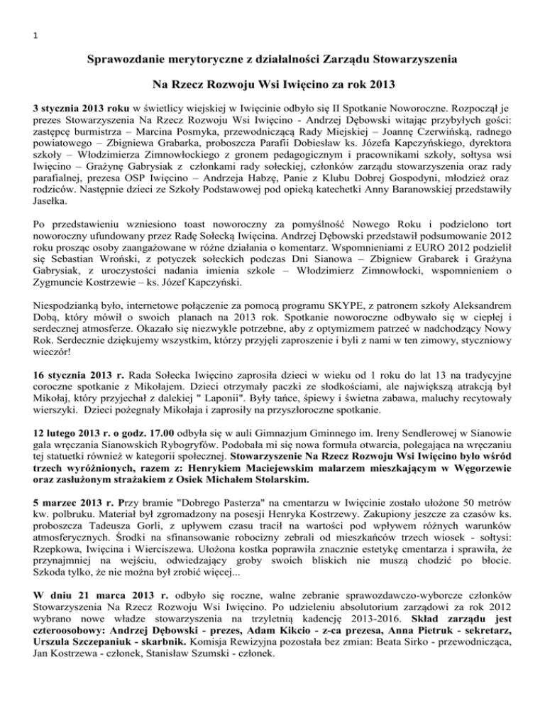 1 Sprawozdanie merytoryczne z działalności Zarządu Stowarzyszenia Na Rzecz Rozwoju Wsi Iwięcino za rok 2013 3 stycznia 2013 roku w świetlicy wiejskiej w Iwięcinie odbyło się II Spotkanie Noworoczne. Rozpoczął je prezes Stowarzyszenia Na Rzecz Rozwoju Wsi Iwięcino - Andrzej Dębowski witając przybyłych gości: zastępcę burmistrza – Marcina Posmyka, przewodniczącą Rady Miejskiej – Joannę Czerwińską, radnego powiatowego – Zbigniewa Grabarka, proboszcza Parafii Dobiesław ks. Józefa Kapczyńskiego, dyrektora szkoły – Włodzimierza Zimnowłockiego z gronem pedagogicznym i pracownikami szkoły, sołtysa wsi Iwięcino – Grażynę Gabrysiak z członkami rady sołeckiej, członków zarządu stowarzyszenia oraz rady parafialnej, prezesa OSP Iwięcino – Andrzeja Habzę, Panie z Klubu Dobrej Gospodyni, młodzież oraz rodziców. Następnie dzieci ze Szkoły Podstawowej pod opieką katechetki Anny Baranowskiej przedstawiły Jasełka. Po przedstawieniu wzniesiono toast noworoczny za pomyślność Nowego Roku i podzielono tort noworoczny ufundowany przez Radę Sołecką Iwięcina. Andrzej Dębowski przedstawił podsumowanie 2012 roku prosząc osoby zaangażowane w różne działania o komentarz. Wspomnieniami z EURO 2012 podzielił się Sebastian Wroński, z potyczek sołeckich podczas Dni Sianowa – Zbigniew Grabarek i Grażyna Gabrysiak, z uroczystości nadania imienia szkole – Włodzimierz Zimnowłocki, wspomnieniem o Zygmuncie Kostrzewie – ks. Józef Kapczyński. Niespodzianką było, internetowe połączenie za pomocą programu SKYPE, z patronem szkoły Aleksandrem Dobą, który mówił o swoich planach na 2013 rok. Spotkanie noworoczne odbywało się w ciepłej i serdecznej atmosferze. Okazało się niezwykle potrzebne, aby z optymizmem patrzeć w nadchodzący Nowy Rok. Serdecznie dziękujemy wszystkim, którzy przyjęli zaproszenie i byli z nami w ten zimowy, styczniowy wieczór! 16 stycznia 2013 r. Rada Sołecka Iwięcino zaprosiła dzieci w wieku od 1 roku do lat 13 na tradycyjne coroczne spotkanie z Mikołajem. Dzieci otrzymały paczki ze słodkościami, ale największą atrakcją był Mikołaj, który przyjechał z dalekiej " Laponii". Były tańce, śpiewy i świetna zabawa, maluchy recytowały wierszyki. Dzieci pożegnały Mikołaja i zaprosiły na przyszłoroczne spotkanie. 12 lutego 2013 r. o godz. 17.00 odbyła się w auli Gimnazjum Gminnego im. Ireny Sendlerowej w Sianowie gala wręczania Sianowskich Rybogryfów. Podobała mi się nowa formuła otwarcia, polegająca na wręczaniu tej statuetki również w kategorii społecznej. Stowarzyszenie Na Rzecz Rozwoju Wsi Iwięcino było wśród trzech wyróżnionych, razem z: Henrykiem Maciejewskim malarzem mieszkającym w Węgorzewie oraz zasłużonym strażakiem z Osiek Michałem Stolarskim. 5 marzec 2013 r. Przy bramie "Dobrego Pasterza" na cmentarzu w Iwięcinie zostało ułożone 50 metrów kw. polbruku. Materiał był zgromadzony na posesji Henryka Kostrzewy. Zakupiony jeszcze za czasów ks. proboszcza Tadeusza Gorli, z upływem czasu tracił na wartości pod wpływem różnych warunków atmosferycznych. Środki na sfinansowanie robocizny zebrali od mieszkańców trzech wiosek - sołtysi: Rzepkowa, Iwięcina i Wierciszewa. Ułożona kostka poprawiła znacznie estetykę cmentarza i sprawiła, że przynajmniej na wejściu, odwiedzający groby swoich bliskich nie muszą chodzić po błocie. Szkoda tylko, że nie można był zrobić więcej... W dniu 21 marca 2013 r. odbyło się roczne, walne zebranie sprawozdawczo-wyborcze członków Stowarzyszenia Na Rzecz Rozwoju Wsi Iwięcino. Po udzieleniu absolutorium zarządowi za rok 2012 wybrano nowe władze stowarzyszenia na trzyletnią kadencję 2013-2016. Skład zarządu jest czteroosobowy: Andrzej Dębowski - prezes, Adam Kikcio - z-ca prezesa, Anna Pietruk - sekretarz, Urszula Szczepaniuk - skarbnik. Komisja Rewizyjna pozostała bez zmian: Beata Sirko - przewodnicząca, Jan Kostrzewa - członek, Stanisław Szumski - członek. 2 6 maja 2013 r. W związku z kończącą się dwuletnią umową na prowadzenie Szkoły Podstawowej w Iwięcinie przez Włodzimierza Zimnowłockiego (z dniem 31 sierpnia 2013 r.), Zarząd Stowarzyszenia Na Rzecz Rozwoju Wsi Iwięcino podjął Uchwałę Nr 2/2013 ogłaszając nabór na stanowisko dyrektora Szkoły Podstawowej w Iwięcinie. Zaprosiliśmy do wzięcia udziału w procedurze naboru i złożenia stosownych dokumentów do dnia 27 maja 2013 r. 10 maja 2013 r. Nasz projekt umiejscowiony w Priorytecie 1 pn. "Pomorski Szlak Cysterski - Iwięcino, Wierciszewo, Dąbrowa" znalazł się pod względem punktacji na drugim miejscu otrzymując 209 pkt. na 210 pkt. max. Ocenę formalną przeszło w pierwszym priorytecie 1490 wniosków z czego dofinansowanie otrzymało tylko 157. Teraz, w drugim półroczu 2013 roku, mamy do wydania na realizację projektu 87380 zł, z czego 90 % (76 580 zł) pochodzi z dofinansowania. Dziękuję Tomkowi Tesmerowi za merytoryczne wsparcie przy składaniu wniosku. 5 czerwca 2013 r. Zakończył się nabór na stanowisko dyrektora Szkoły Podstawowej w Iwięcinie. Procedura naboru trwała ponad miesiąc. Wpłynęło 16 ofert z czego do drugiej tury - rozmowy kwalifikacyjnej zaproszono sześć osób spełniających kryteria formalne związane z naborem. 29 maja 2013 roku w świetlicy wiejskiej w Iwięcinie kandydaci odpowiadali na pytania oraz przedstawili swoje wizje rozwoju szkoły. Członkowie komisji w głosowaniu tajnym w dniu 2 czerwca 2013 r. nie dokonali wyboru dyrektora Szkoły Podstawowej w Iwięcinie z powodu otrzymania równej liczny głosów przez dwóch kandydatów. Zgodnie z regulaminem pracy jeżeli pierwsze głosowanie nie wyłoni kandydata przeprowadza się drugie głosowanie, po ponownej rozmowie z dwoma kandydatami, którzy otrzymali największą ilość głosów w pierwszym głosowaniu. Przewodniczący komisji Andrzej Dębowski zaprosił Tomasza Świderskiego oraz Włodzimierza Zimnowłoc